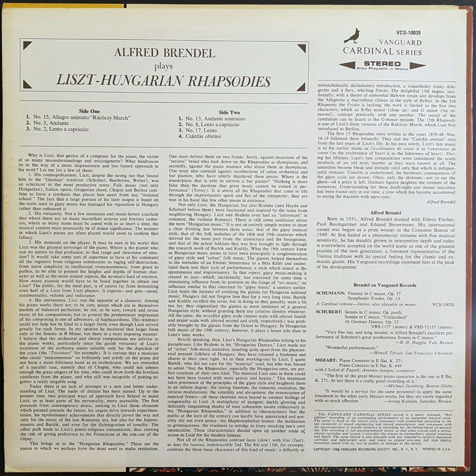 The cover for Alfred Brendel’s recording of Liszt’s Hungarian Rhapsodies combines a vivacious illustration of a folk dance with equally wild display typography. Weiss is paired with all-caps Crayonette and Saphir. The numbers of the included rhapsodies are set in yet another flamboyant face, Fontanesi. In sum, there’s too much going on. I feel the illustration could shine more with a less eclectic typography. While the cover art is by Frederic Marvin (1932–2013), the overall design is uncredited. It may have been provided by Vanguard’s art director, Jules Halfant.