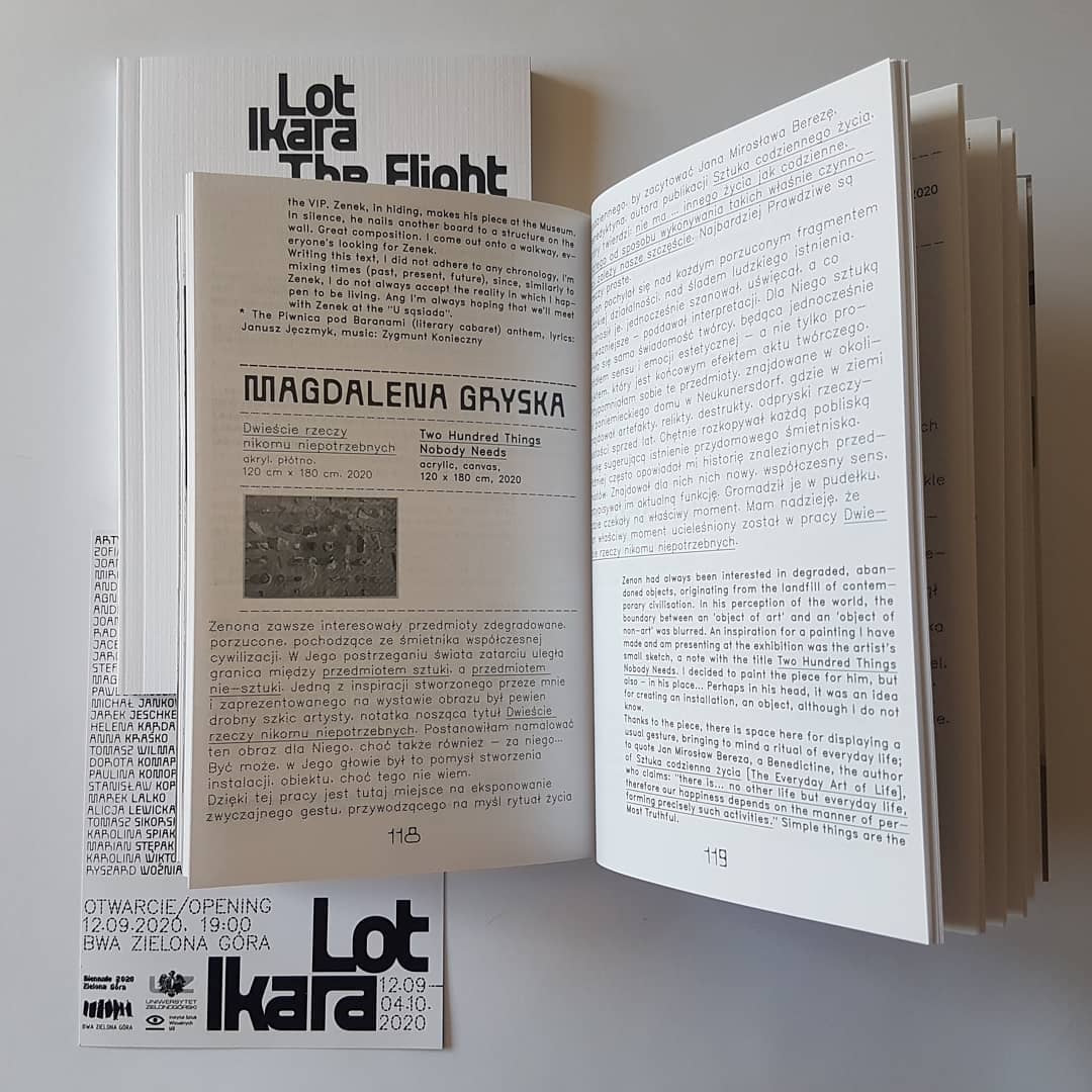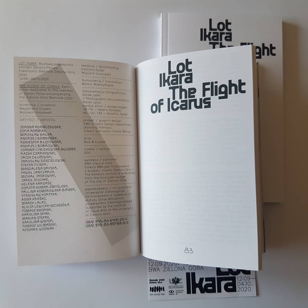 Lot Ikara / The flight of Icarus is an accompanying booklet, produced by the publishing houses of Zielona Góra Biennale. The catalog was designed by the DWA Graphic Design Department. Published by the BWA gallery in Zielona Góra, co-publisher of the University of Zielona Góra / Institute of Visual Arts.
