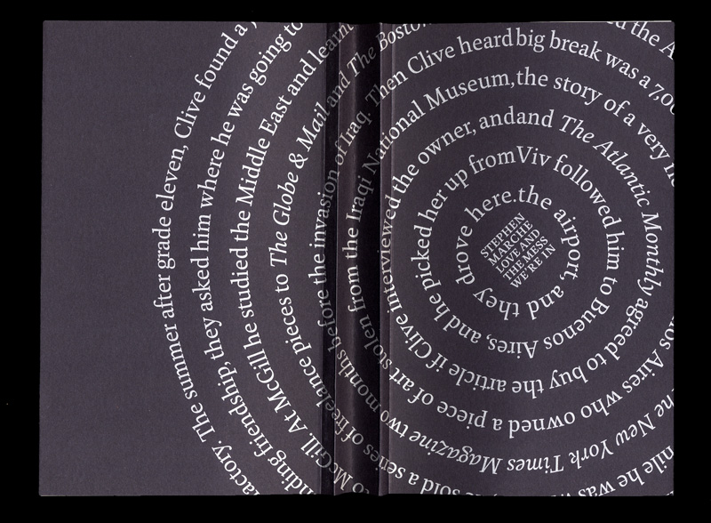The book Love and the Mess we’re in by Stephen Marche which was published by Gaspereau Press won the highest honour for book design in Canada, taking first place in the fiction category of the 2012 Alcuin Design Awards. It uses our typeface Huronia by the Canadian designer Ross Mills. As the publisher says: “… incredibly versatile and robust Huronia [that] carried this book through its many twists and turns, page after page”. Read more on the Gaspereau Press’ blog. In case you do not know them, in our humble opinion GP is one of the finest publishers you can find – solid craftsmanship!