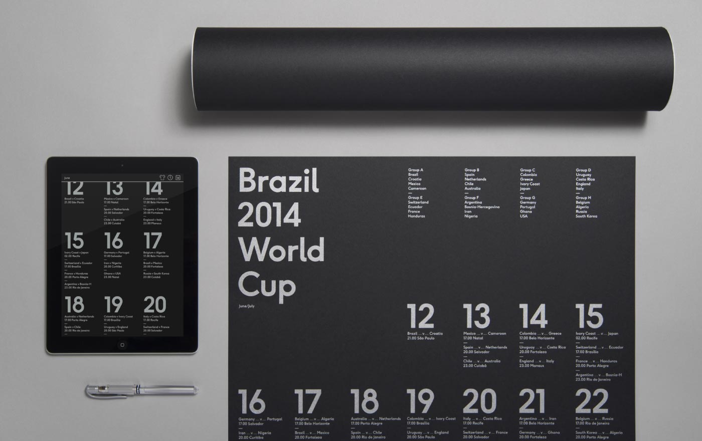 To mark the Brazil 2014 World Cup we created a limited edition wall chart and accompanying website. Each B2 poster was screen printed in silver onto Ebony Colorplan and supplied with a metallic pen, allowing fans to record the results. Our responsive website, which allowed users to customise the site in their team colours and to reflect their time zone, also featured a downloadable fixture list and was updated with results as the tournament progressed.