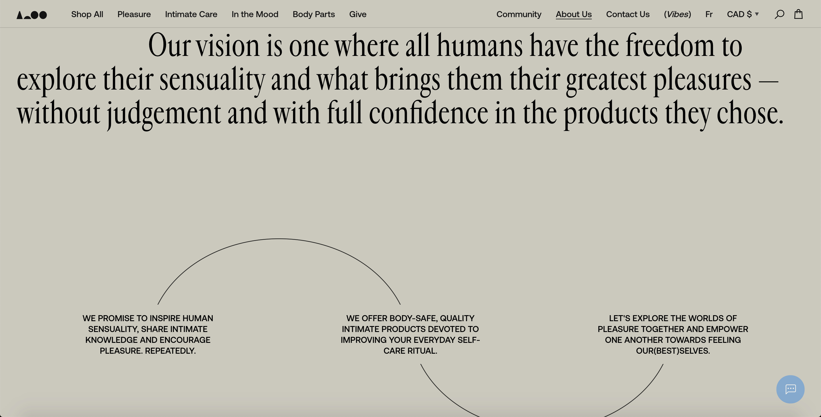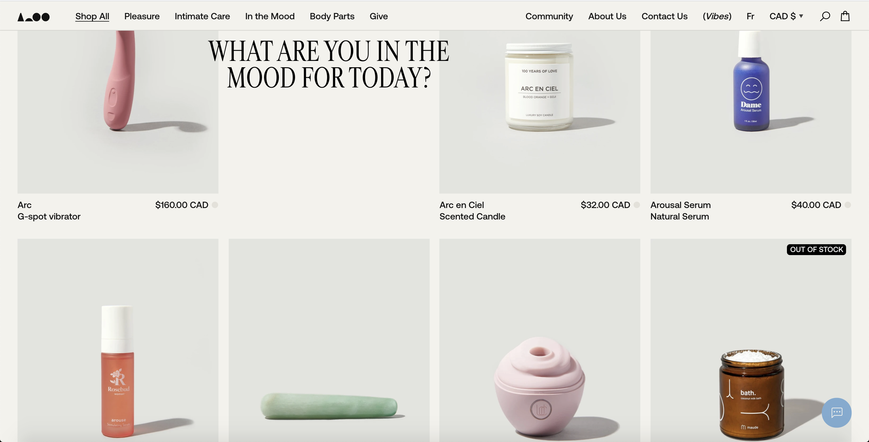 The design of the website was in the hands of Louis Paquet. He used soft pastel colors and beautiful nude pictures, mostly details of body parts. This smooth approach welcomes the user and conveys a feeling of familiarity as different body types are shown, as well as people in natural attitudes. The products are also photographed like cosmetics, so the website gives an overall feeling of self-care to the user, and is far from the pornographic imagery of sex shops, always evoking something forbidden. The website is set in Cardinal Fruit from Production Type and Aeonik from CoType Foundry. The serif is used in caps for titles and in mixed case for introductory texts: the sophistication of Cardinal Fruit works well with the products and with the theme of sexuality: its delicate design echoes floral patterns, and genitals have often been represented in the history of art in analogy to flowers (for example in Robert Mapplethorpe’s photographs). Aeonik adds a more “medical” voice, as all the products on the platform are chosen for their quality and hypoallergenic requirements.