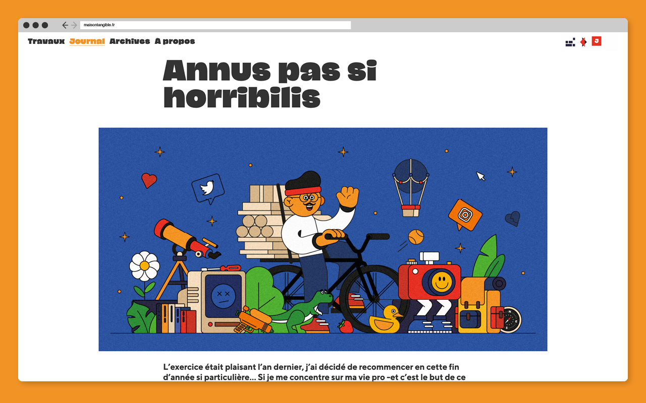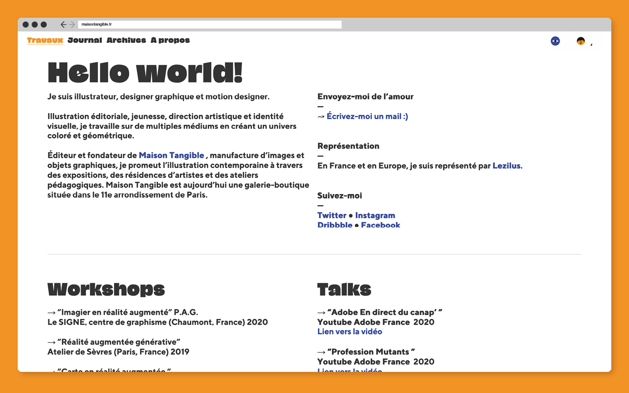 Parisian ilustrator and graphic designer Aurélien Jeanney consistently uses the couple NaN Jaune and TT Norms as the typefaces supporting his personal identity and the one of his gallery/art shop/publishing house Maison Tangible since 2018.