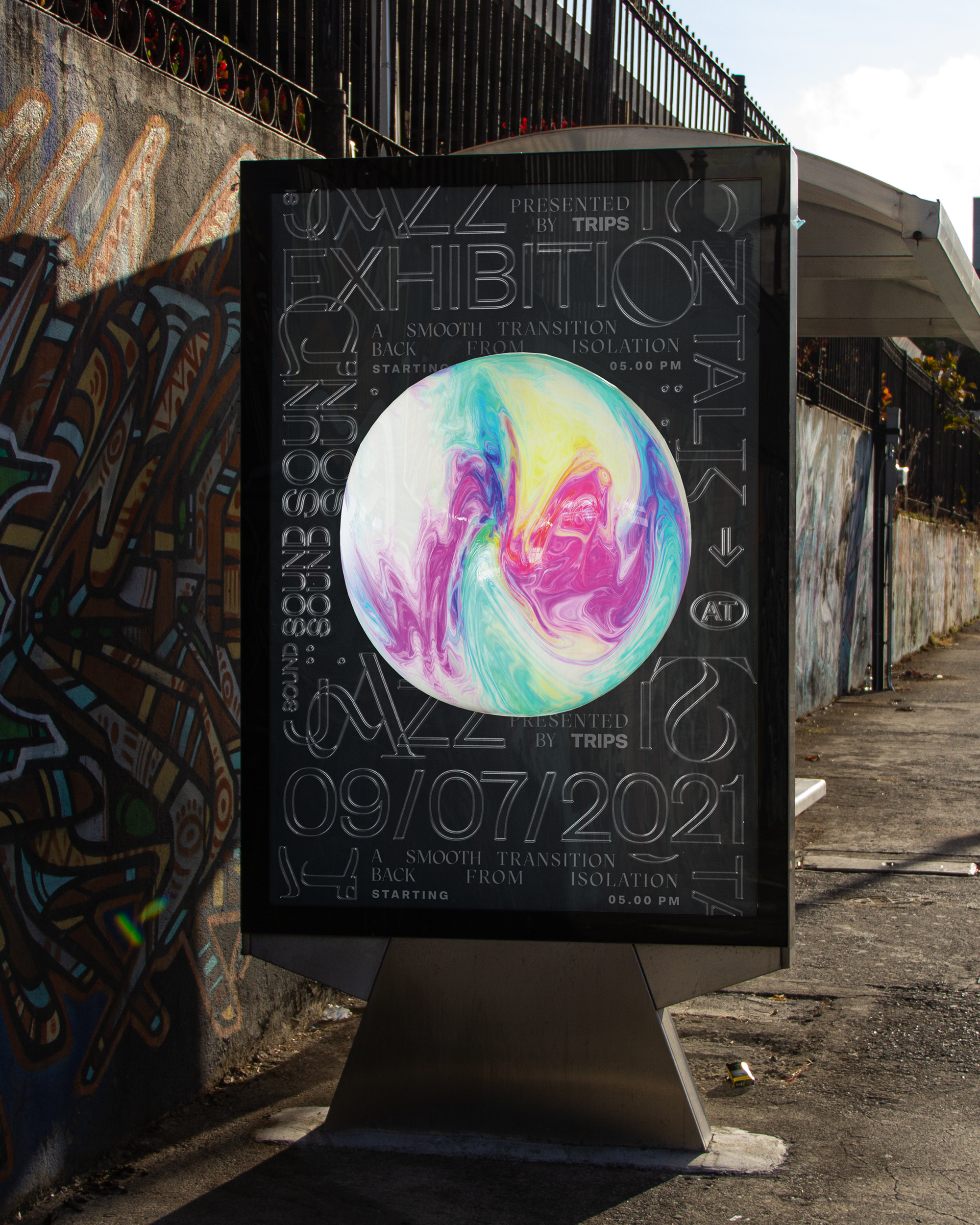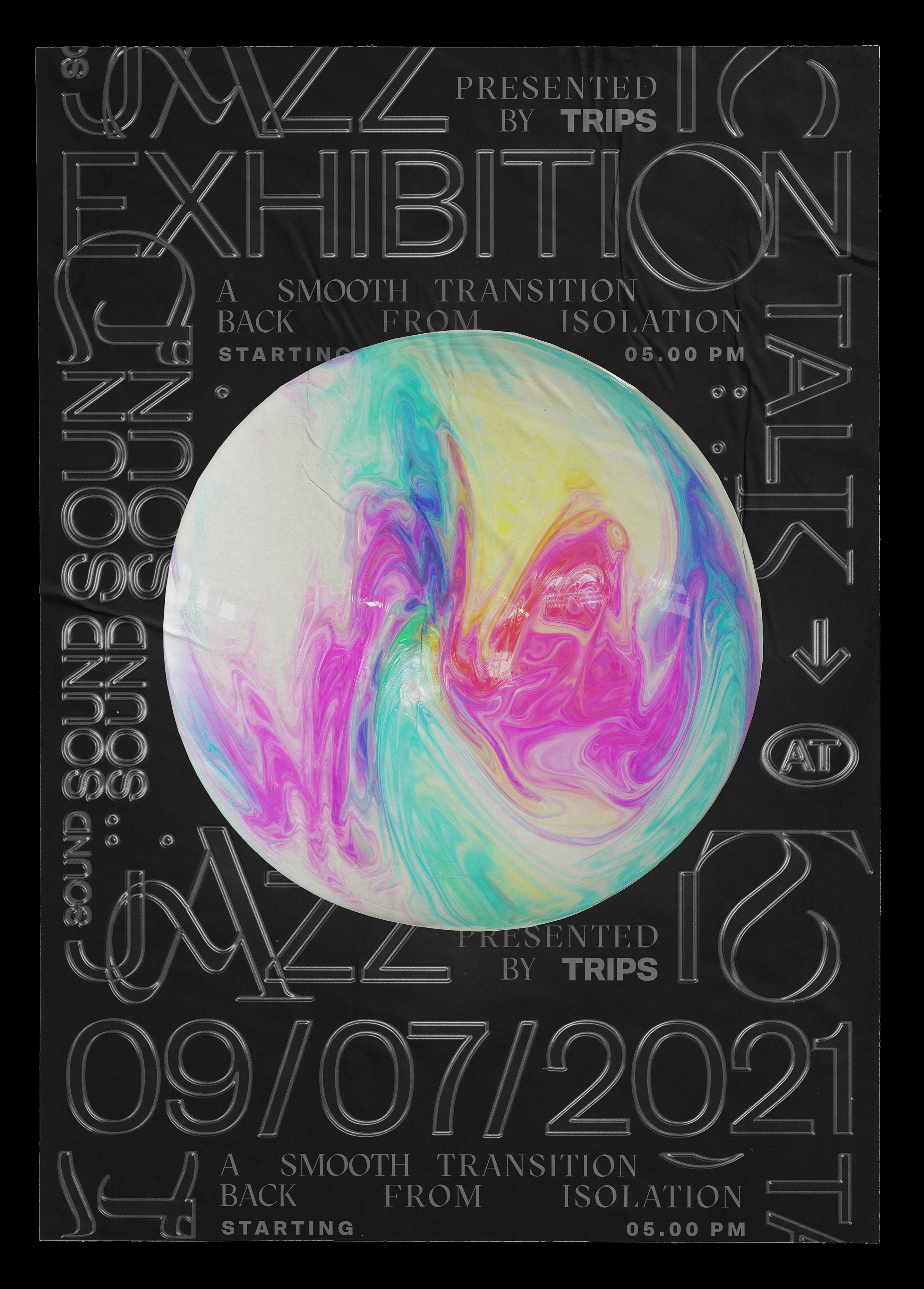 Poster and event identity for A Smooth Transition Back from Isolation, an event by the electronic music collective Trips at Jazzit Musik Club, Salzburg. For the first time the collective is combining a night of music and dancing with an art exhibition and a podium for talks. The poster was realized in collaboration with Lithuanian 3D artist Lukas Gecevičius (Aetherways).