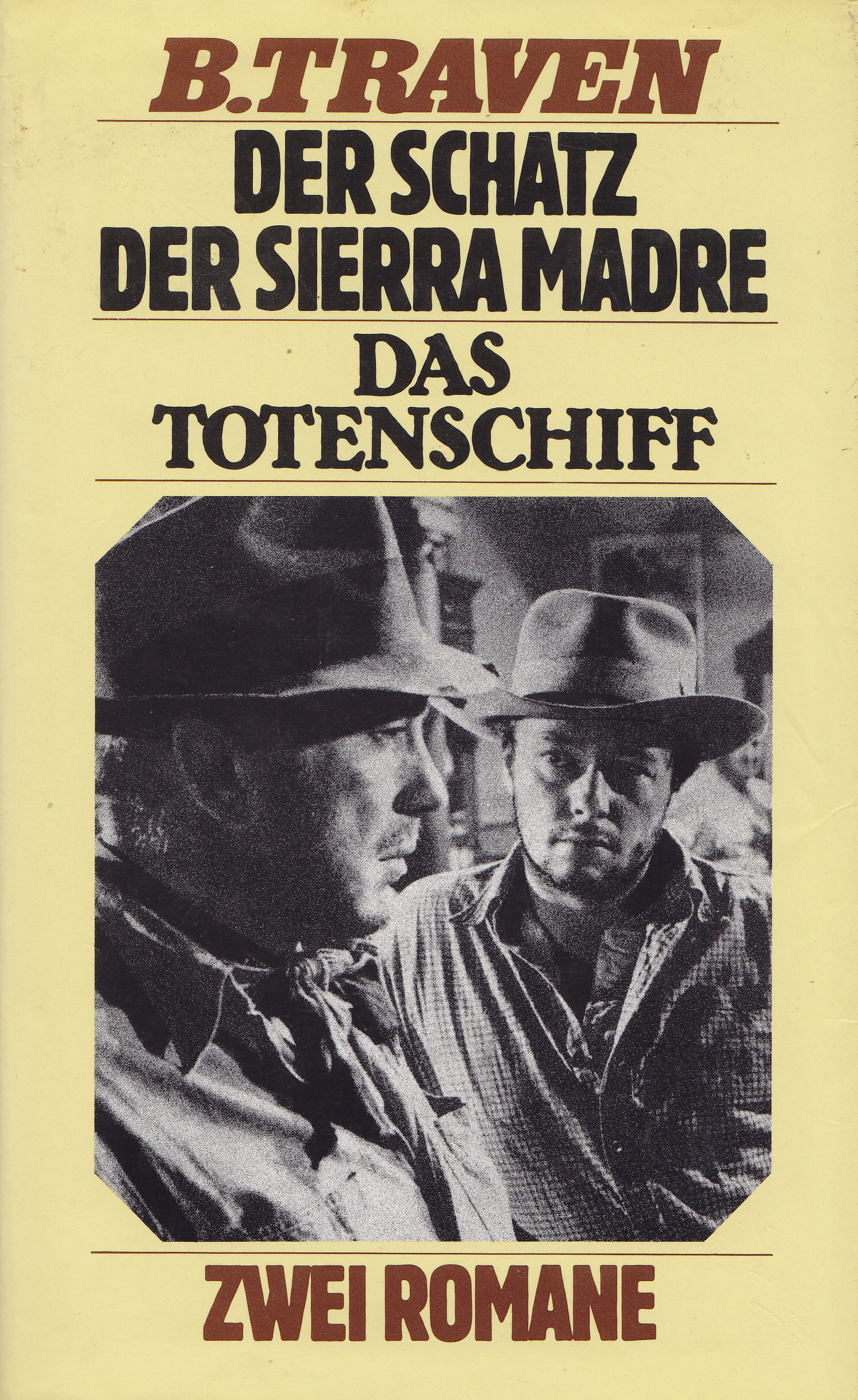 Dust jacket for a double edition with the two best-known novels by the mysterious B. Traven, published by by Bertelsmann Club around 1980, under license from Büchergilde Gutenberg. Das Totenschiff was first published in 1926 and, as The Death Ship, in English in 1934. Der Schatz der Sierra Madre (The Treasure of the Sierra Madre) followed a year later, in 1927 and 1935, respectively.