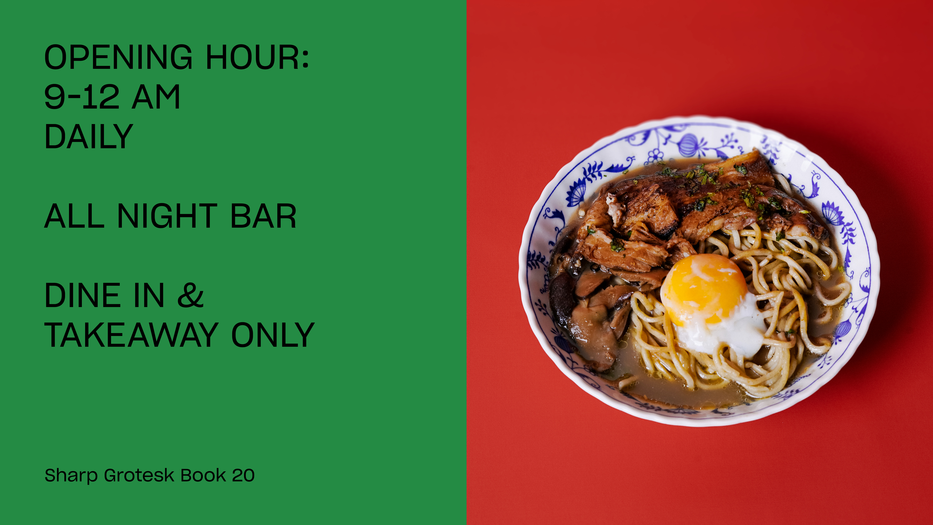 Sharp Grotesk is the main typeface, used in two weights. The logo uses Chiswick Sans.