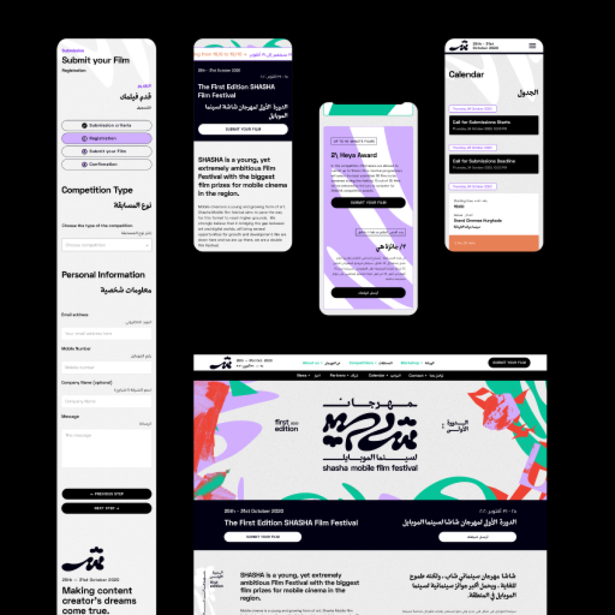 Our strategy for this project was to channel the innate rawness of filmmaking on a mobile phone into a visual identity and an iconic Arabic logo. So we went for a fresh, raw and flexible take on things through custom Arabic lettering, a candy palette, and heavy use of texture which was perfectly complemented by the heavily stylized Arabic typeface Dobb by Heheh type foundry, whose heavy weight provided the necessary contrast with our freeform elements and bright palette.