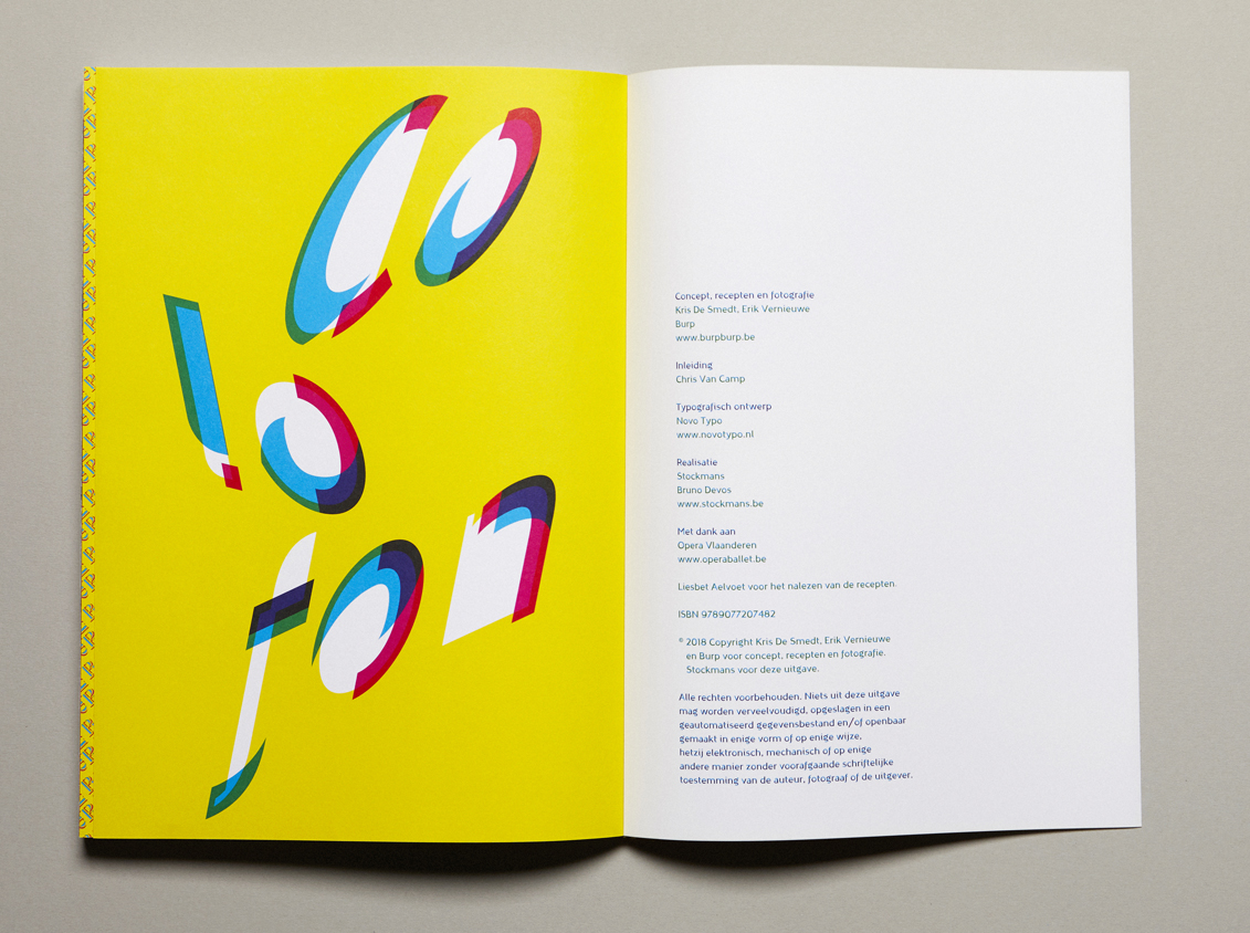 The book shows the use of multicolored typeface Ziza printed in 3colors; cyan, magenta, yellow. Commissioned by Opera Vlaanderen (Flemish Opera), Antwerp. Written by Erik Vernieuwe with photos by Kris de Smedt (BURP). Designed by Mark van Wageningen / Novo Typo. 96 pages, softcover, Japanese binding.