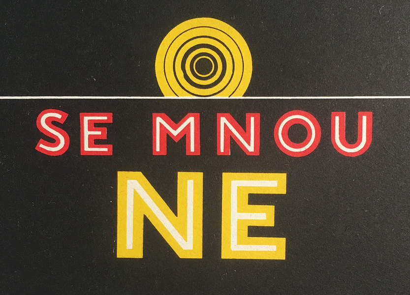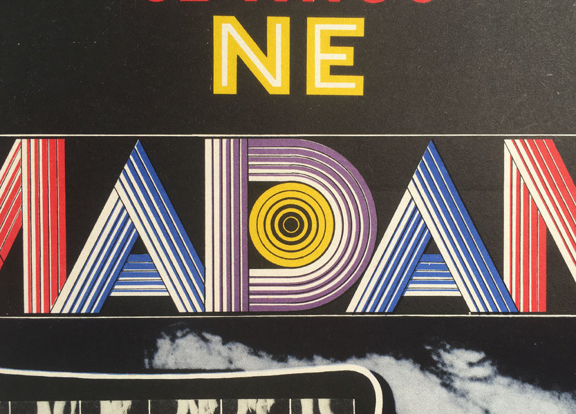 Designer Zdeněk Ziegler somehow got his hands on Or, a multiline typefaces designed by André Chante and released in 1969 by Hollenstein in Paris. Ziegler used it for “MADAM”, in alternating glyph colors. Apparently he didn’t like the original A with the flat top, and made his own form, taking cues from a flipped V.