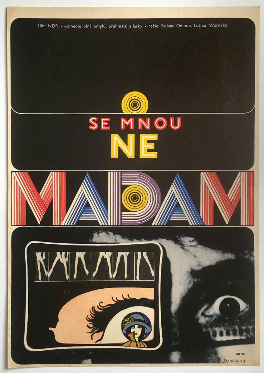Poster for the 1970 Czechoslovak release of Se mnou ne madam (original German title: Mit mir nicht, Madam!; English: Not With Me, Madam!), a 1969 DEFA film about mistaken identity, directed by Roland Oehme and Lothar Warneke and filmed in Yugoslavia.