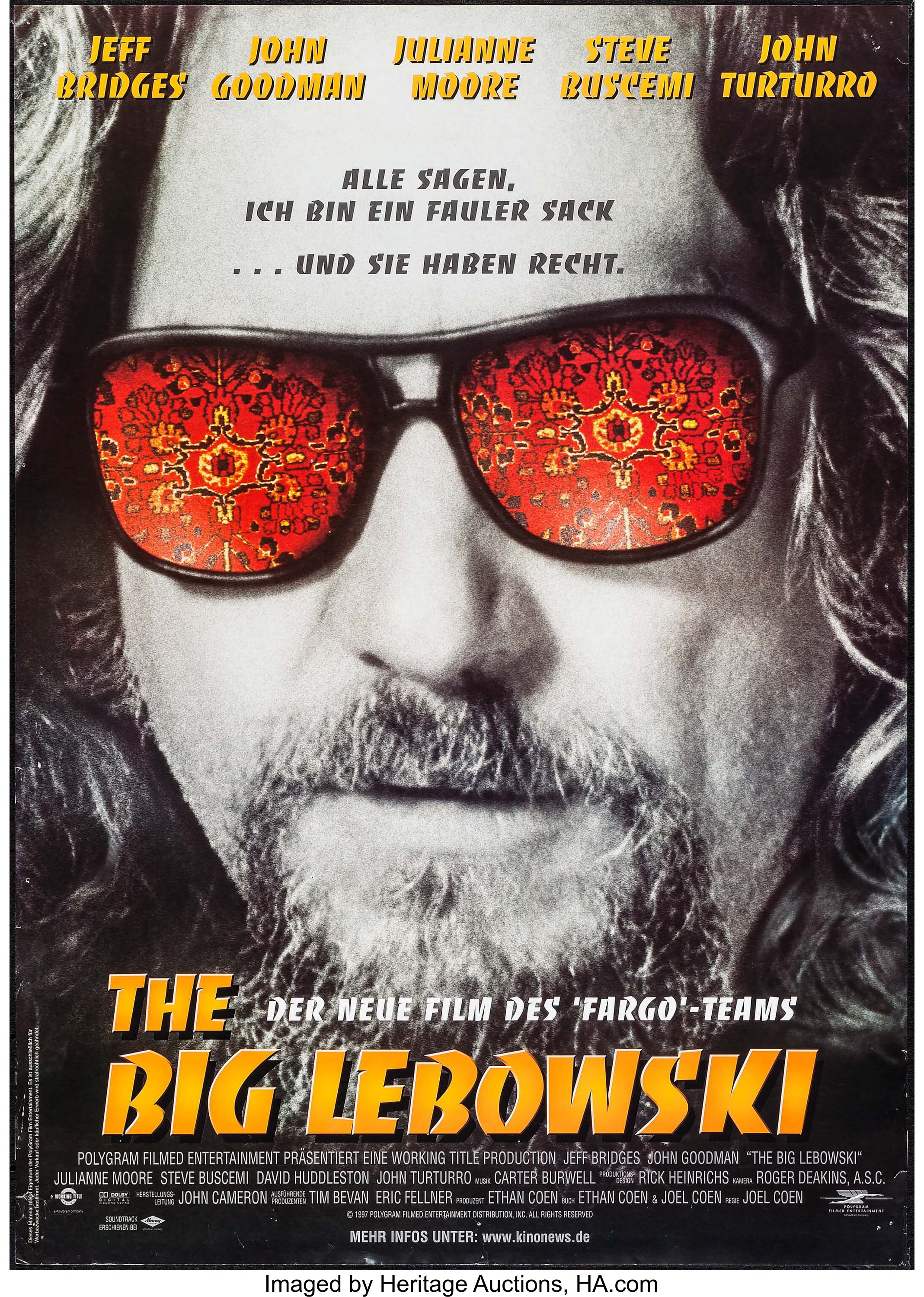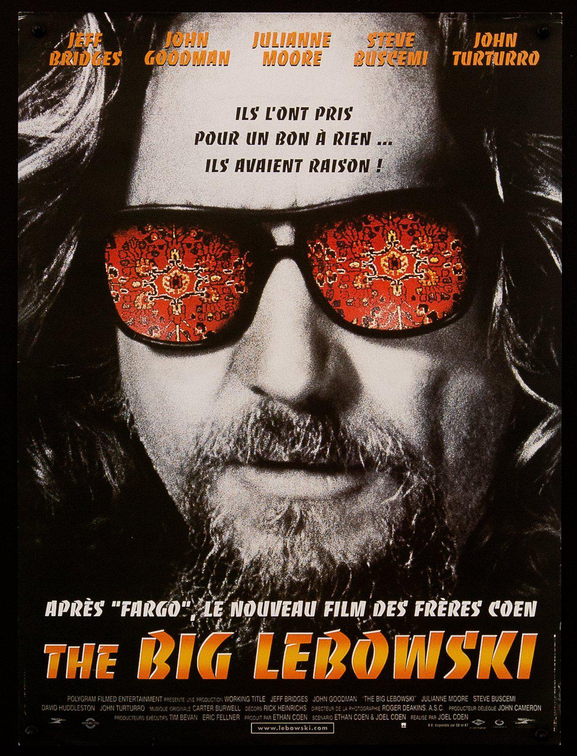 One shows Jeff Bridges as Jeffrey “The Dude” Lebowski with a reflection of his psychedelic patterned rug in his sunglasses, a title in golden yellow Banco, and the tagline “They figured he was a lazy time wasting slacker. They were right”. The concept and image is by Cassie Ramsay Anderson, with photography by Nels Israelson. The typography is uncredited. The campaign was launched in France, the Netherlands, and Germany, among other countries.
