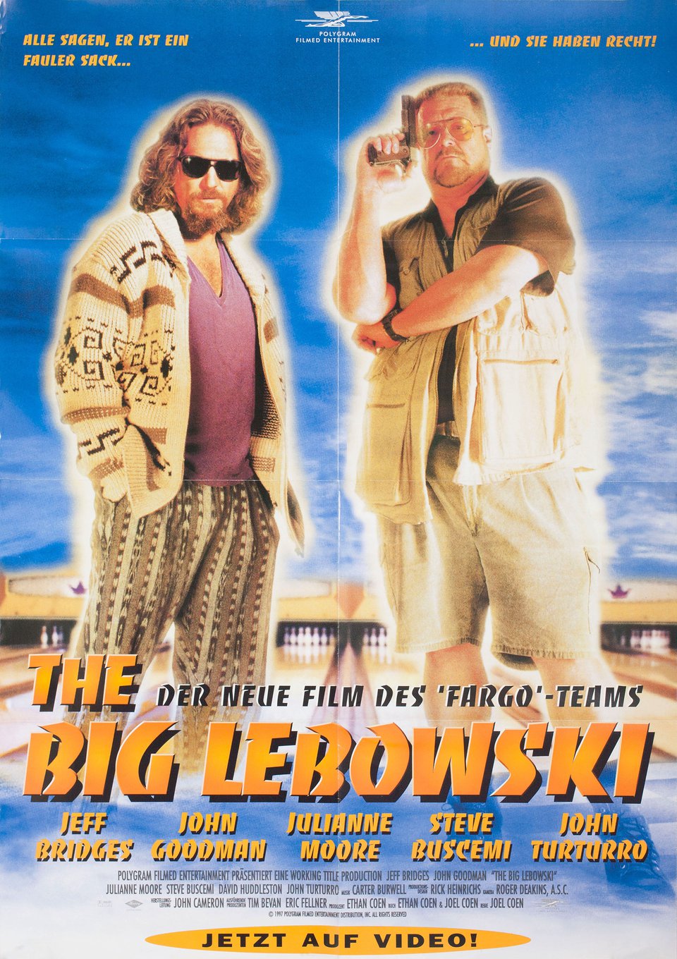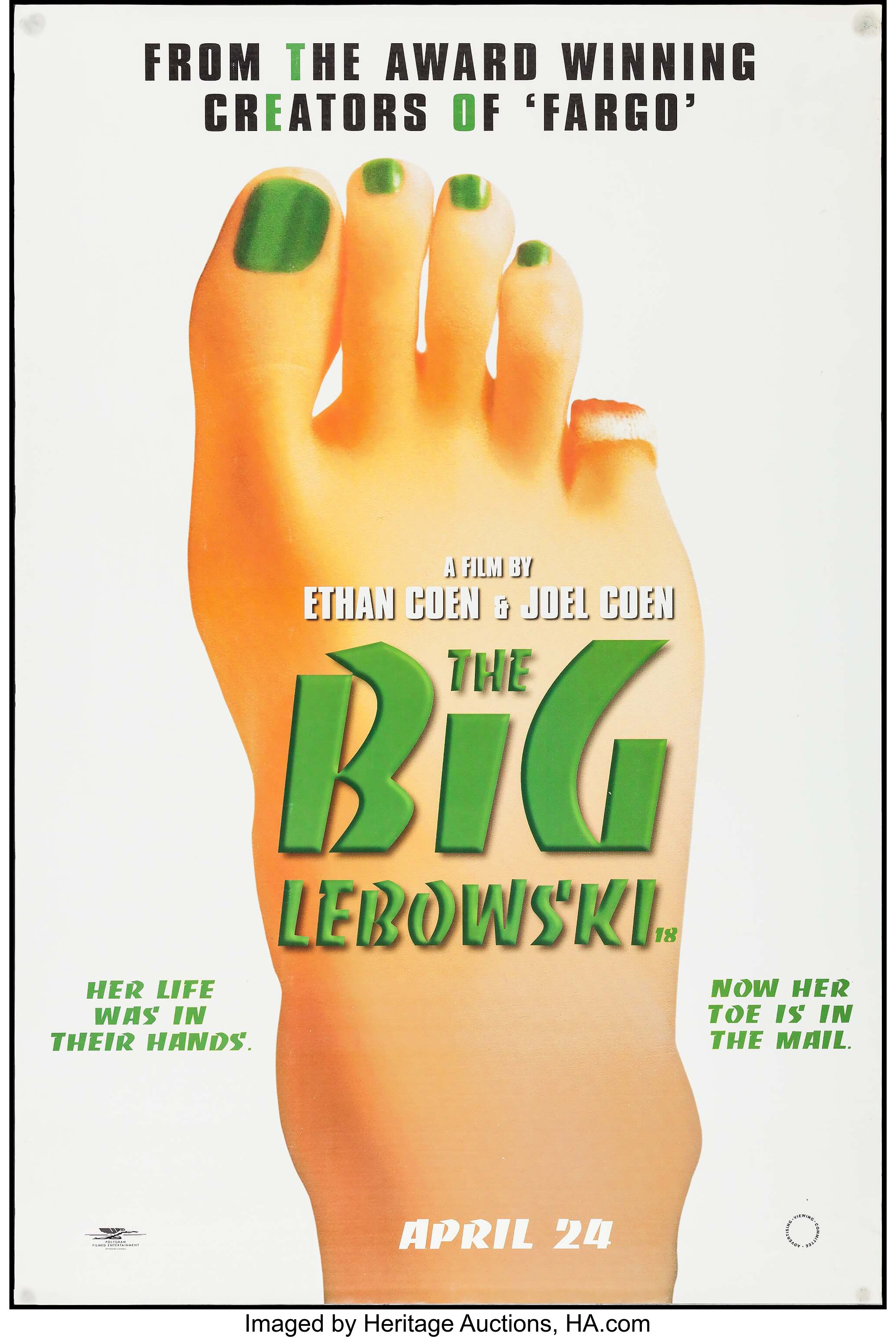 The Dude and his buddy Walter Sobchak (John Goodman) staring in disbelief at the missing toe. UK quad poster (30″ × 40″), designed by TEA – The Entertainment Agency. On this poster and others from the “green branch”, Banco is supported by Compacta (Letraset, 1963).
