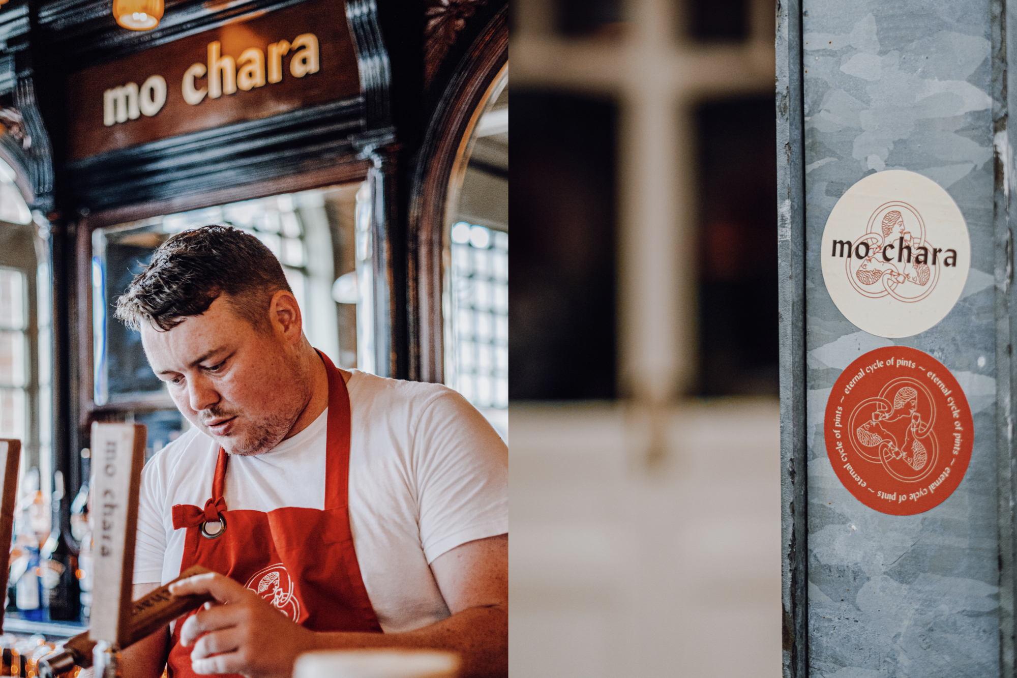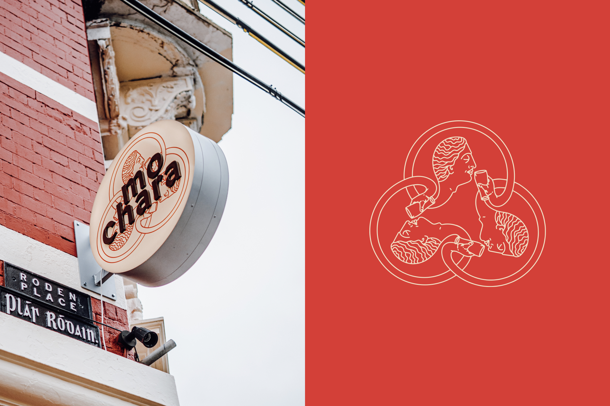 We worked with the Mo Chara team to ensure all the original features of the facade and entire were given the shine they deserved, highlighting rather than covering over. The brand colour red being a nod to the oxide red brick colour used on facade synonymous with Dundalk and its famous brewery heritage.