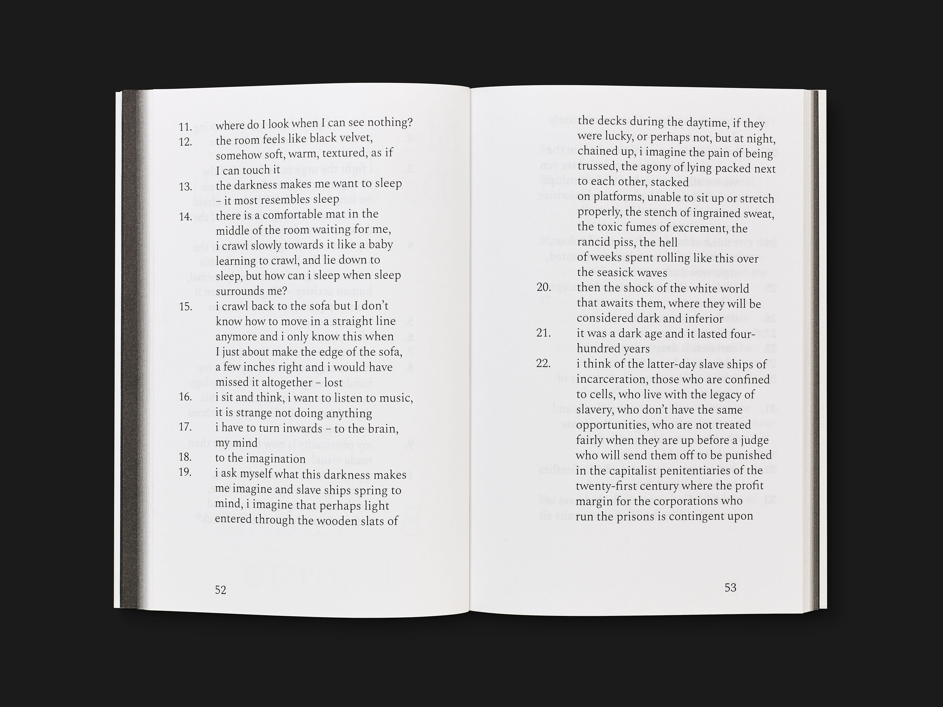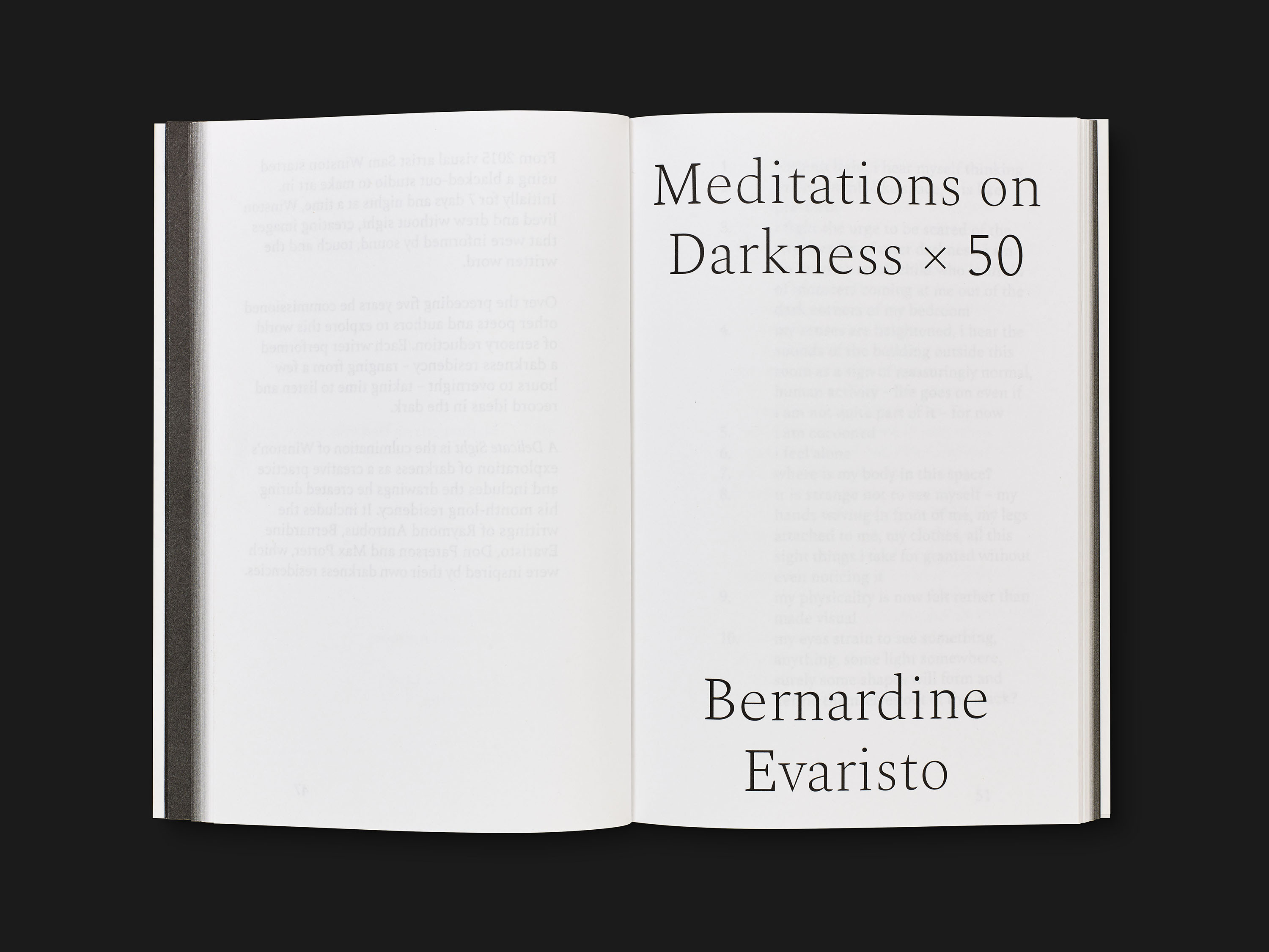 This project is documented by a film, an exhibition to come, and a book. They put the works of Sam Winston in perspective with those of the authors Bernardine Evaristo and Max Porter, as well as the poets Raymond Antrobus and Don Paterson – who all accepted to be part of the experience. The book was designed by London-based studio A Practice for Everyday Life: from the start, the book shows the peculiar attention to sensation that comes with the darkness, with the title printed in reverse on the paper jacket, to be seen in transparency. The book will be launched at the Barbican for the exhibition opening, and the public will be invited to take part in the darkness experience, and to use the unwrapped book jacket as support for their creation. Some of the jackets will be drawn upon by Sam Winston himself, and distributed as gifts.