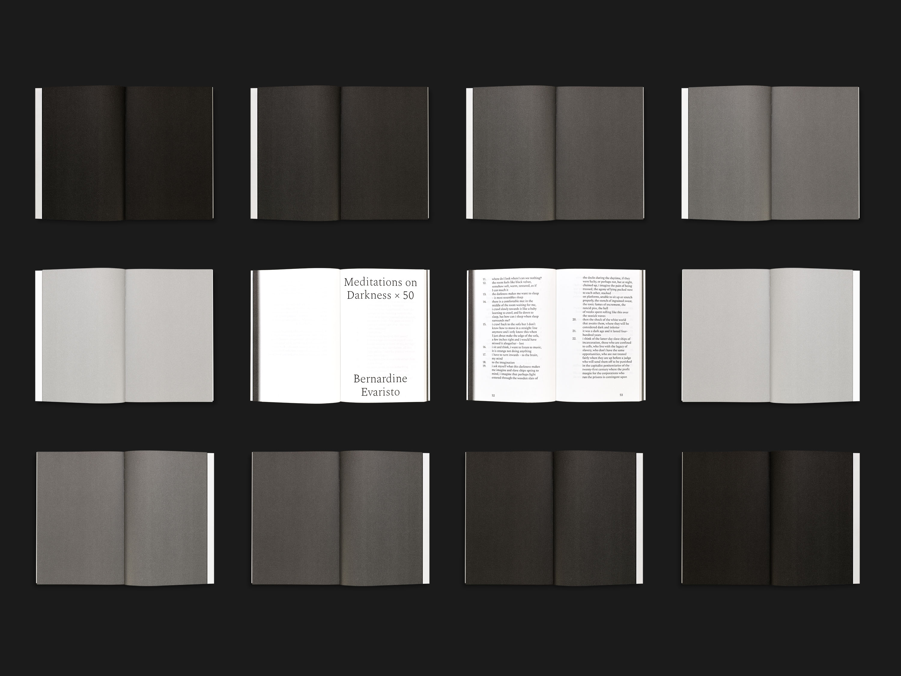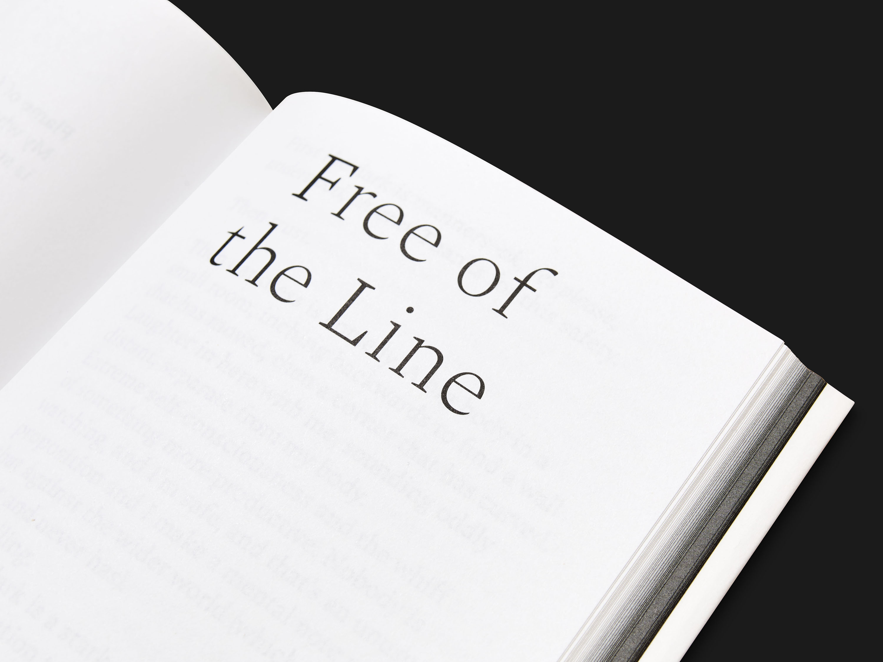 The beginning of the book is a plain gradient of black to white, announcing the texts written during the residency, a white that fades again after the final contribution. This fading is visible on the edges of the book. While reading, it gives the impression that the texts emerge from the darkness. This feeling of something barely apprehensible is supported by the use of Spectral from Production Type: even though this typeface was initially commissioned for screen reading, the lightness permitted by the media conveys a fragile aspect in the context of a printed book. Titles are set in Spectral Light and texts in Spectral Regular.