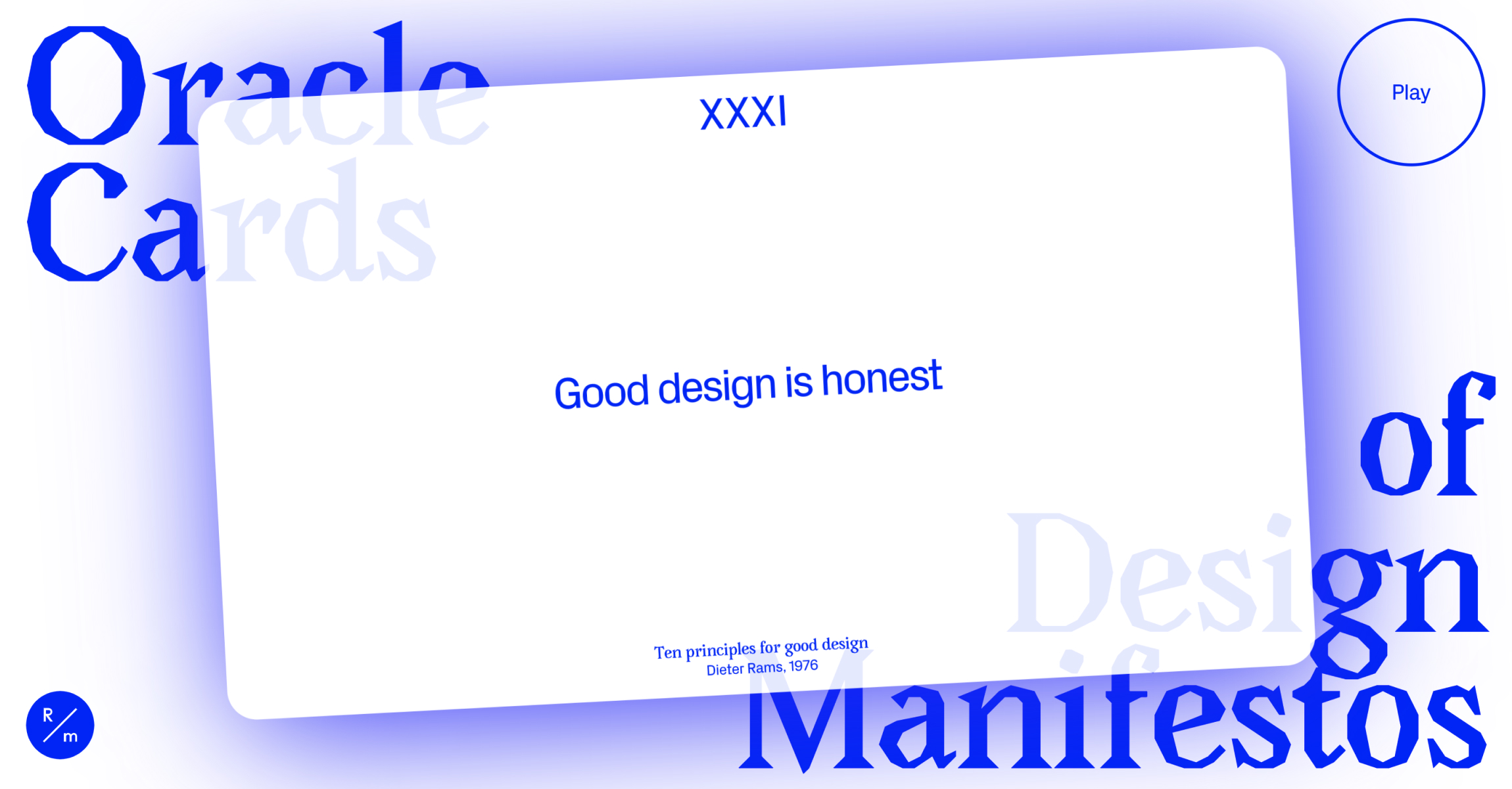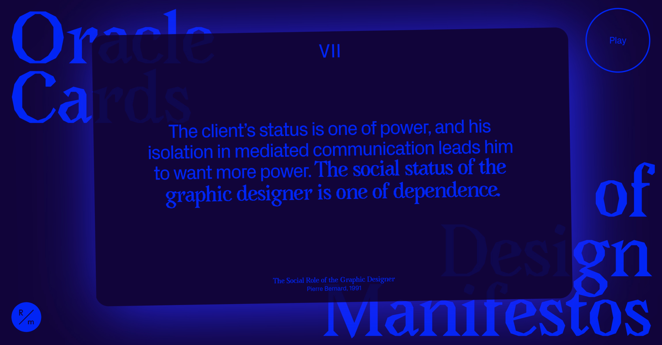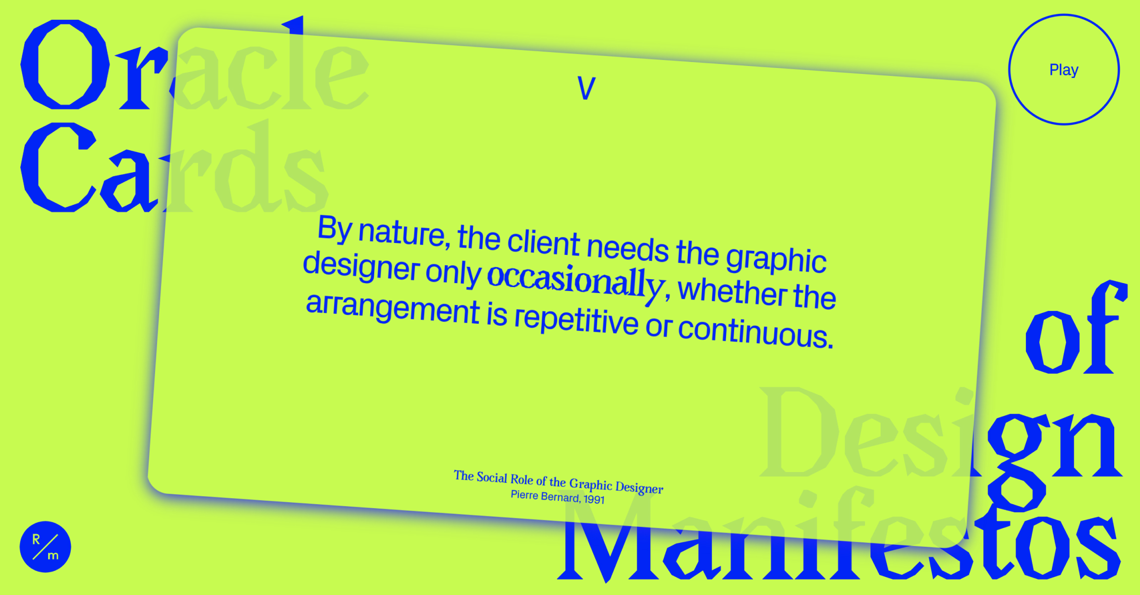 Every time you refresh the page, it will offer a card with a phrase from an important 20th or 21st century design manifesto. It may come in the form of a streamline recommendation or vague meditation—consider it and try to interpret it as a clue for your design process.