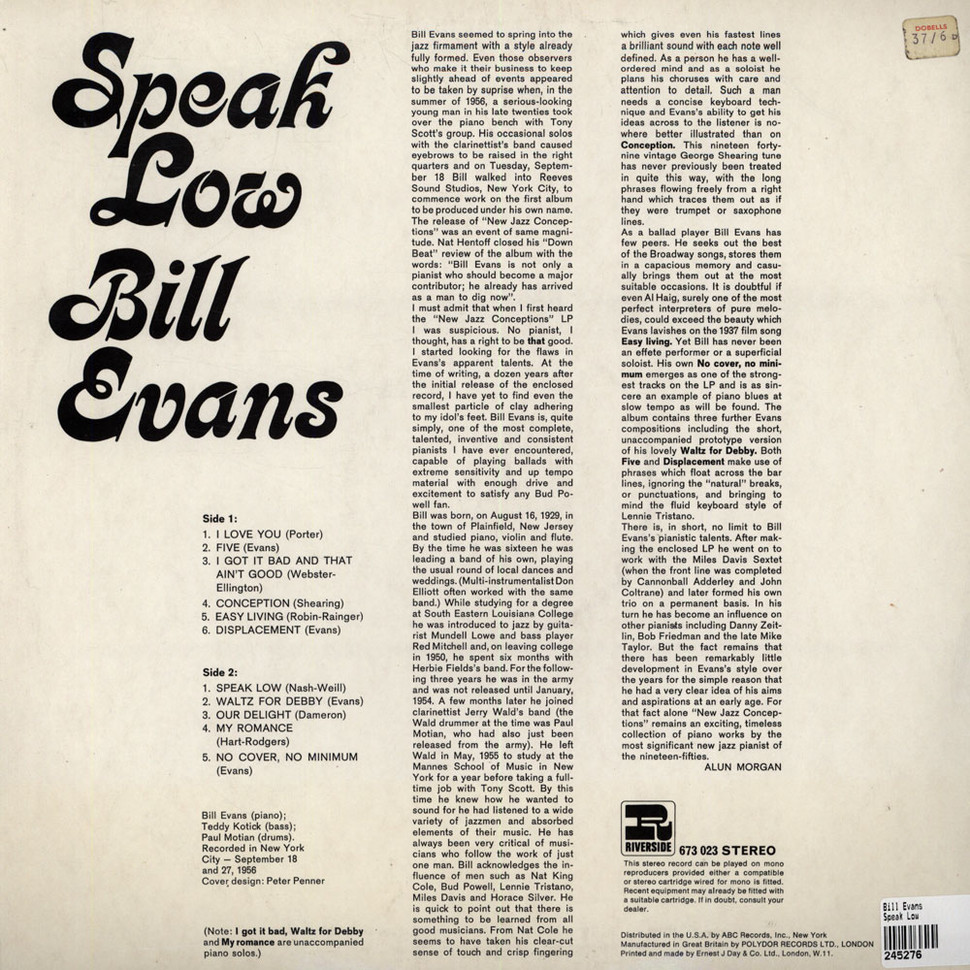 Speak Low is a reissue of a hard bop/cool jazz album by Bill Evans, recorded September 18 and 27, 1956 in New York City and originally released as New Jazz Conceptions in 1957. This pressing by Riverside Records from New York was distributed in the UK (1967?) and Germany (1969), with a cover designed by German graphic artist Peter Penner.