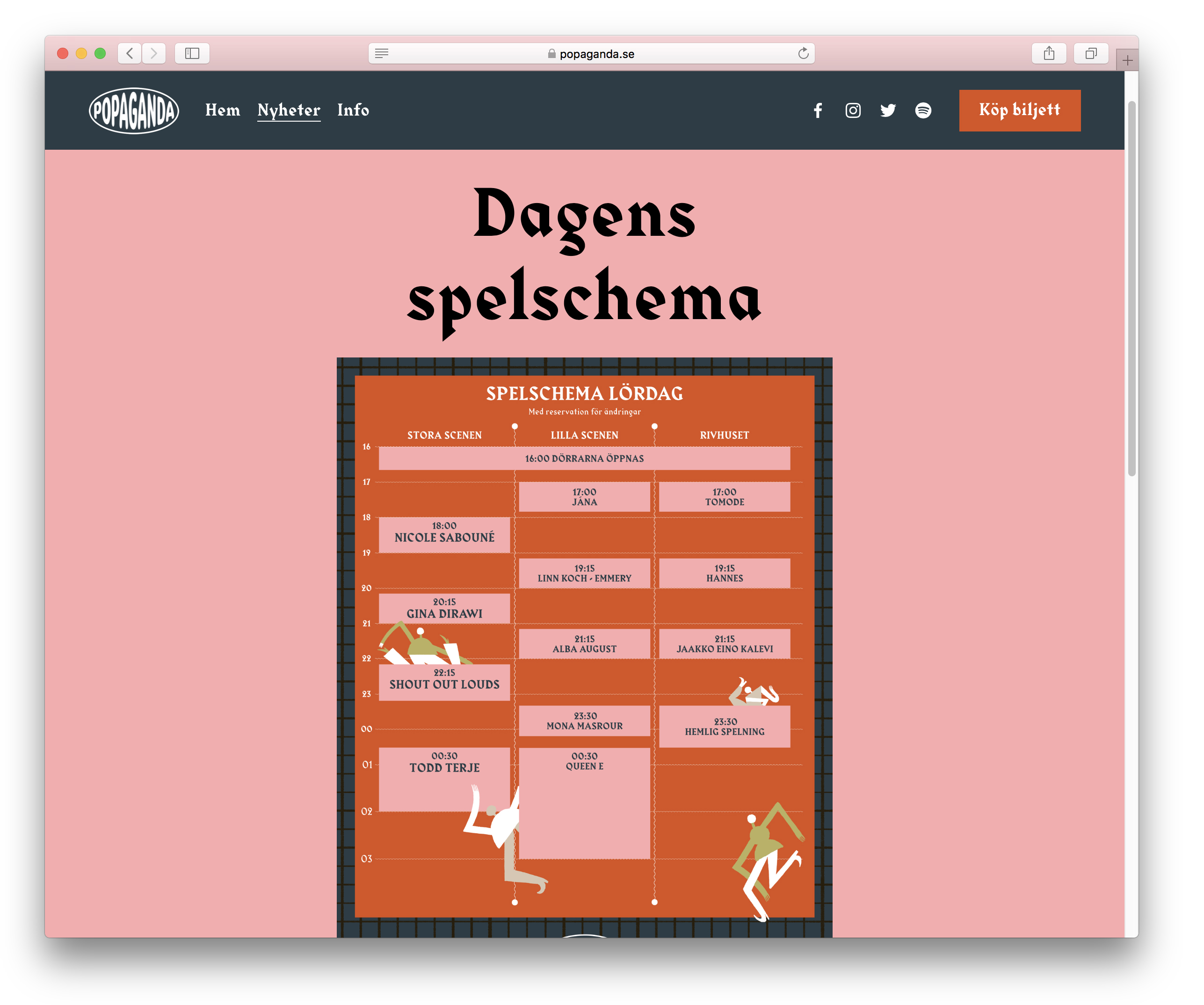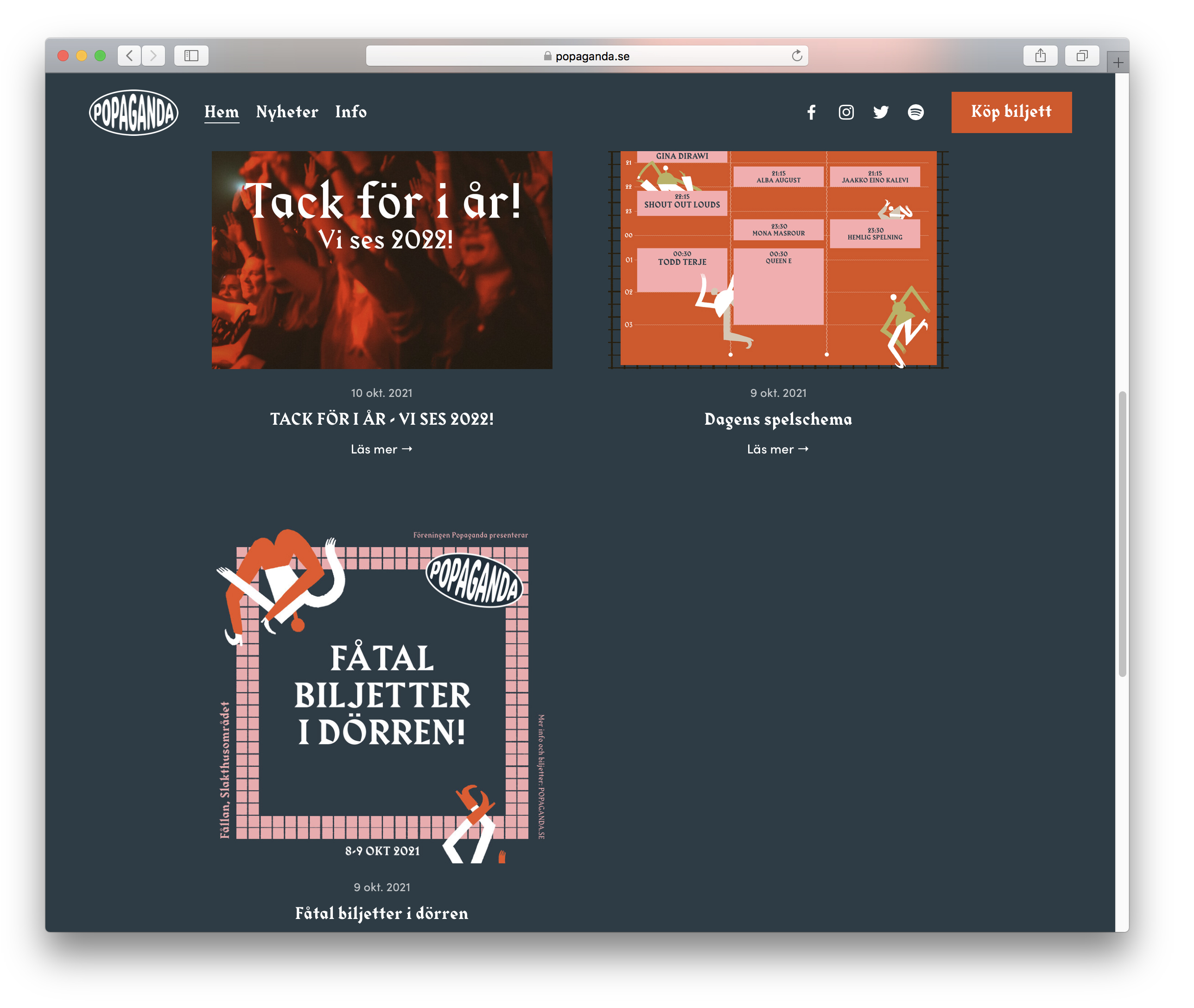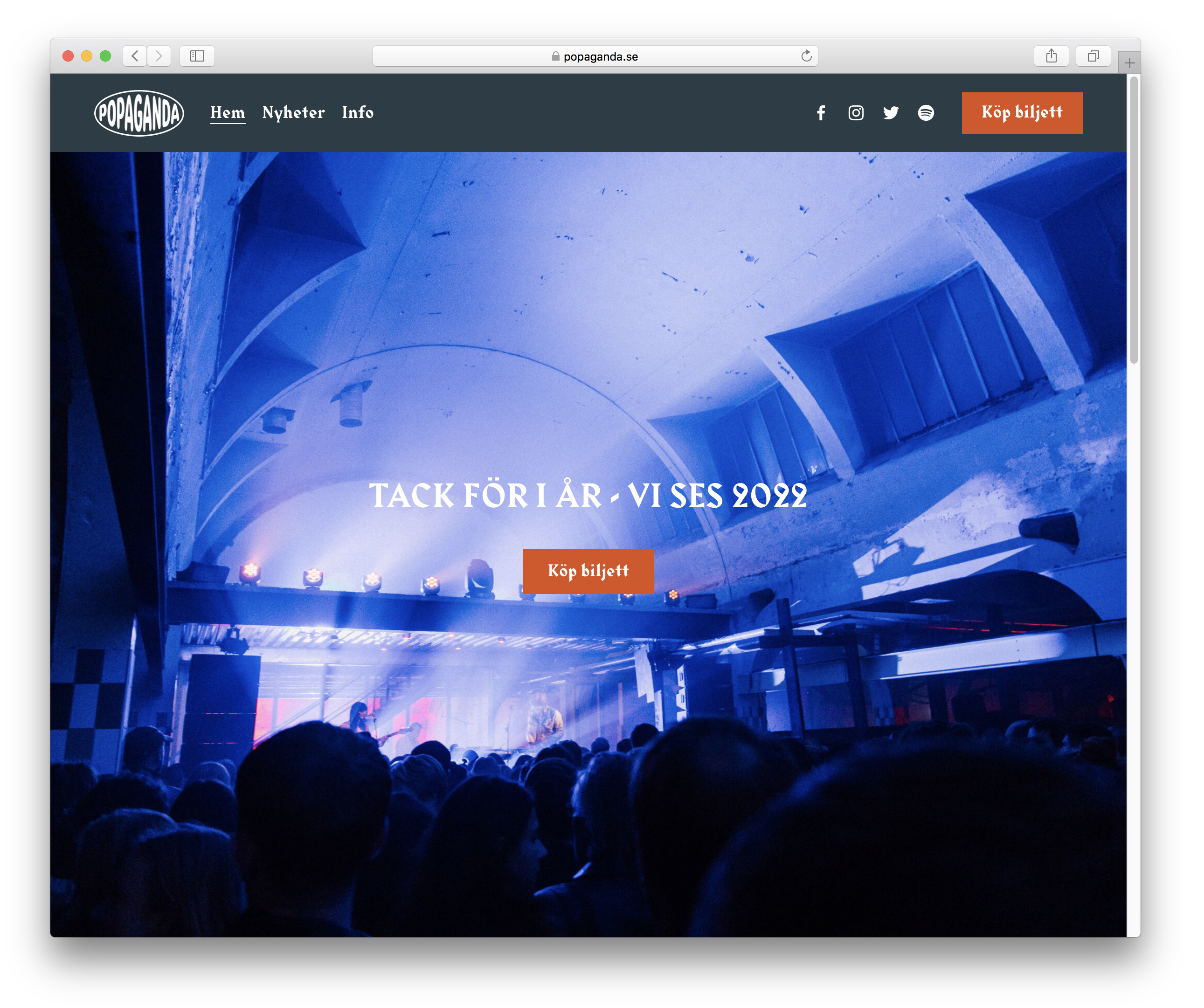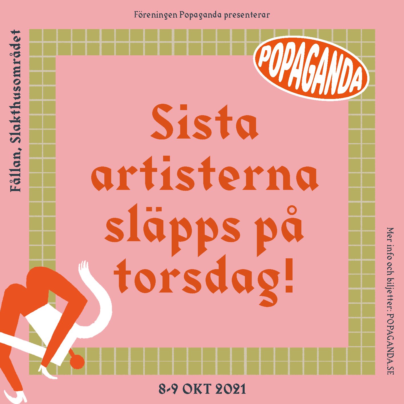 Since 2002, Popaganda has arranged festivals as well as clubs and concerts around Stockholm. In 2021, the festival was held at Fållan in the Slakthus area of the city.