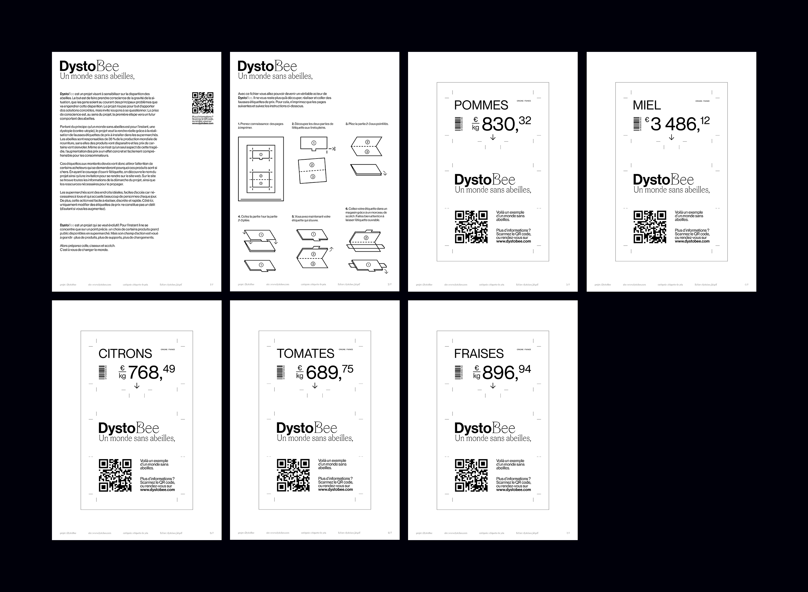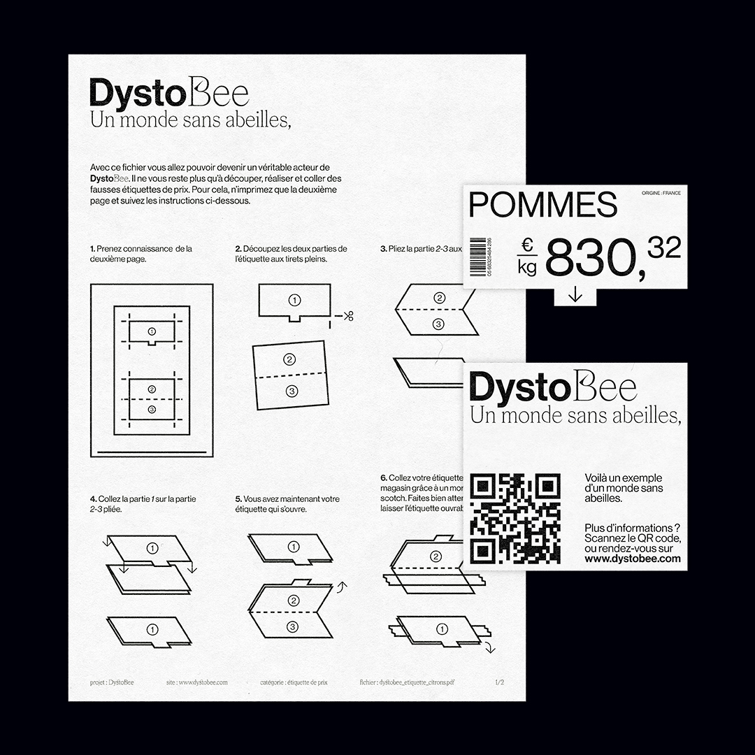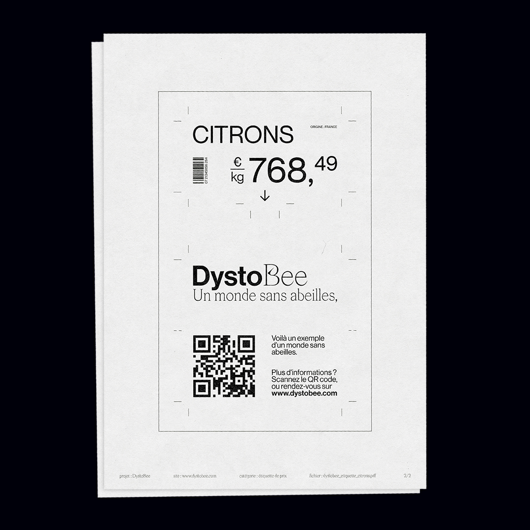 DystoBee is a project aimed at raising awareness about the disappearance of bees. The goal is to show the seriousness of the situation. For the time being, a world without bees is still a dystopia. The project aims to make this scenario more graspable through to the creation of false price tags to be installed in supermarkets. This project was made during my bachelor studies at LISAA Strasbourg.