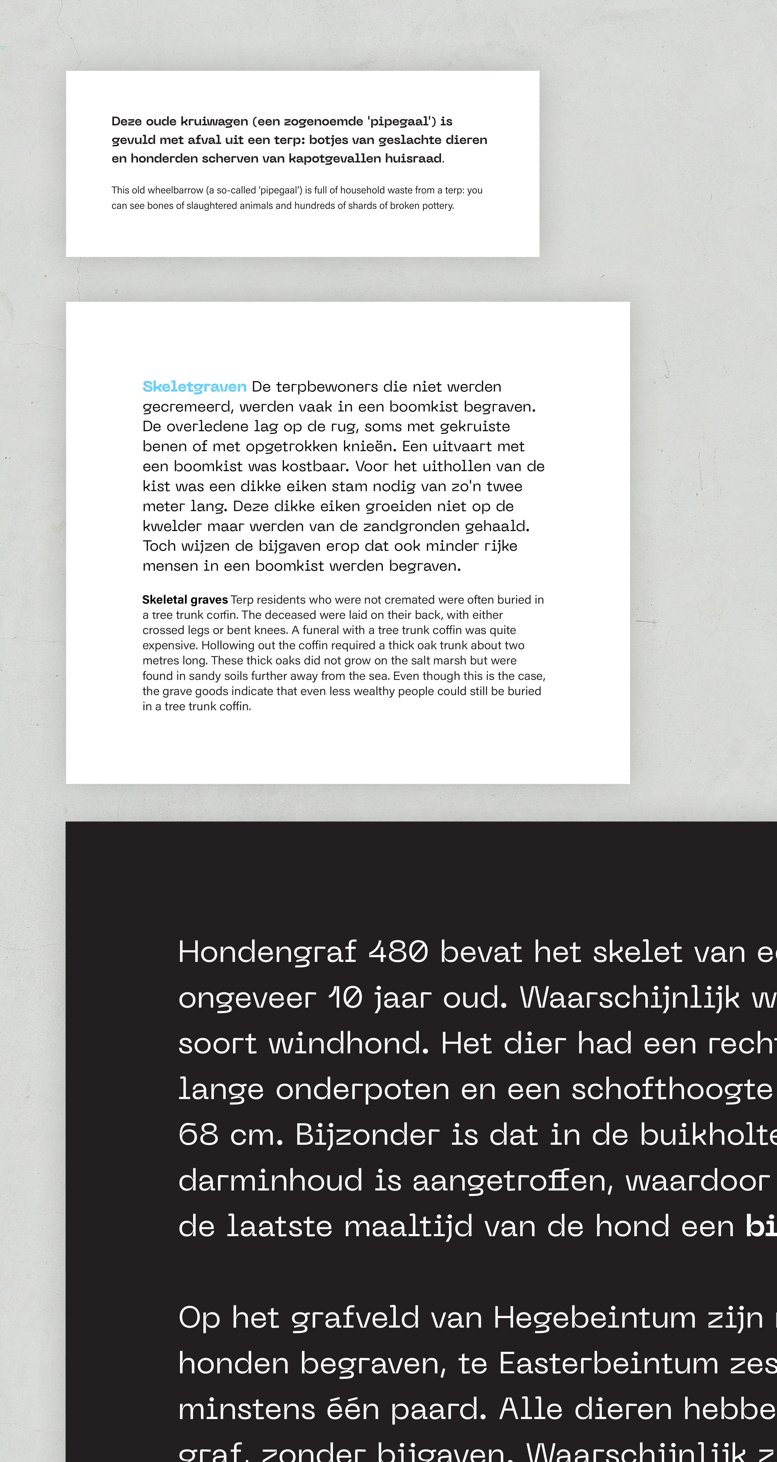 Archaeological exhibits are often dark and use archaic (serif) fonts. We chose to keep the design light and to use contemporary (Acumin) and somewhat futuristic (Neue Machina) typography. In a sense, the mounds are not a relic, but still relevant due to rising sea levels.