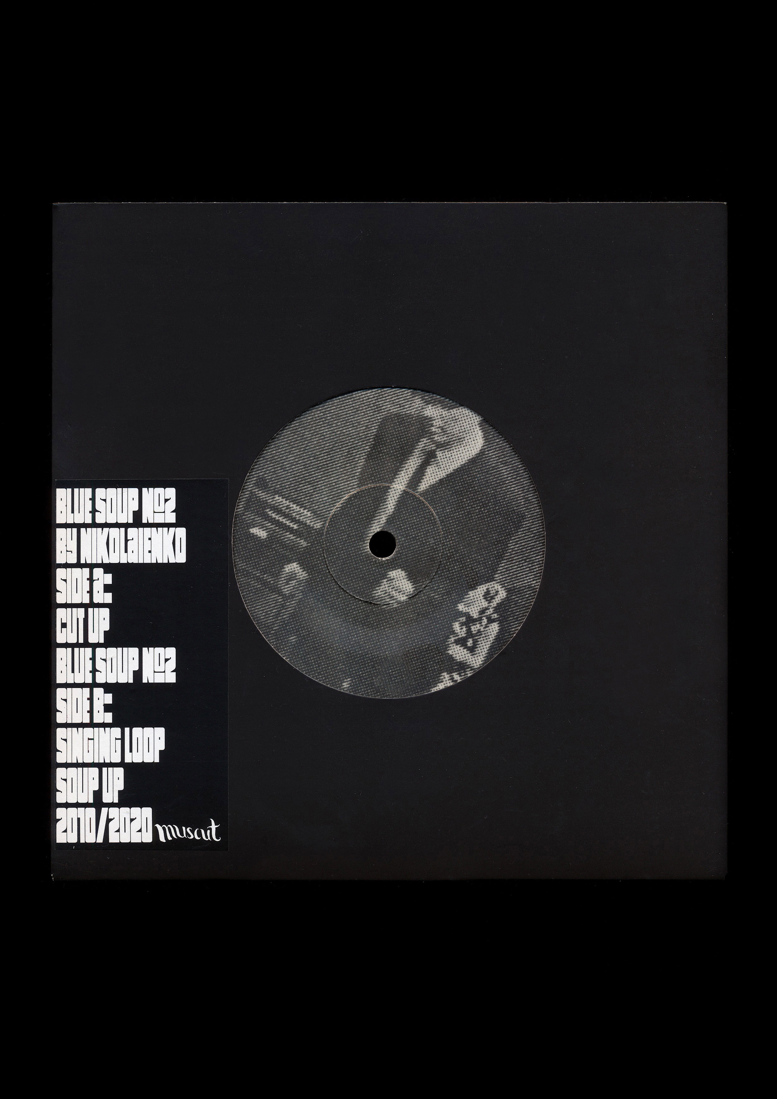 Originally released as a digital download on Nexsound Records in 2010, Blue Soup №2, 2010 is the first vinyl issue of Dmytro Nikolaienko’s four tracks from his debut album Loops & Cuts Soup. Restored from the single copy dubplate record, the 7″ record was released on September 4, 2020 in a limited edition of 100 copies on Nikolaienko’s own label Muscut. For the design, Nikolaienko used KTF Compact by Kyiv Type Foundry.