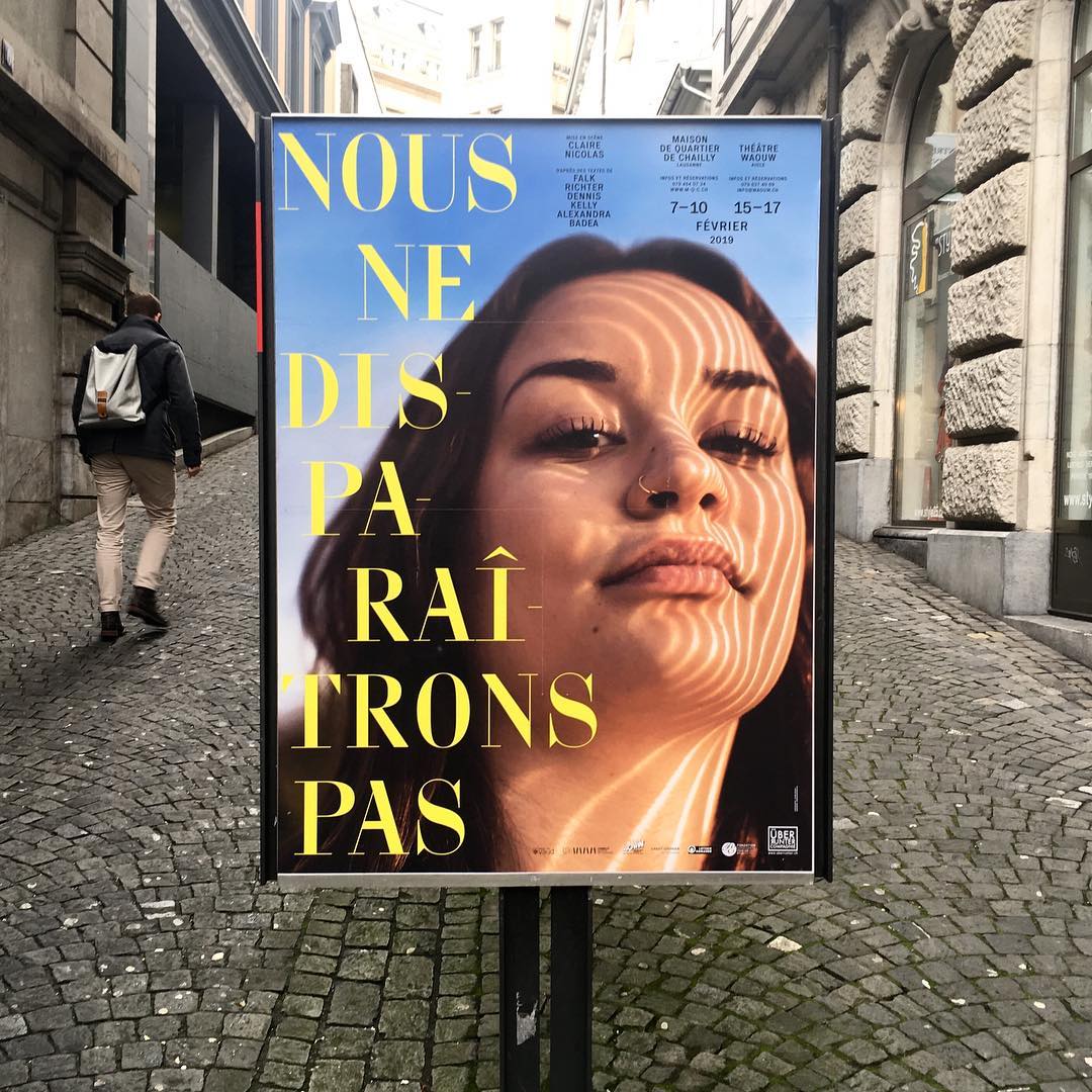 The play Nous ne disparaîtrons pas (“We won’t disappear”) is Cie ÜBERRUNTER’s third production, created during the 2018–19 season in Lausanne, Switzerland. This project invests the thought of three living authors (Falk Richter, Alexandra Badea, Dennis Kelly) who are questioning the impact of social networks on our intimacy. It was performed at Maison de Quartier de Chailly, Lausanne, and Théâtre Waouw, Aigle.