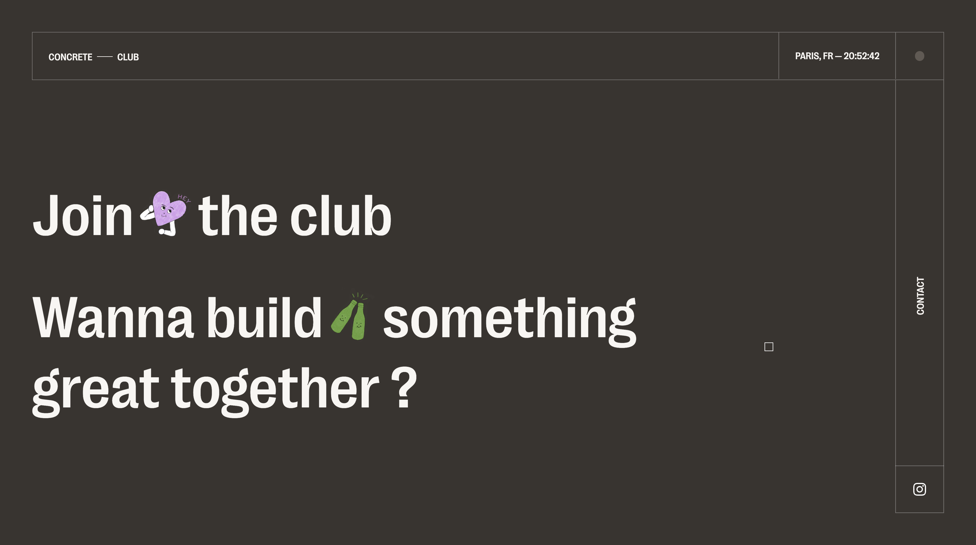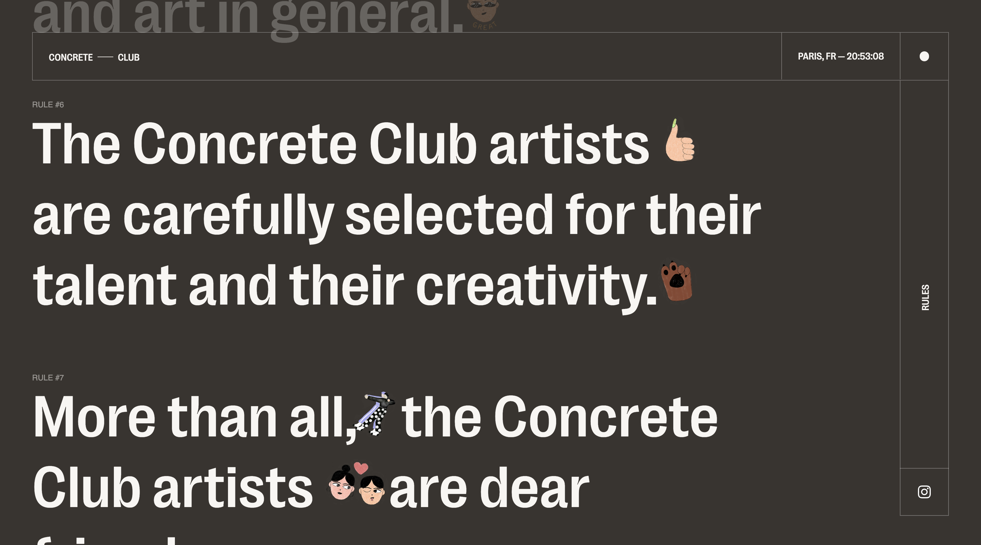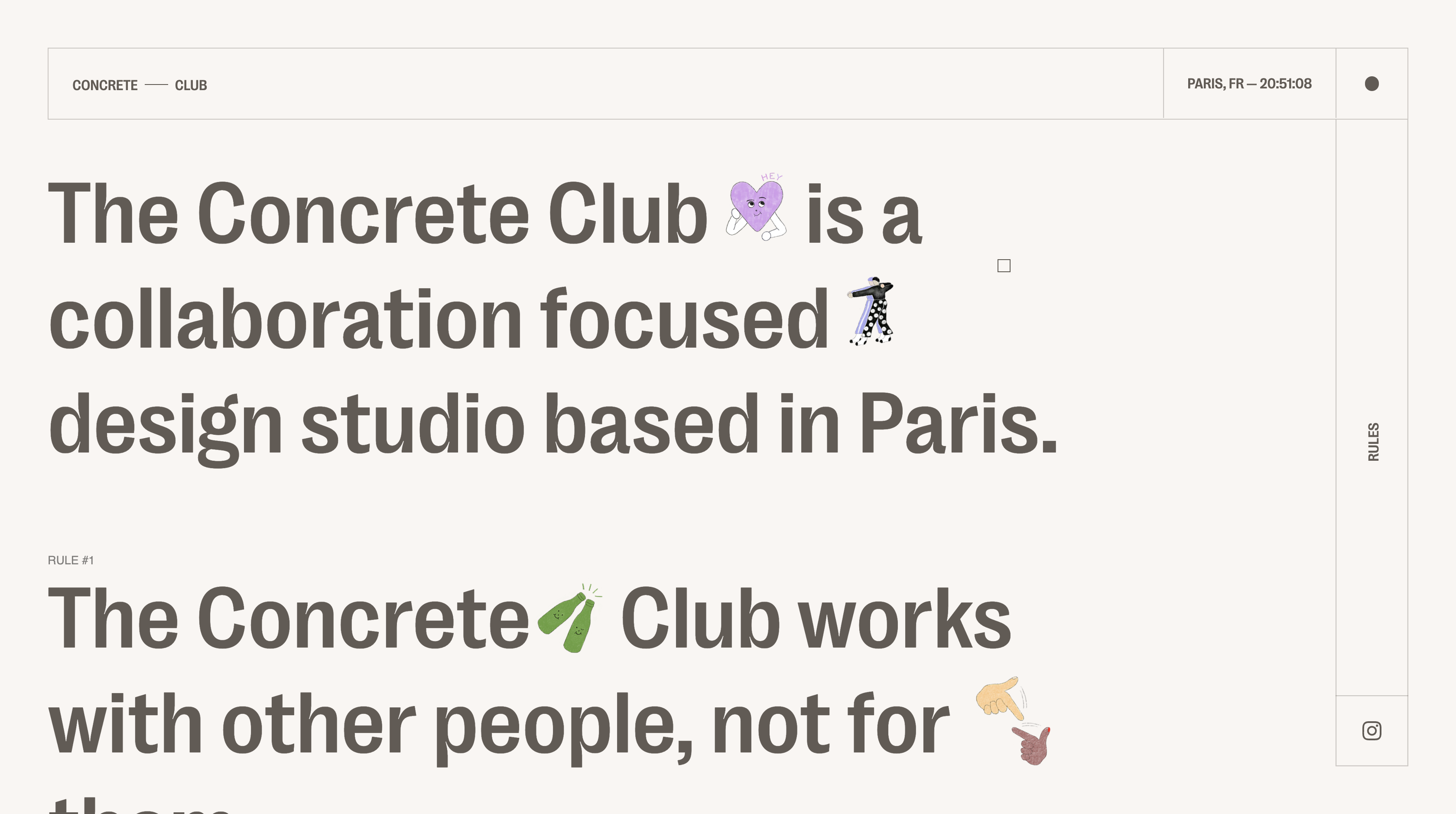 Concrete Club website Contributed by Alex Slobzheninov on Dec 2nd, 2021. Artwork published in circa 2021. Source: concreteclub.studio Concrete Club. License: All Rights Reserved. The Concrete Club is a “collaboration focused design studio” based in Paris. Their portfolio website typography pairs large text set in Right Grotesk with inline illustrations. Small type is set in Helvetica. Source: concreteclub.studio Concrete Club. License: All Rights Reserved. Source: concreteclub.studio Concrete Club. License: All Rights Reserved. Source: concreteclub.studio Concrete Club. License: All Rights Reserved. Source: concreteclub.studio Concrete Club. License: All Rights Reserved. Source: concreteclub.studio Concrete Club. License: All Rights Reserved. Typefaces More about Right GroteskGet Right GroteskMore about HelveticaGet Helvetica Formats Web (5638) Topics Services (1559) Graphic Design (3015) Designers/Agencies Concrete Club (2) Tagged withportfolios (775)design studios/agencies (493)websites (3580)inline images (116)menus (UI) (568)rotated type (2232)chronologically ordered (2)Nouveau Rebus (26) Artwork location France (2851) Paris (1322) Post a comment Name Email – will not be published Website Your response Submit Comment More Right Grotesk in use Mezi—soudy websitec. 2024unknownContributed by Alex Slobzheninov Lamanna’s Bakery websitec. 2021unknownContributed by Alex Slobzheninov Staff Pick We Refuse To Grow Up2021Thinking*RoomContributed by Alex Slobzheninov Sponsor More in Services Glas-Hertel, Düsseldorf-UnterbilkunknownPhoto(s) by monsieur ADRIEN on Flickr. Hackpad2014Contributed by Stephen Coles Delivereasyc. 2023Colenso BBDOContributed by Jolicia Type Mentoring Creativo2022FellasContributed by Jonas Pelzer More in Web Safari Riot portfolio website2020Eric Van HoltzGrayson SandersElena FloresContributed by Adelina Shaydullina Citi Private Bank website2020CitigroupContributed by Production Type mesurac. 2024Mouthwash StudioContributed by Ben Mingo Staff Pick Ubi Sunt by Blaise Agüera y Arcas2022James GogginPractiseContributed by Yevgeniy Anfalov Staff Pick More Fonts In Use Ingrid Witt — Everything has to be True EP & “Killing Me” single2017Lina ForsgrenContributed by Ellmer Stefan (The Pyte Foundry) Staff Pick IL 352011Francesco FranchiContributed by Stephen Coles Staff Pick Archiv für Buchgewerbe und Gebrauchsgraphik, “Rudolf Koch und sein Kreis”1933Photo(s) by Kirsten Solveig Schneider on Flickr. Staff Pick Kunsthal Extra City visual identity2021Ward HeirweghContributed by Ward Heirwegh Staff Pick