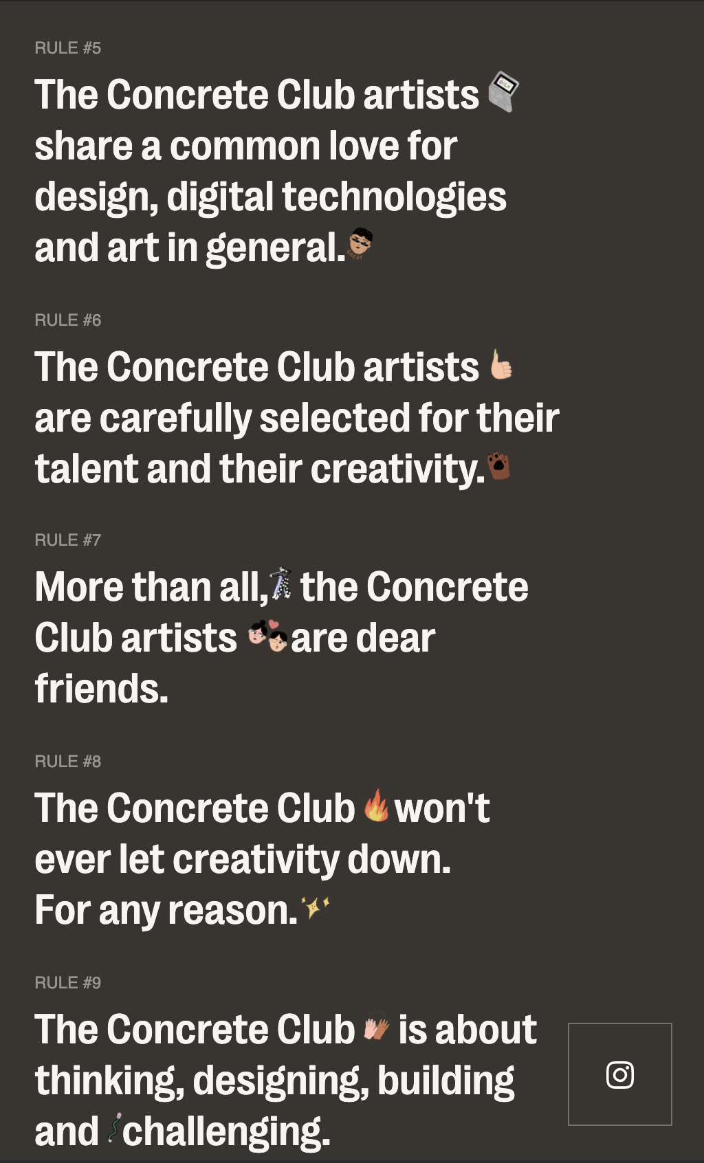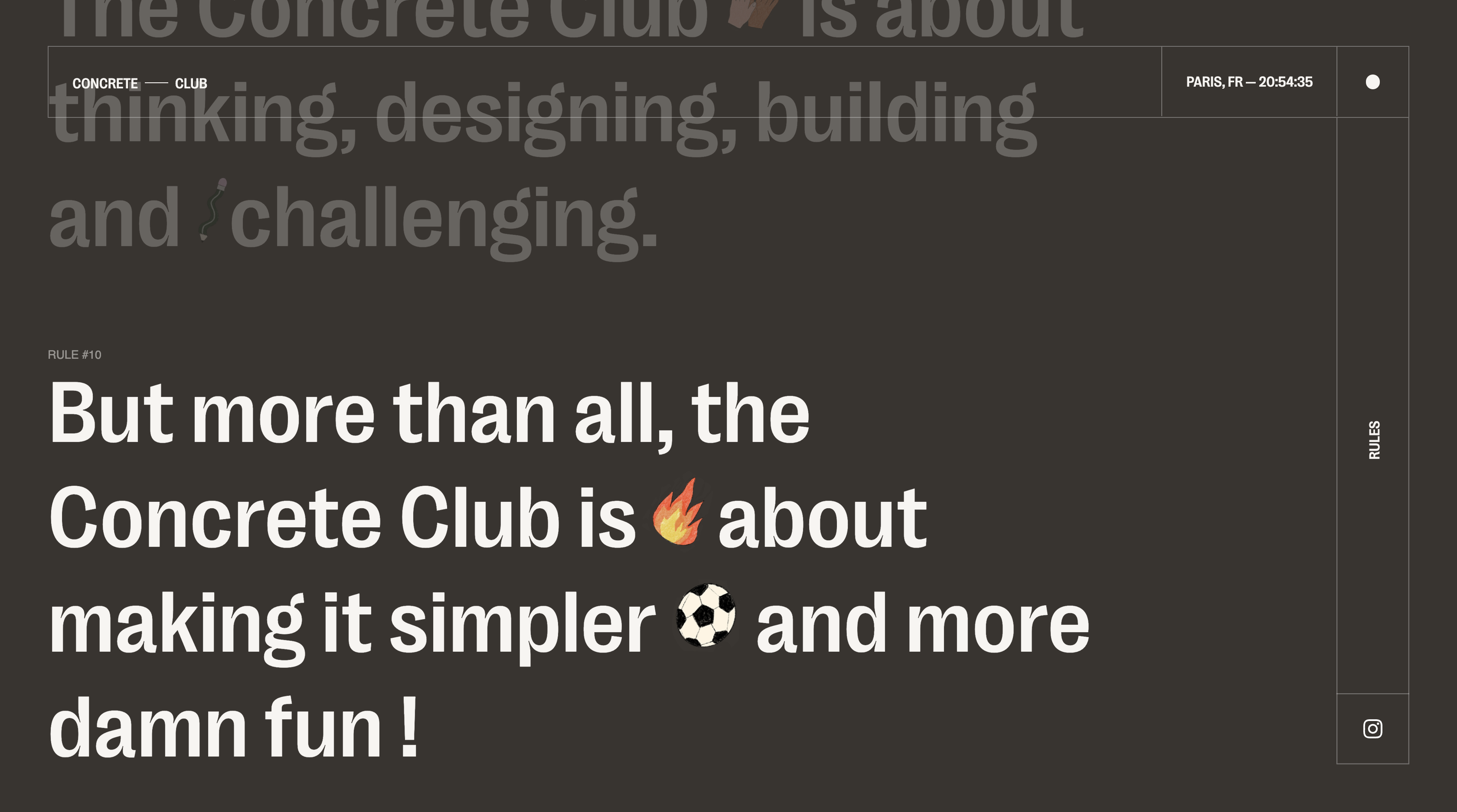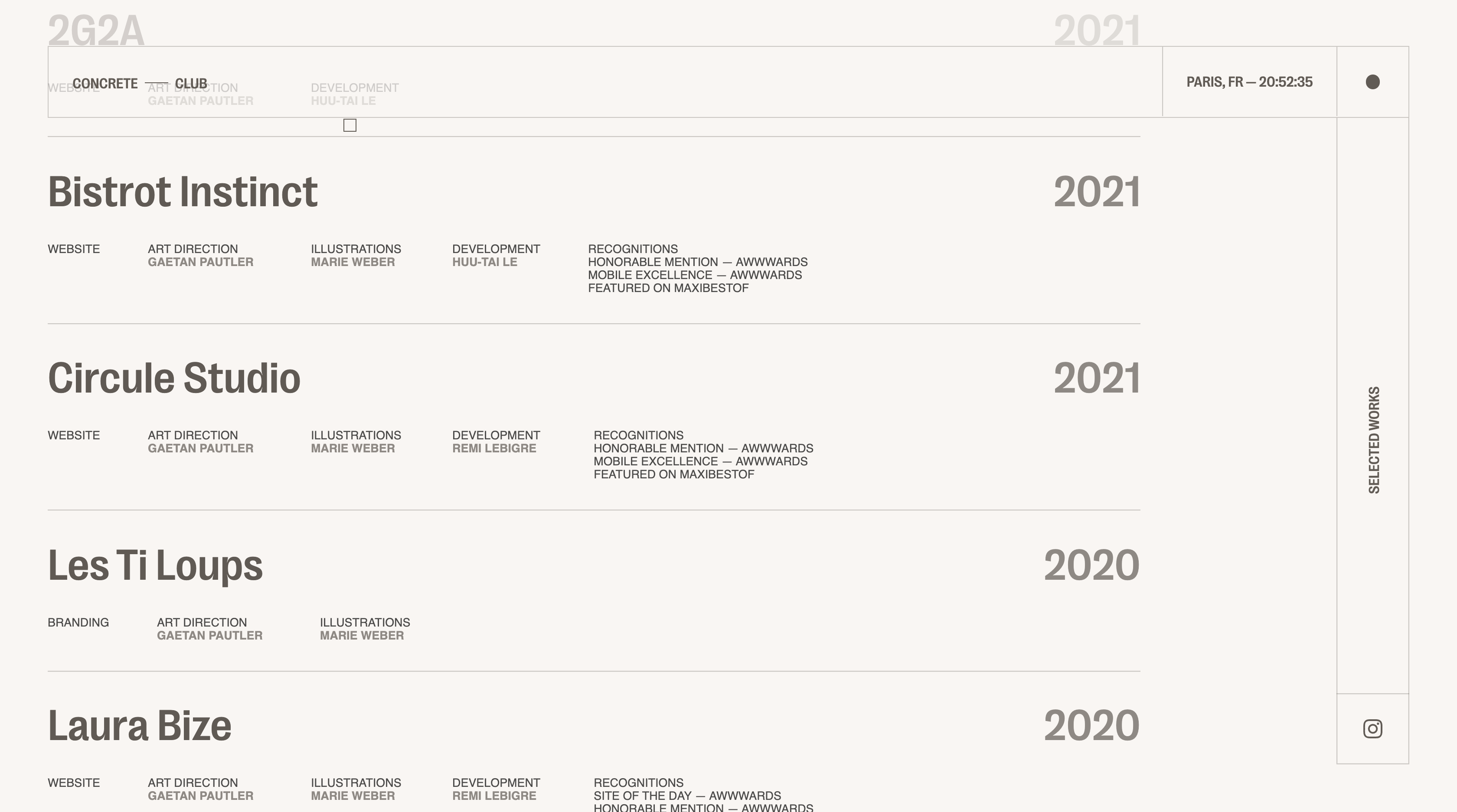 Concrete Club website Contributed by Alex Slobzheninov on Dec 2nd, 2021. Artwork published in circa 2021. Source: concreteclub.studio Concrete Club. License: All Rights Reserved. The Concrete Club is a “collaboration focused design studio” based in Paris. Their portfolio website typography pairs large text set in Right Grotesk with inline illustrations. Small type is set in Helvetica. Source: concreteclub.studio Concrete Club. License: All Rights Reserved. Source: concreteclub.studio Concrete Club. License: All Rights Reserved. Source: concreteclub.studio Concrete Club. License: All Rights Reserved. Source: concreteclub.studio Concrete Club. License: All Rights Reserved. Source: concreteclub.studio Concrete Club. License: All Rights Reserved. Typefaces More about Right GroteskGet Right GroteskMore about HelveticaGet Helvetica Formats Web (5638) Topics Services (1559) Graphic Design (3015) Designers/Agencies Concrete Club (2) Tagged withportfolios (775)design studios/agencies (493)websites (3580)inline images (116)menus (UI) (568)rotated type (2232)chronologically ordered (2)Nouveau Rebus (26) Artwork location France (2851) Paris (1322) Post a comment Name Email – will not be published Website Your response Submit Comment More Right Grotesk in use Mezi—soudy websitec. 2024unknownContributed by Alex Slobzheninov Lamanna’s Bakery websitec. 2021unknownContributed by Alex Slobzheninov Staff Pick We Refuse To Grow Up2021Thinking*RoomContributed by Alex Slobzheninov Sponsor More in Services Glas-Hertel, Düsseldorf-UnterbilkunknownPhoto(s) by monsieur ADRIEN on Flickr. Hackpad2014Contributed by Stephen Coles Delivereasyc. 2023Colenso BBDOContributed by Jolicia Type Mentoring Creativo2022FellasContributed by Jonas Pelzer More in Web Safari Riot portfolio website2020Eric Van HoltzGrayson SandersElena FloresContributed by Adelina Shaydullina Citi Private Bank website2020CitigroupContributed by Production Type mesurac. 2024Mouthwash StudioContributed by Ben Mingo Staff Pick Ubi Sunt by Blaise Agüera y Arcas2022James GogginPractiseContributed by Yevgeniy Anfalov Staff Pick More Fonts In Use Ingrid Witt — Everything has to be True EP & “Killing Me” single2017Lina ForsgrenContributed by Ellmer Stefan (The Pyte Foundry) Staff Pick IL 352011Francesco FranchiContributed by Stephen Coles Staff Pick Archiv für Buchgewerbe und Gebrauchsgraphik, “Rudolf Koch und sein Kreis”1933Photo(s) by Kirsten Solveig Schneider on Flickr. Staff Pick Kunsthal Extra City visual identity2021Ward HeirweghContributed by Ward Heirwegh Staff Pick