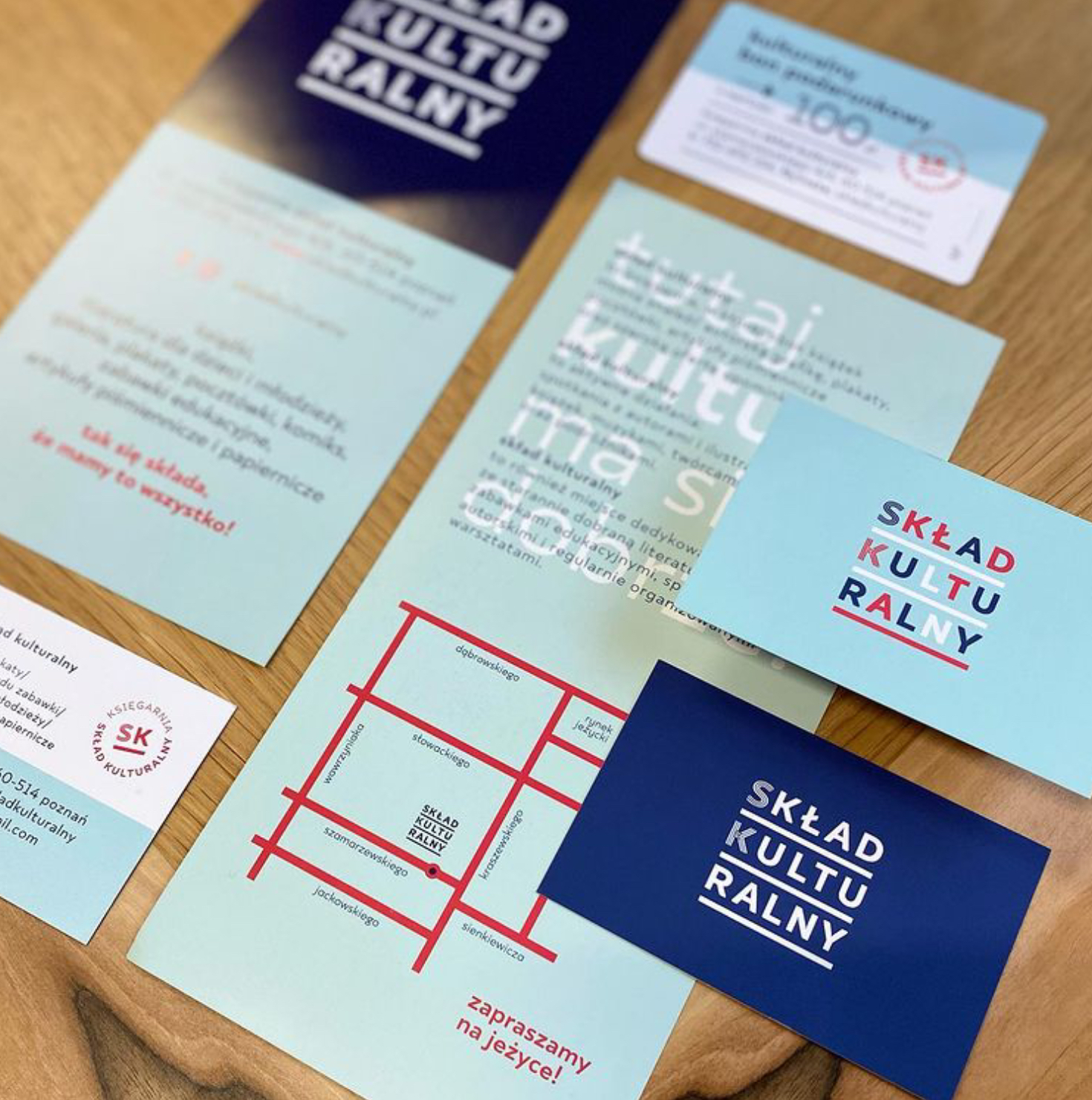 Following up on the 2015 identity of the bookstore, the new outfit for Skład kulturalny (“Cultural composition”) shows a calmer, clean look. Instead of an eclectic melting pot, the typography is now reduced to a single typeface family: TT Smalls. Inline initial capitals are used for the logo. Blue was retained as the main color.