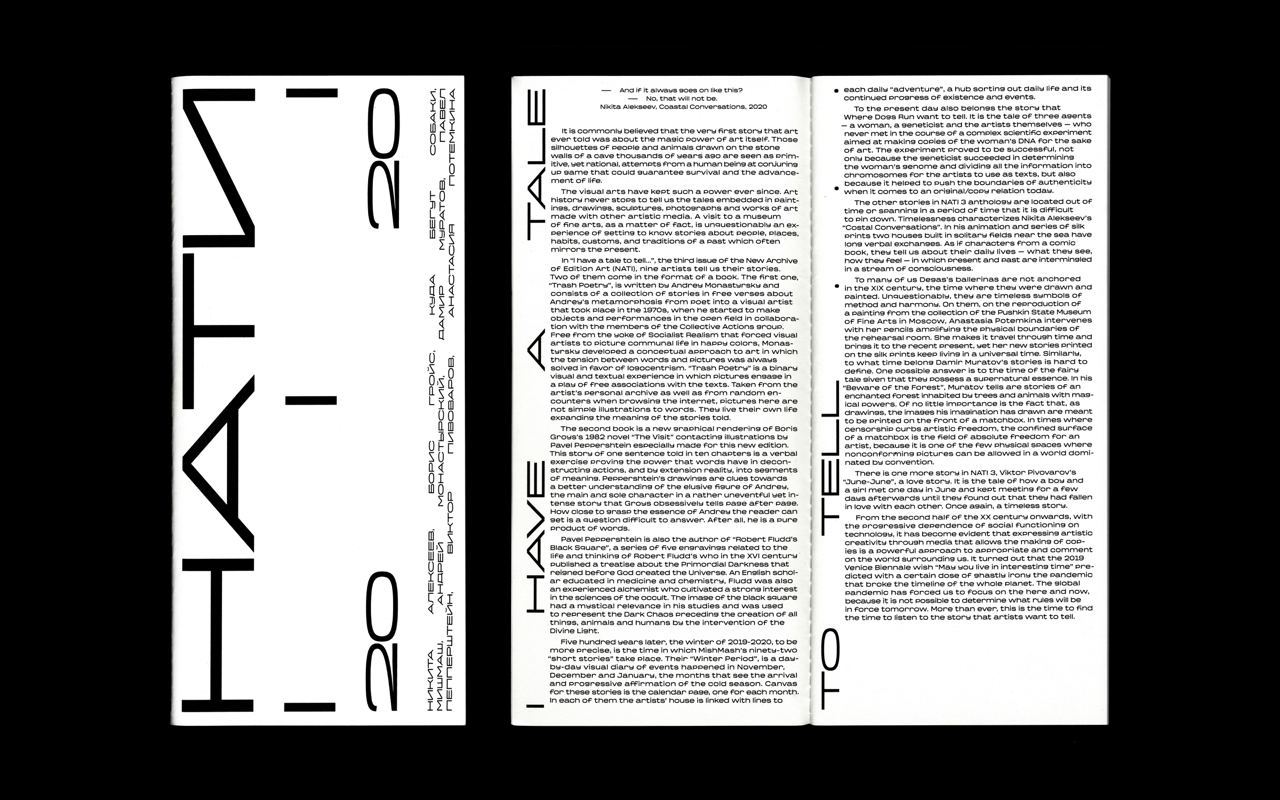NATI (НАТИ, Russian abbreviation for New Archive of Limited Edition Art) is an initiative of Shaltai Editions gallery, an homage to the project conceived by Moscow Conceptualist artists Andrey Monastyrsky, Lev Rubinstein, Nikita Alexeev back in the 1980s. They packed the works of artists close to their circle into folders, calling them the Moscow Archive of New Art, MANI (МАНИ). Each participant put a new work they wanted to submit into an envelope, while a compiler brought all the envelopes under one cover and wrote an accompanying text.