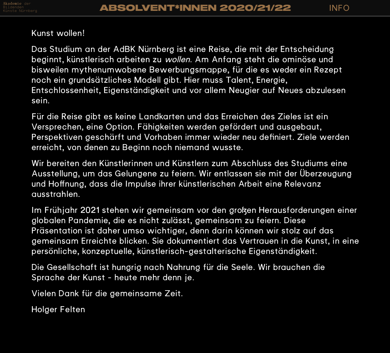At the end of the winter semester 2021/22, the Nuremberg Academy of Fine Arts held an exhibition to bid farewell to its alumni. The students were showing works that have a special significance for their artistic growth. The entire campus was used as a display area, with class pavilions transformed into exhibition spaces and lecture rooms transformed into installations.