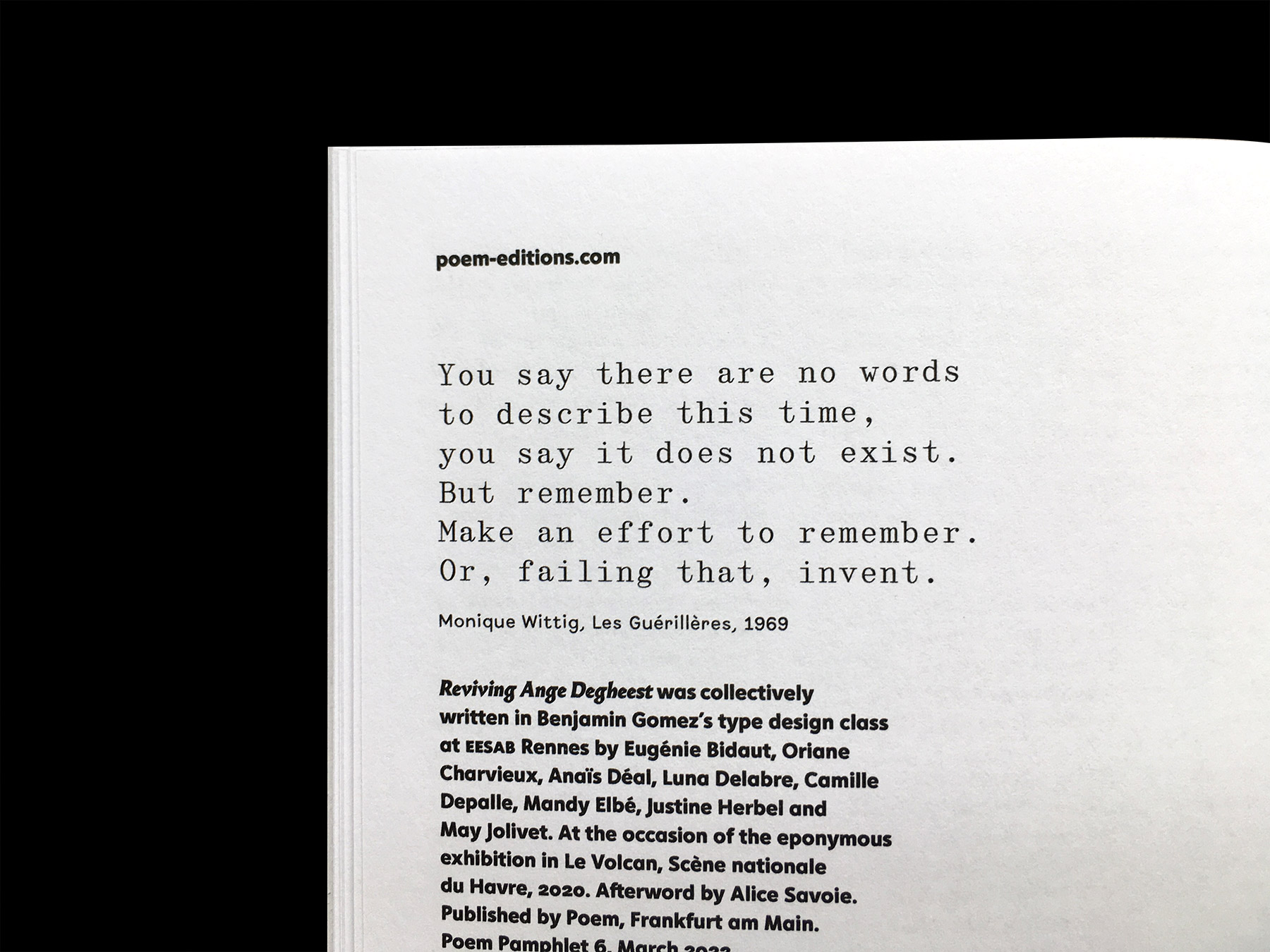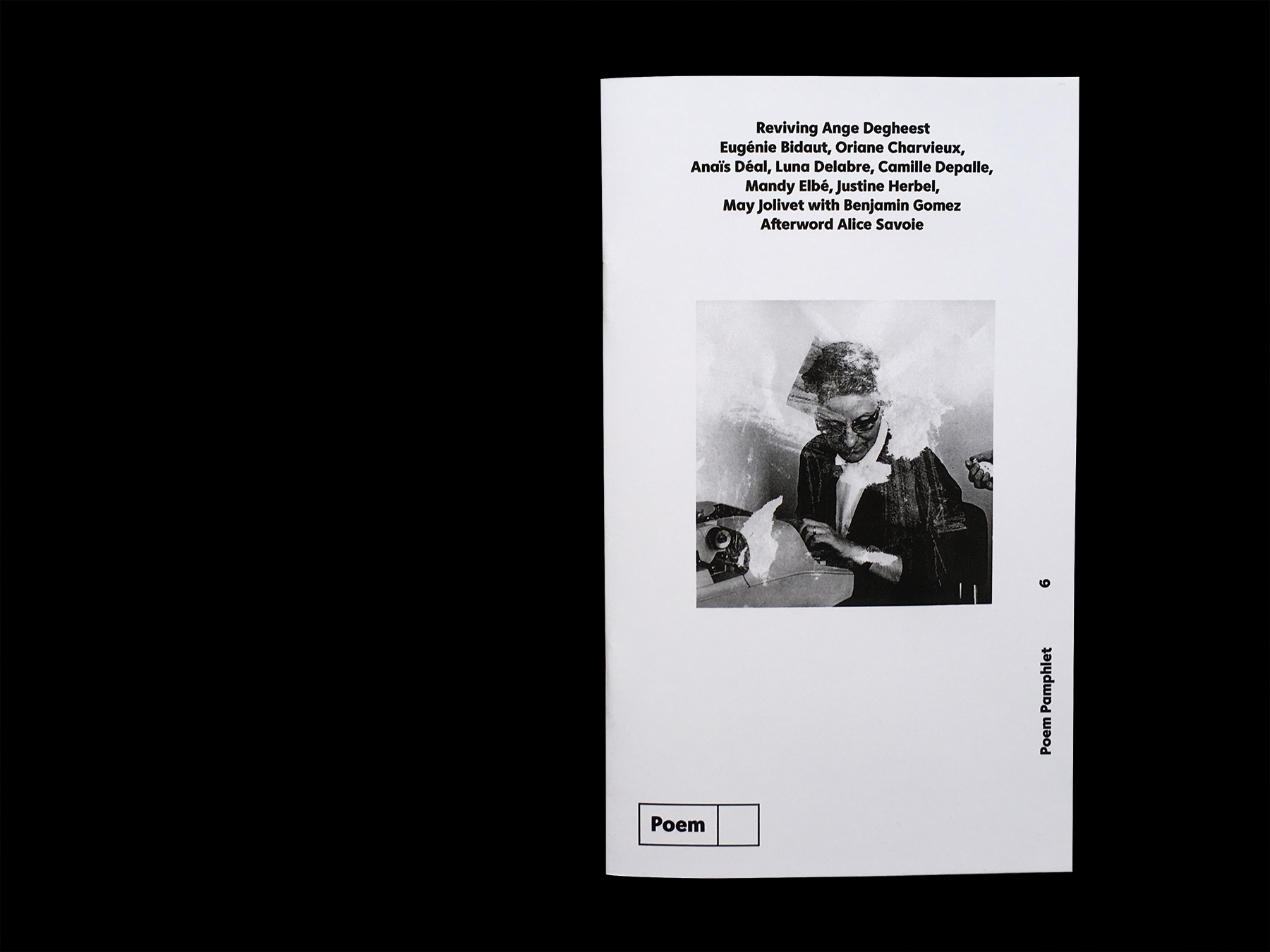 Reviving Ange Degheest was collectively written in Benjamin Gomez’s type design class at EESAB Rennes by Eugénie Bidaut, Oriane Charvieux, Anaïs Déal, Luna Delabre, Camille Depalle, Mandy Elbé, Justine Herbel and May Jolivet. Afterword ‘Ange Degheest, a female ghost of France’s type history’ by Alice Savoie. Edited by Alice Savoie and Jérôme Knebusch in the Poem Pamphlet series.