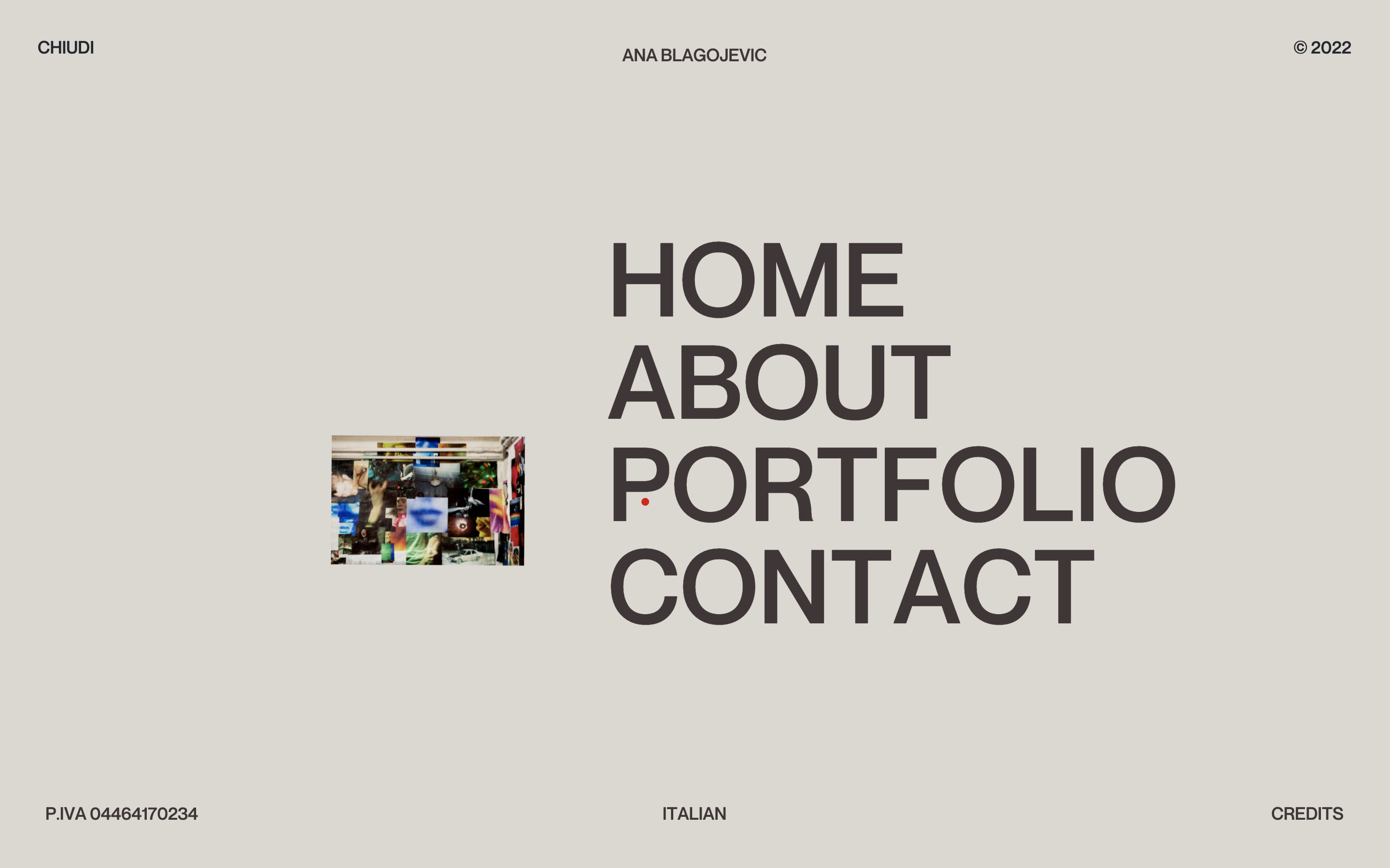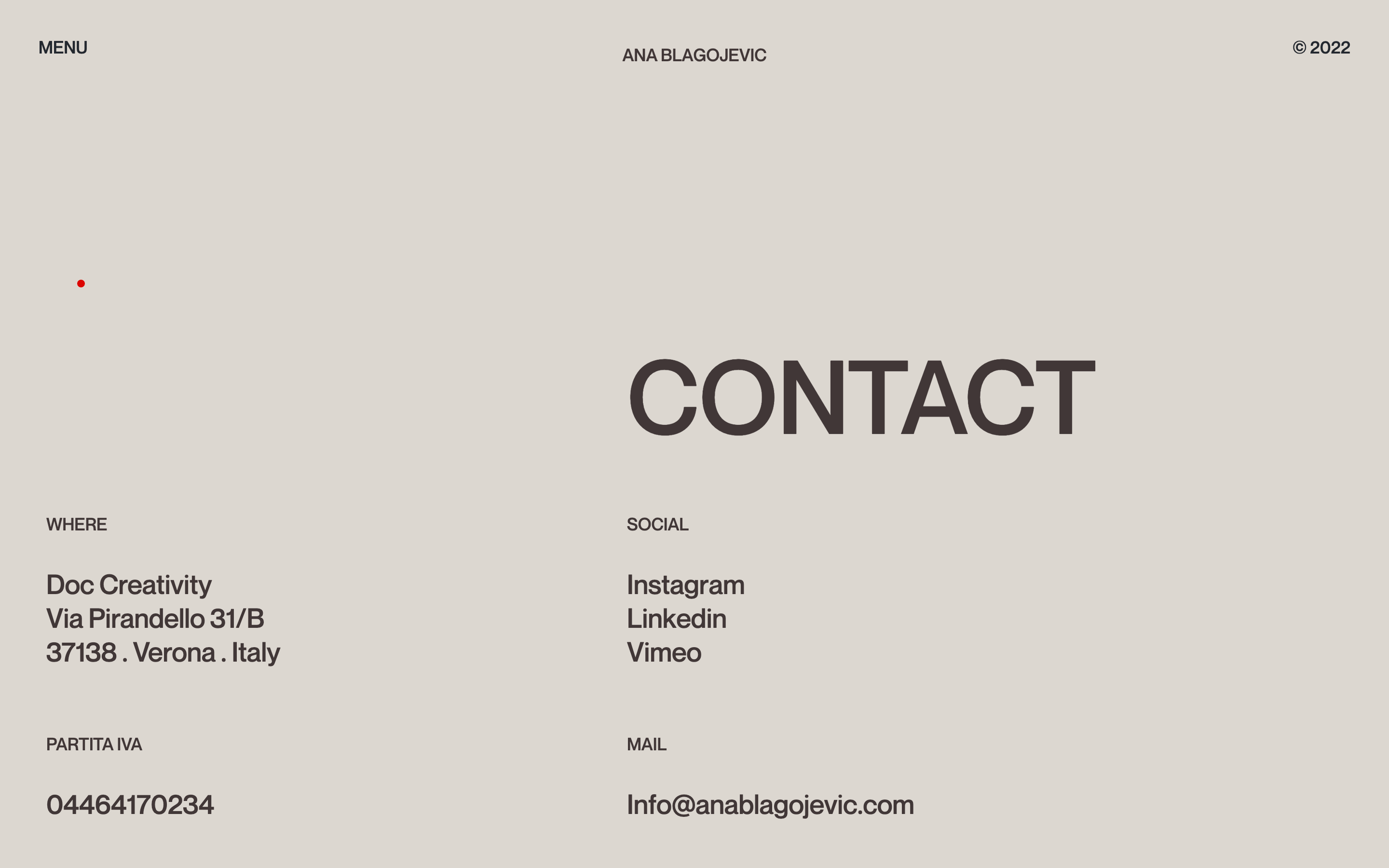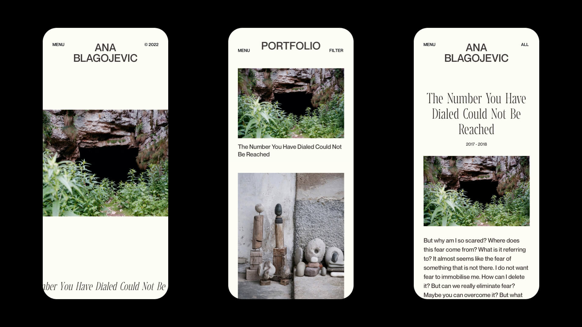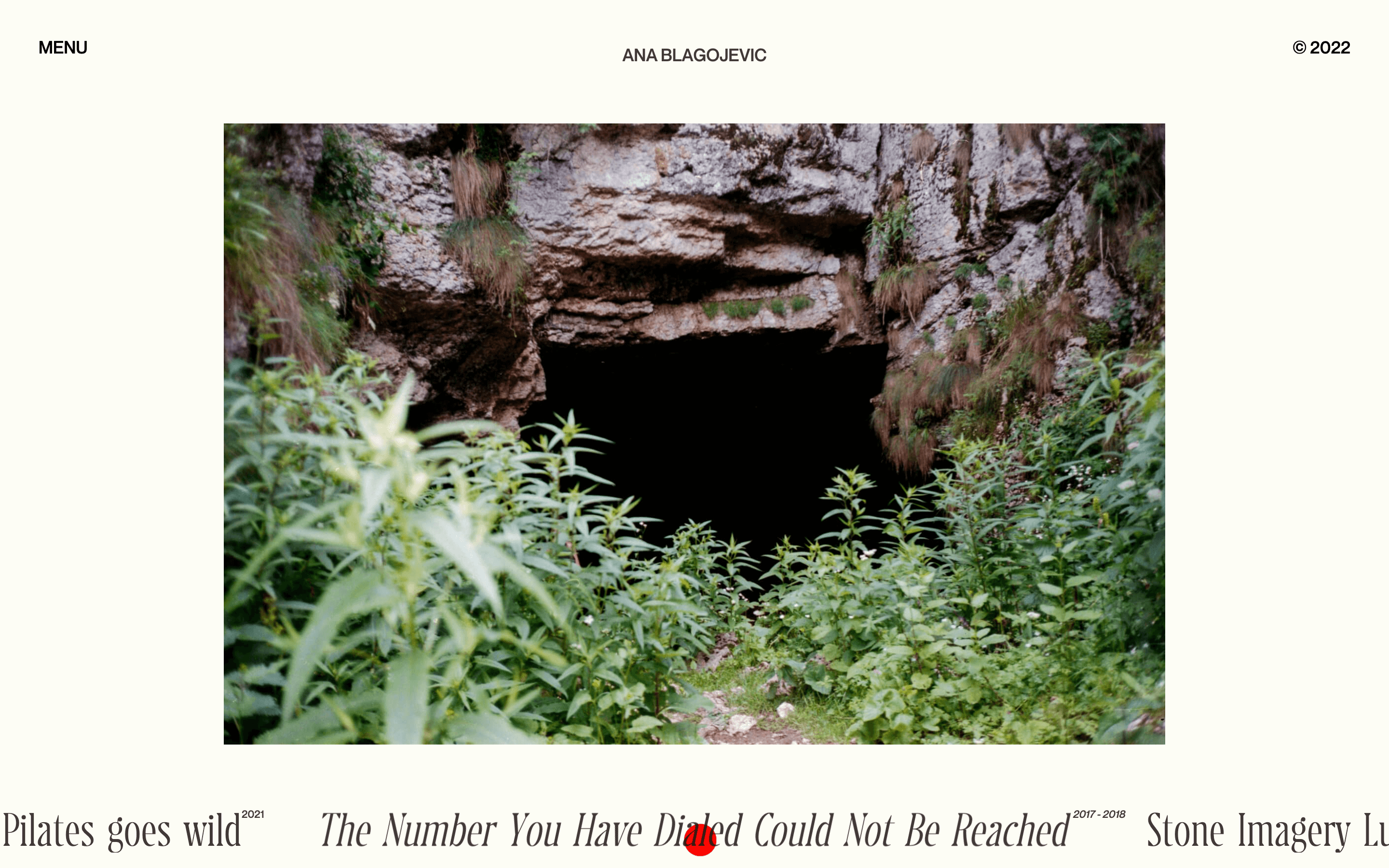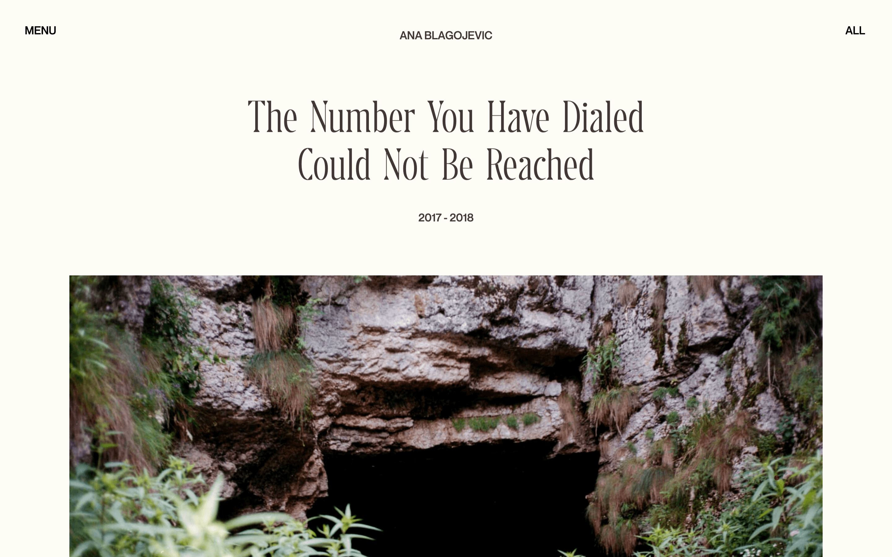 Ana Blagojevic website Contributed by Tomas Baruffaldi on Jul 25th, 2022. Artwork published in circa March 2022. Source: anablagojevic.com License: All Rights Reserved. Ana Blagojevic is an artist. A photographer, the kind who dares to tell the story in depth, searching, digging, travelling and going back to the roots. We have given space to her works by treating the site as an art gallery. We used Neue Montreal by Mat Desjardins and BC Steiner by Vojtěch Říha. Source: anablagojevic.com License: All Rights Reserved. Source: anablagojevic.com License: All Rights Reserved. Source: anablagojevic.com License: All Rights Reserved. Source: anablagojevic.com License: All Rights Reserved. Source: anablagojevic.com License: All Rights Reserved. Source: anablagojevic.com License: All Rights Reserved. Source: anablagojevic.com License: All Rights Reserved. Typefaces More about Neue MontrealGet Neue MontrealMore about SteinerGet Steiner Formats Web (5513) Mobile/Tablet (990) Topics Art (4565) Designers/Agencies ET Studio (10) Tomas Baruffaldi (13) Elettra Zuanazzi (9) Andrea Giuffrida (1) Tagged withwebsites (3468)photography (945)portfolios (752)minimalist (520)personal websites (259)menus (UI) (546)big type (1705)typeface combinations (3829) Artwork location Italy (955) Verona (19) Post a comment Name Email – will not be published Website Your response Submit Comment More Neue Montreal in use Club 772023Gabrielle WhiteContributed by Mario Julian Gutierrez Ruisseauville2022Théo PoyerContributed by Théo Poyer Ilios swimwear2023Caramba AgencyContributed by Caramba Agency Sponsor More in Art Eclipse. Jacqueline Doyen2012Delia KellerGestaltung BerlinContributed by Florian Hardwig Staff Pick Long Weekend by Giuseppe Licari2019In The Shade Of A TreeContributed by MA-MA Type THYPE2016Warriors StudioContributed by Benoît Bodhuin Steenbergen Stipendiumc. 2023DE_FORMContributed by Nick Losacco More in Web Fachman identityc. 2017Contributed by Pablo Balcells Olive & Co2025Kathlyn Jarvis DesignContributed by Kathlyn Jarvis At Olimpio’s grandmother – Ombre Lunghe album art2020Michele GalluzzoContributed by Michele Galluzzo Staff Pick CT021 Theater2021MintleyContributed by Alain Papazian More Fonts In Use Top Manta (2025 rebrand)2025Aleix FontContributed by Gerard Sierra Staff Pick Les 2 Scènes, saison 2012–20132012Thomas Huot-MarchandContributed by 205TF Staff Pick Русские Дневники / Russian Diaries2020Christoffer LekaKaisa LekaTeo TuominenContributed by Christoffer Leka Staff Pick Tame Impala – Currents (and singles) album art2015Robert BeattyContributed by Stephen Coles Staff Pick