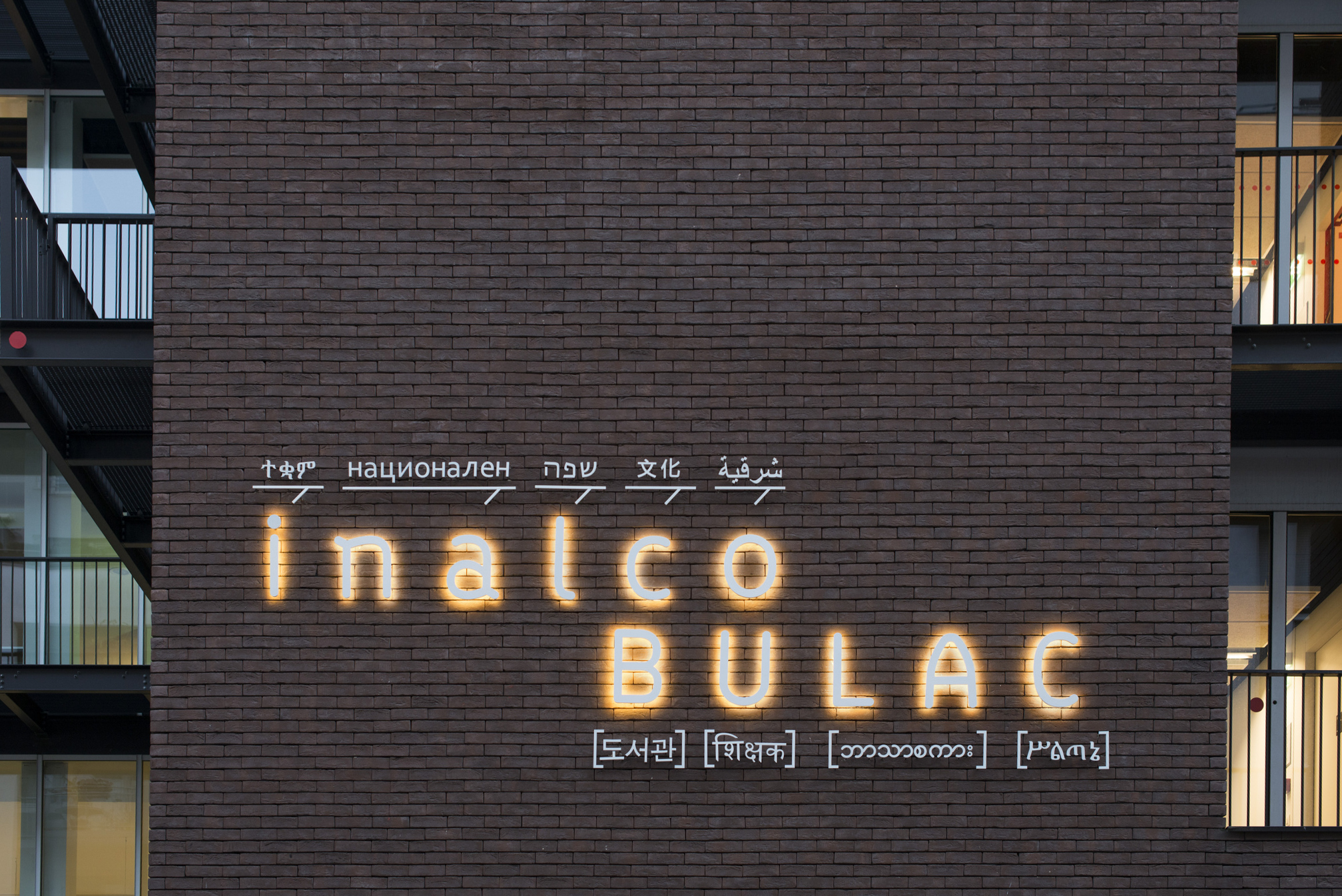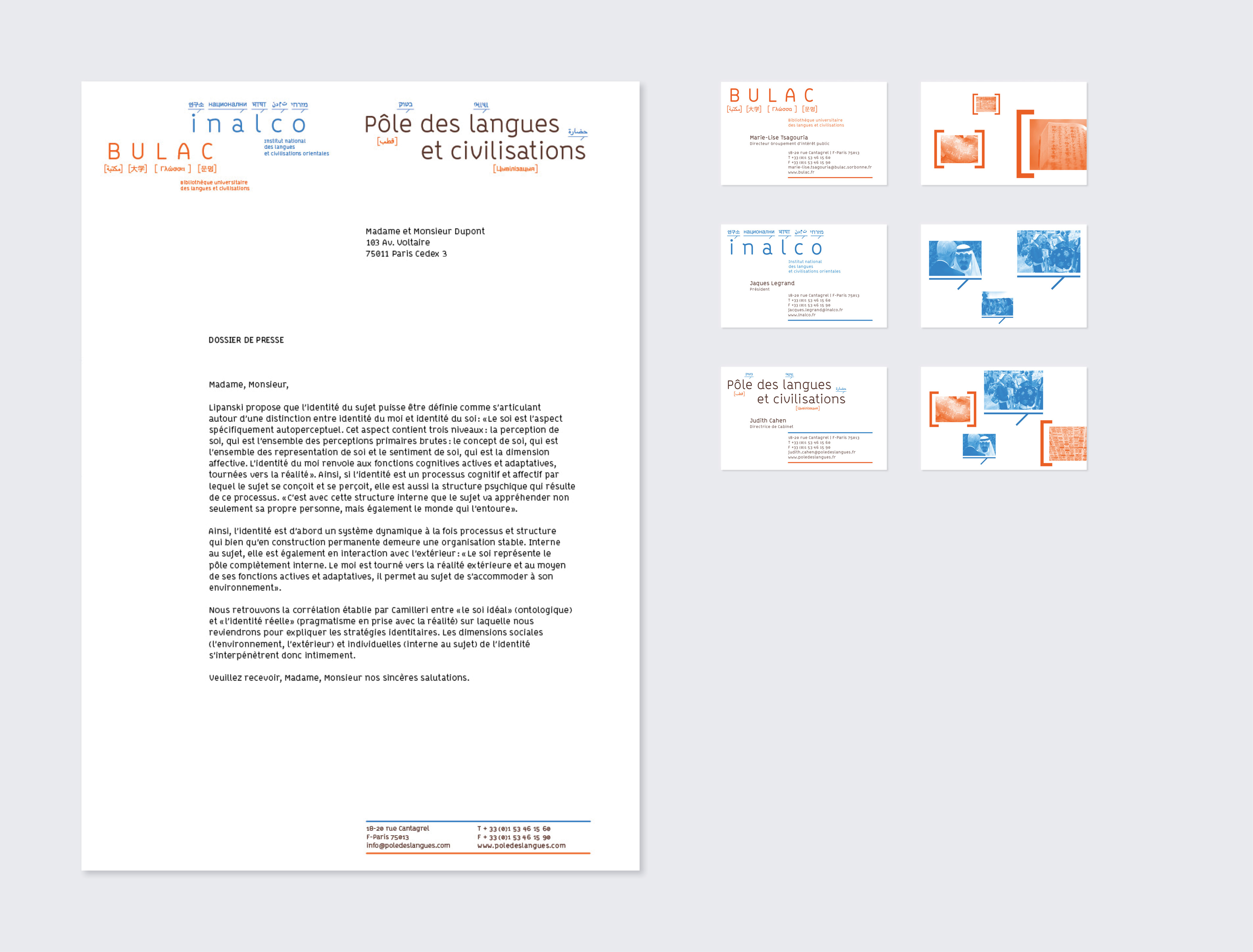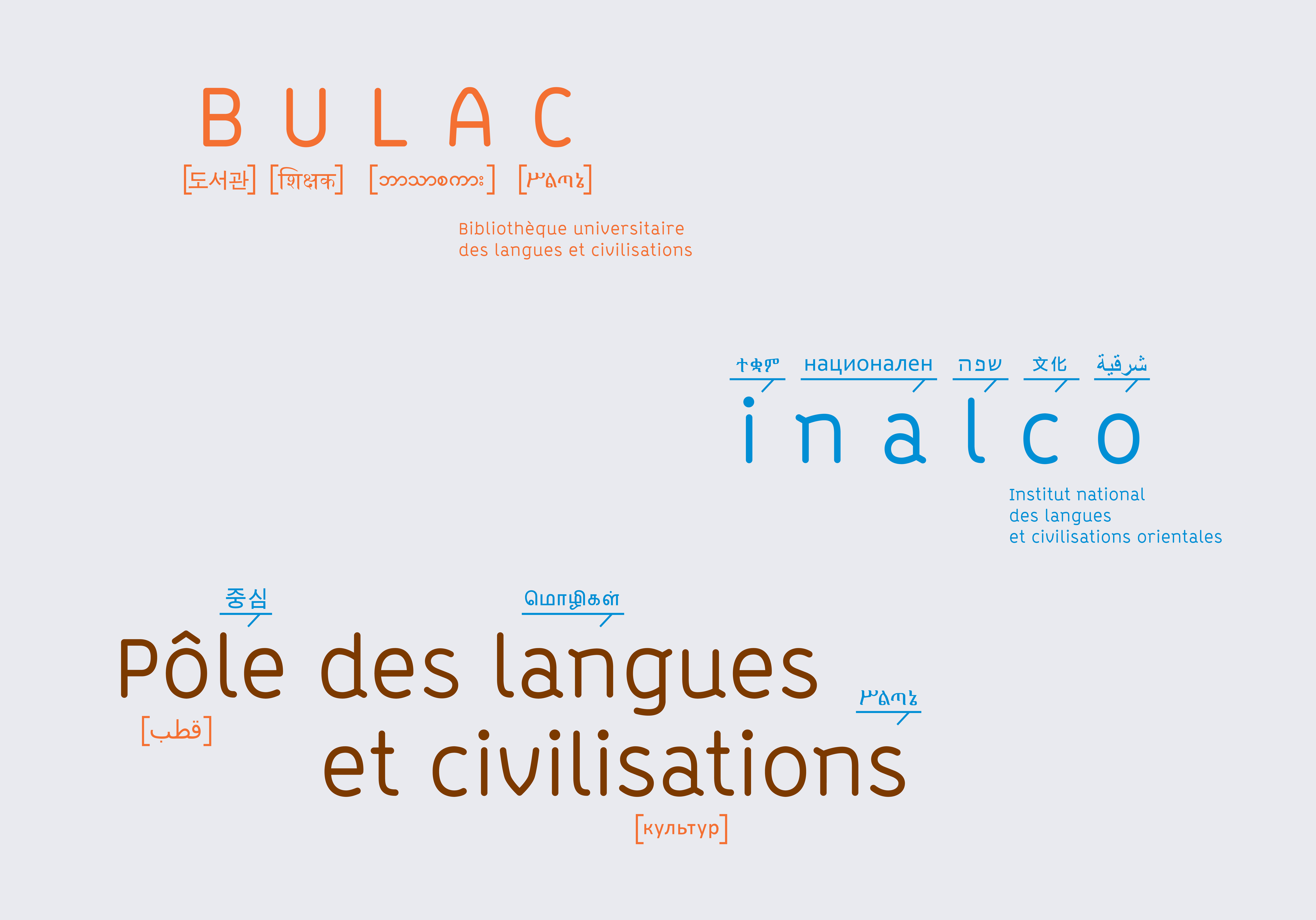 In 2010, Baldinger•Vu-Huu won the competition for the creation of three new visual identities for the institutions inalco (institut national des langues et civilisations orientales), the BULAC (Bibliothèque Universitaire des Langues et Civilisations), and the Pôle des langues. Their visual identity project is based on a modular system with a common base. The main subject of languages and cultures is supported by the use of translations in scripts from different cultures, and by the iconography that complements and accompanies these scripts. The two logos of Bulac and Inalco each exist in a set of three variants with different translations. These sets of logos and the translation sets also present in the applications thus represent the panel of more than 90 languages present at the Language Center. For this identity, they used BVH BLine.