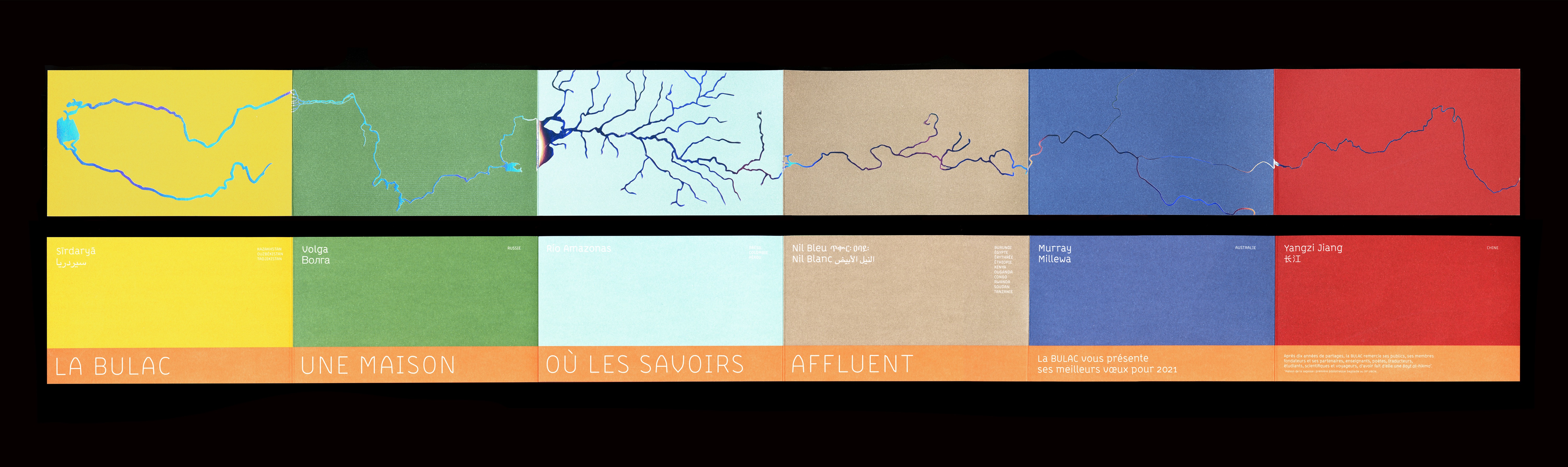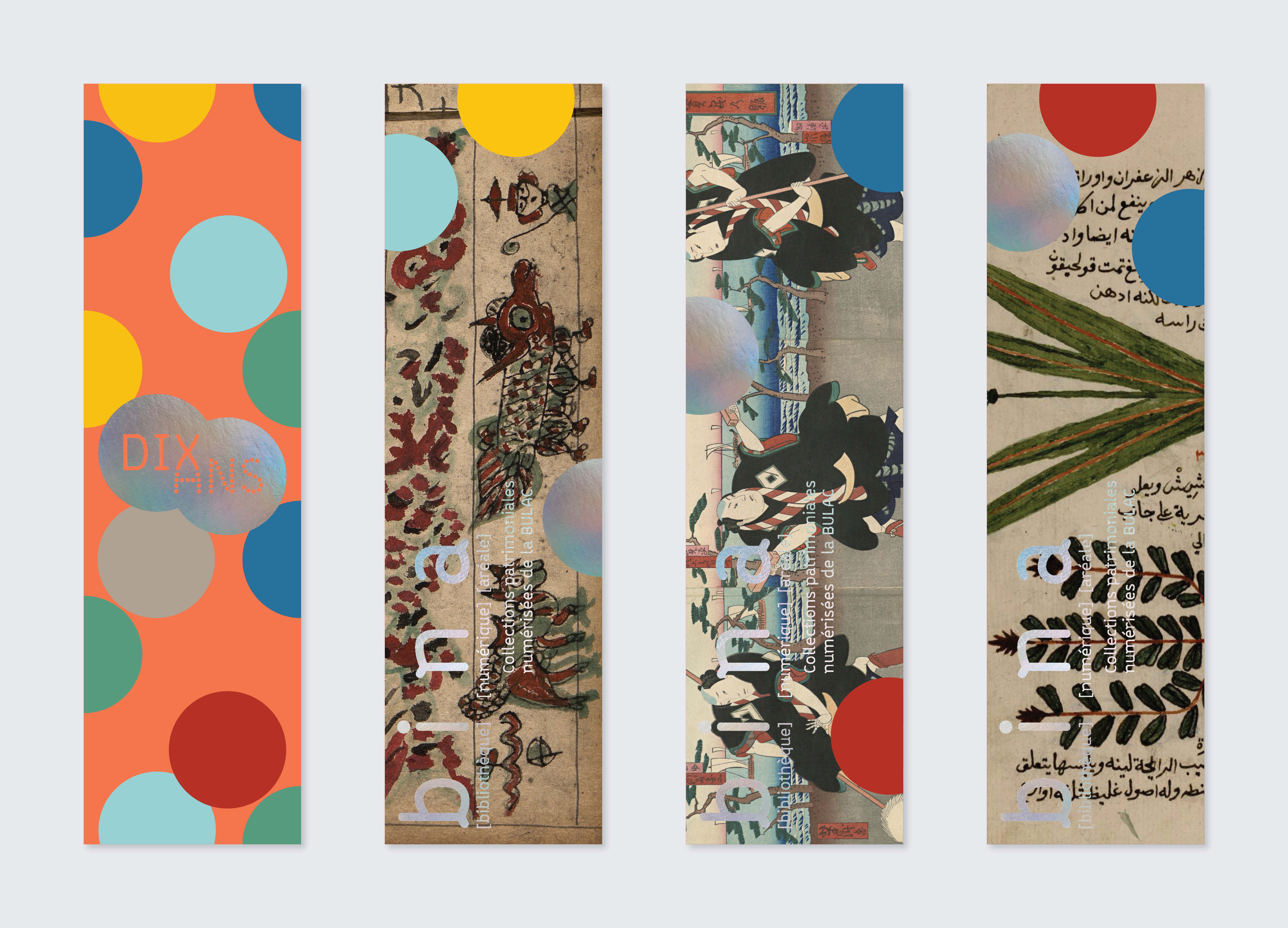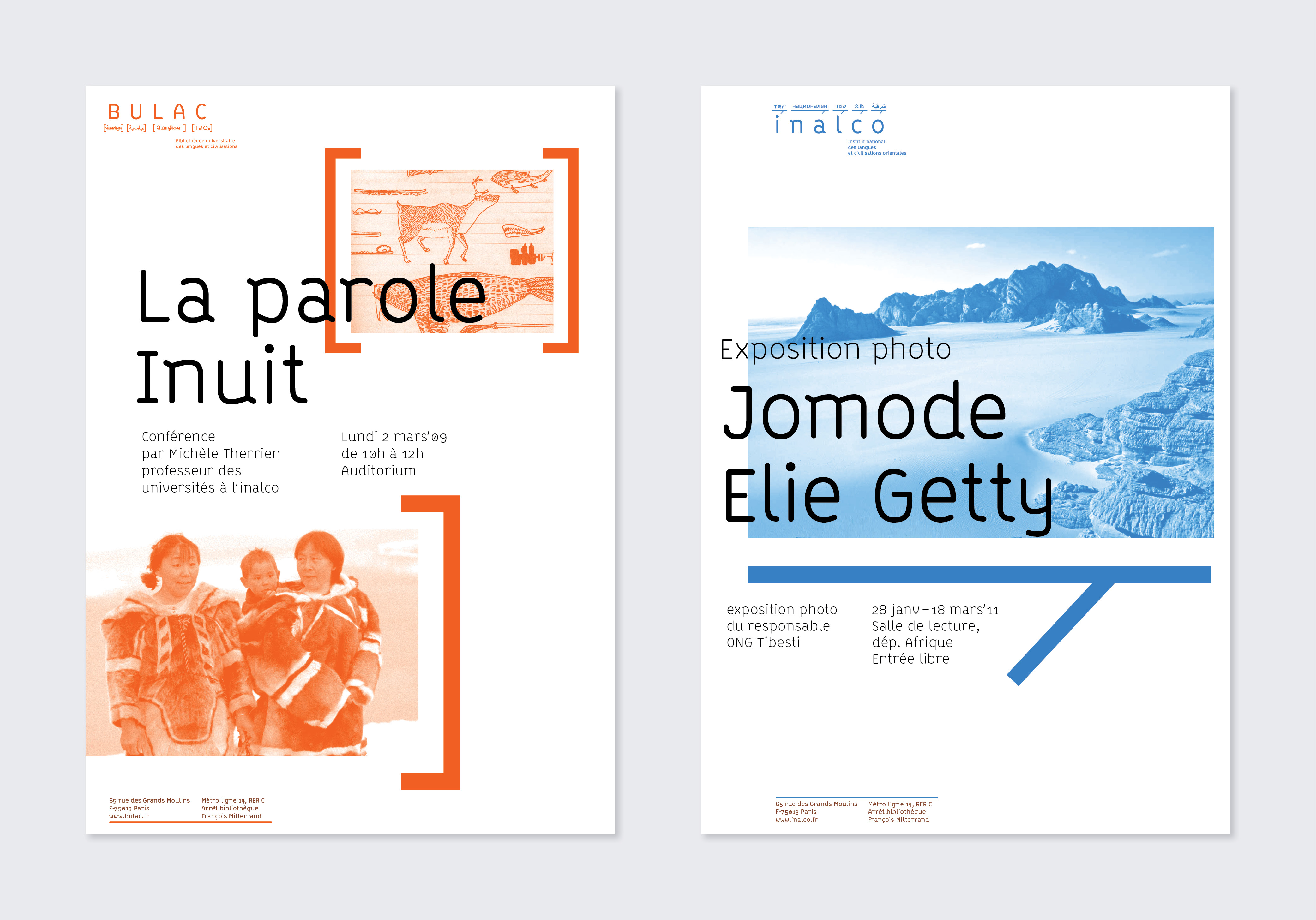 In 2010, Baldinger•Vu-Huu won the competition for the creation of three new visual identities for the institutions inalco (institut national des langues et civilisations orientales), the BULAC (Bibliothèque Universitaire des Langues et Civilisations), and the Pôle des langues. Their visual identity project is based on a modular system with a common base. The main subject of languages and cultures is supported by the use of translations in scripts from different cultures, and by the iconography that complements and accompanies these scripts. The two logos of Bulac and Inalco each exist in a set of three variants with different translations. These sets of logos and the translation sets also present in the applications thus represent the panel of more than 90 languages present at the Language Center. For this identity, they used BVH BLine.