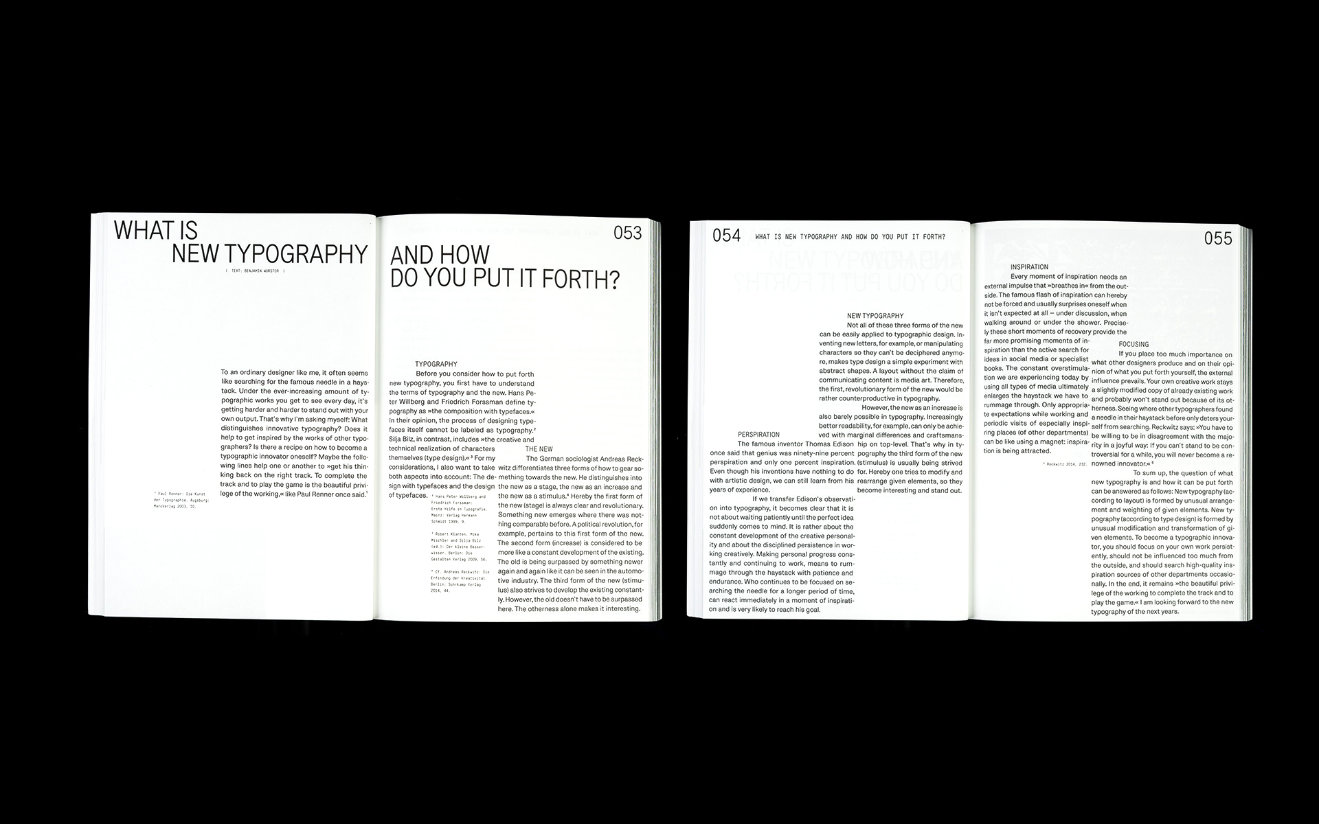 The Bachelor thesis Perspectives on Typography was created by Inga Paulussen at Münster School of Design. The fonts in use are G2 Erika, G2 Erika Mono, and Protokoll.