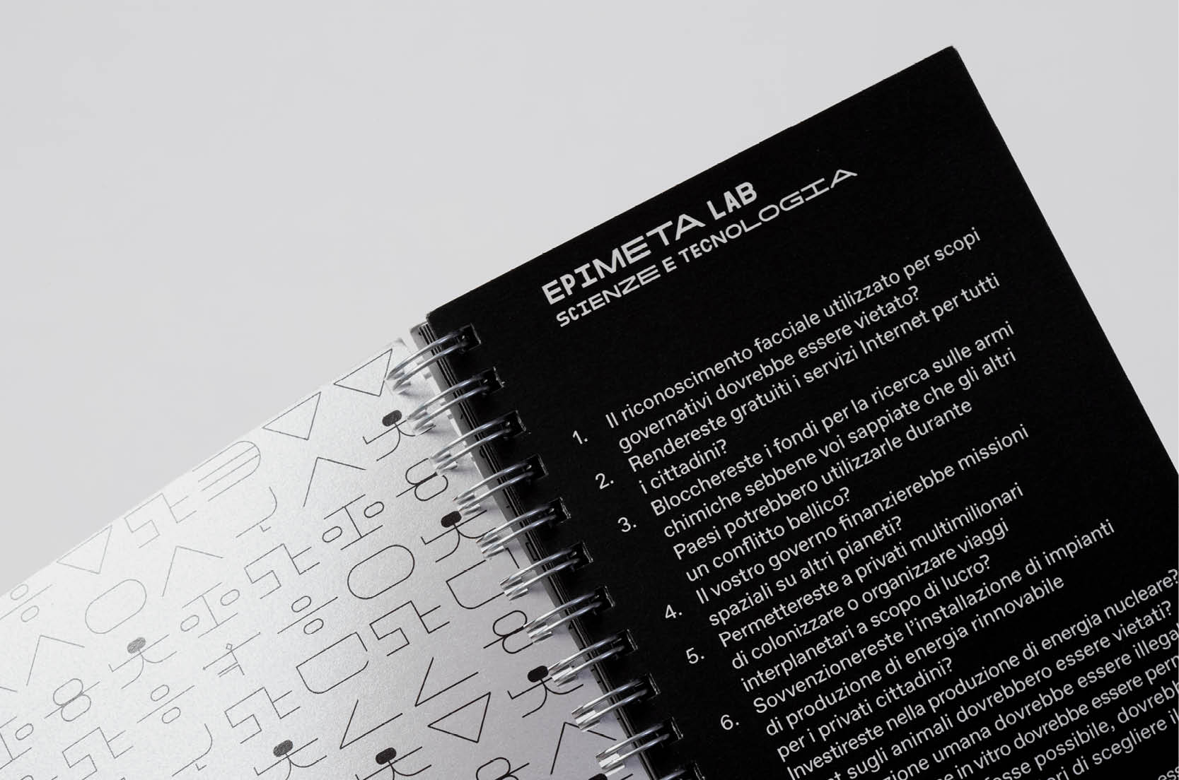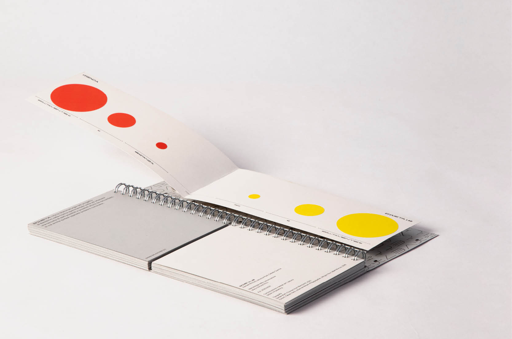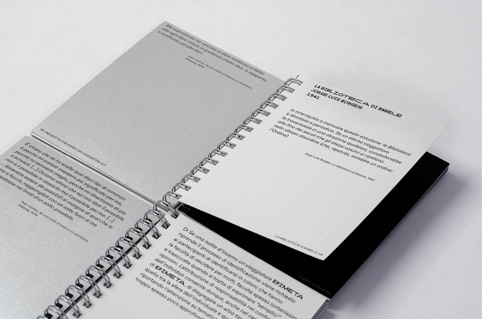 Multiple widths of Garaje are mixed and used for the headlines of the Epimeta publication, with ABC Favorit used for paragraphs with text set either upright or italic.