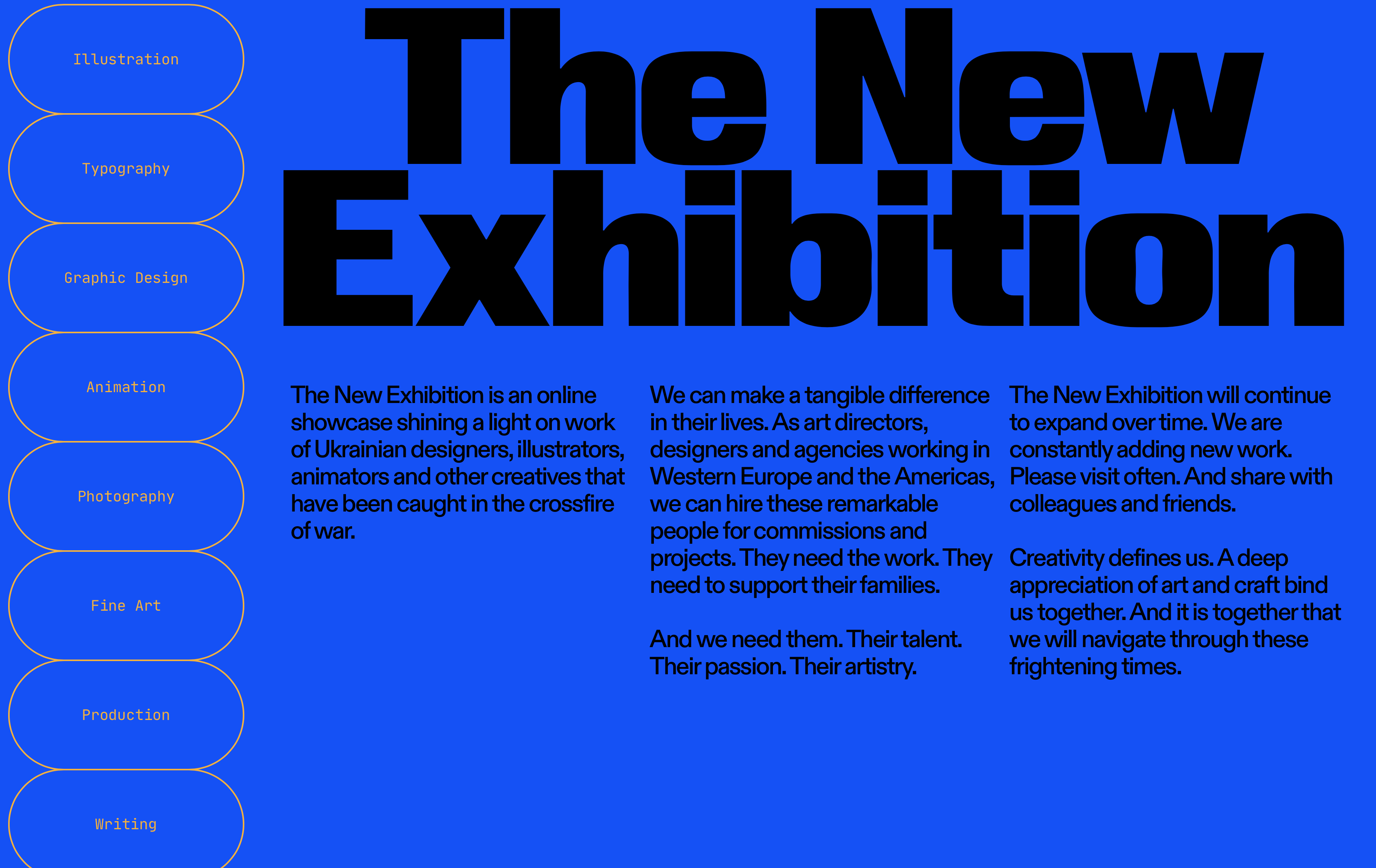 The New Exhibition is an online showcase shining a light on work of Ukrainian designers, illustrators, animators and other creatives that have been caught in the crossfire of war. (…) The New Exhibition is an expanding project. We will constantly be adding new work that showcases a growing list of Ukrainian talents.
