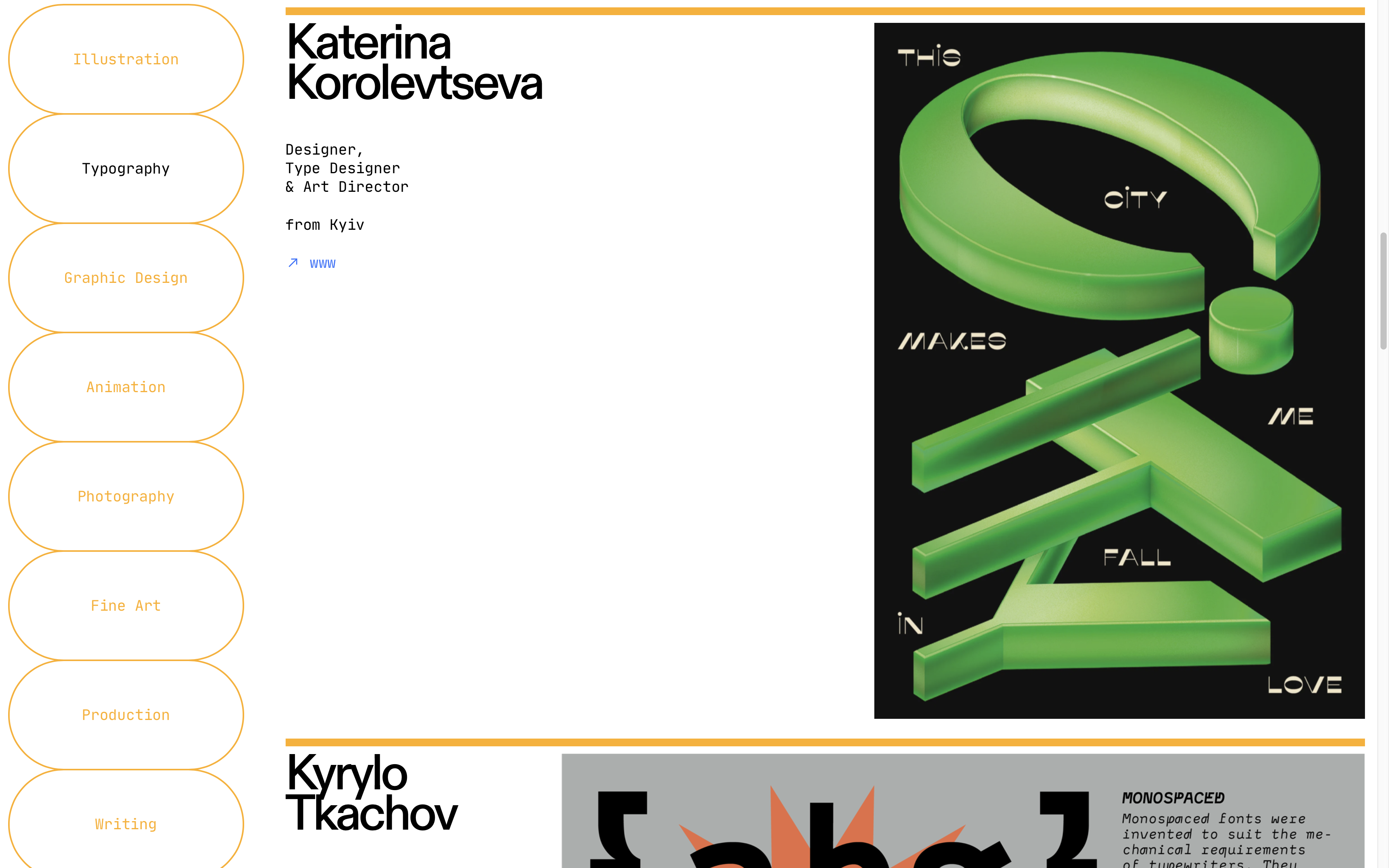 The typography for this growing online archive / portfolio collection starts off with a massive headline set in KTF Rublena from Kyiv Type Foundry; the monospaced sans used for information and the menu is JetBrains Mono, designed for a tech company by Philipp Nurullin and Konstantin Bulenkov. The grotesk used for maker’s names and the about texts has no direct (geographic) relation with Ukraine or Russia, it is Diatype from Dinamo.