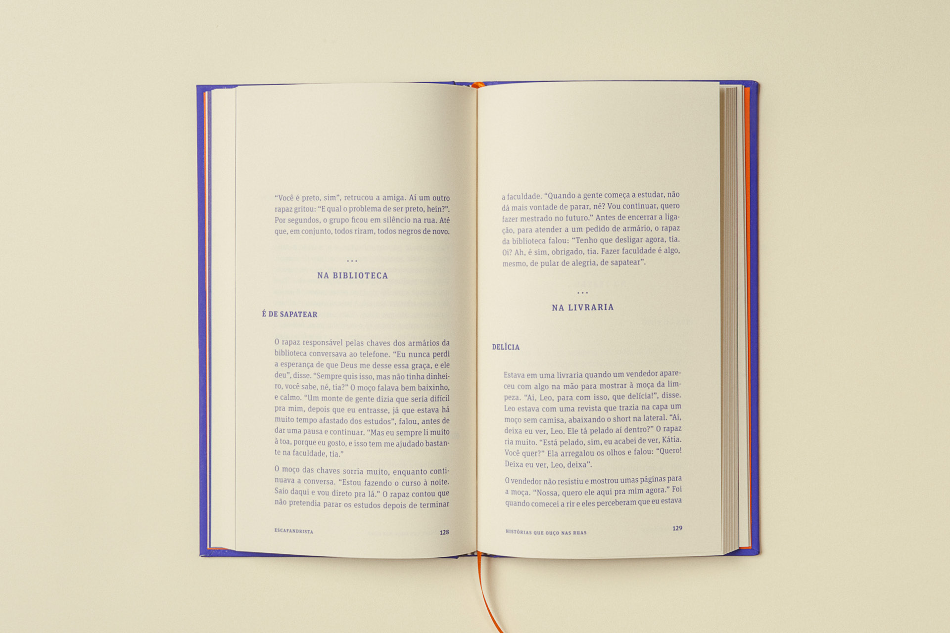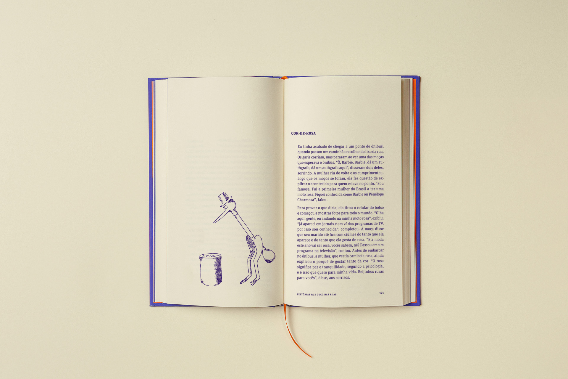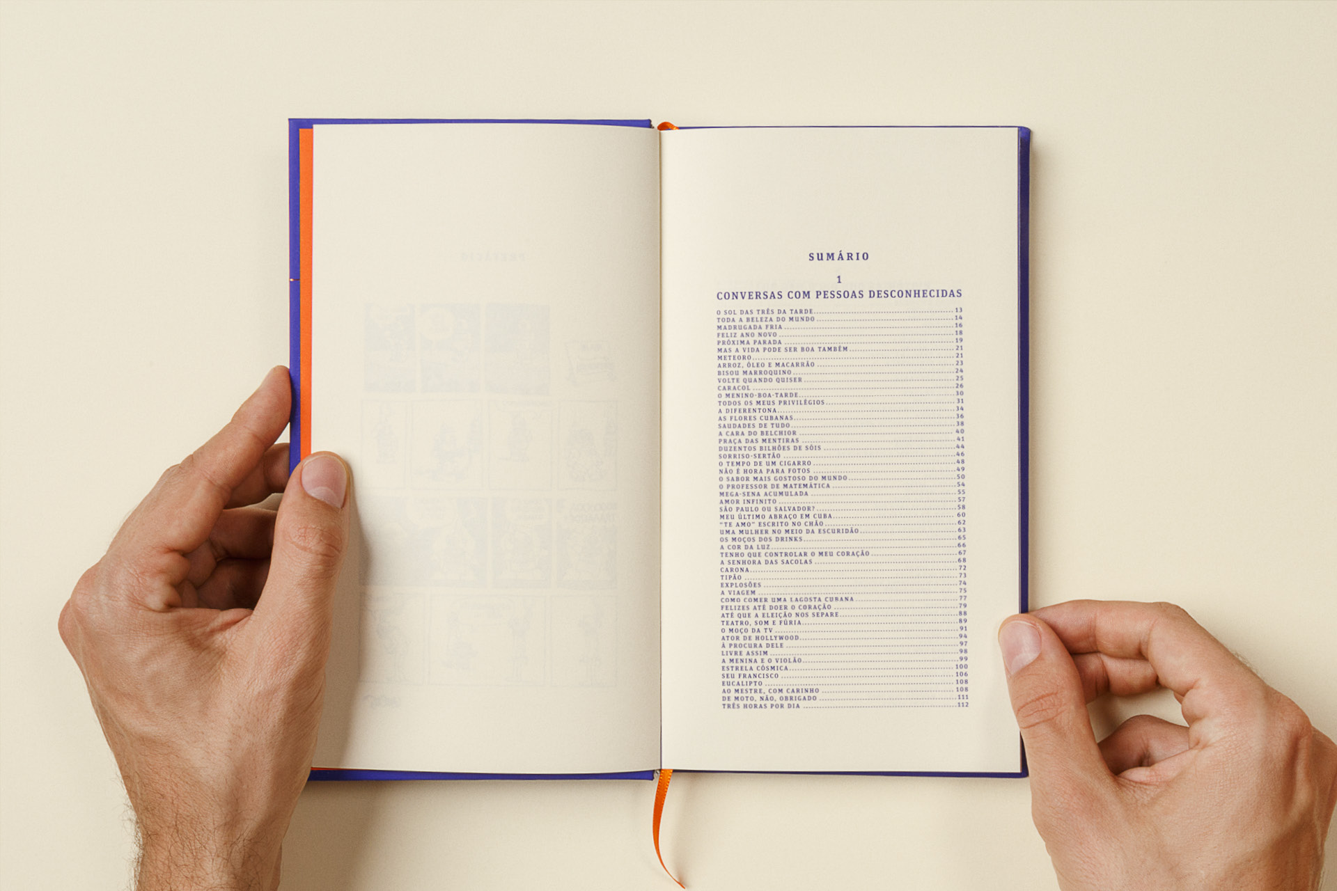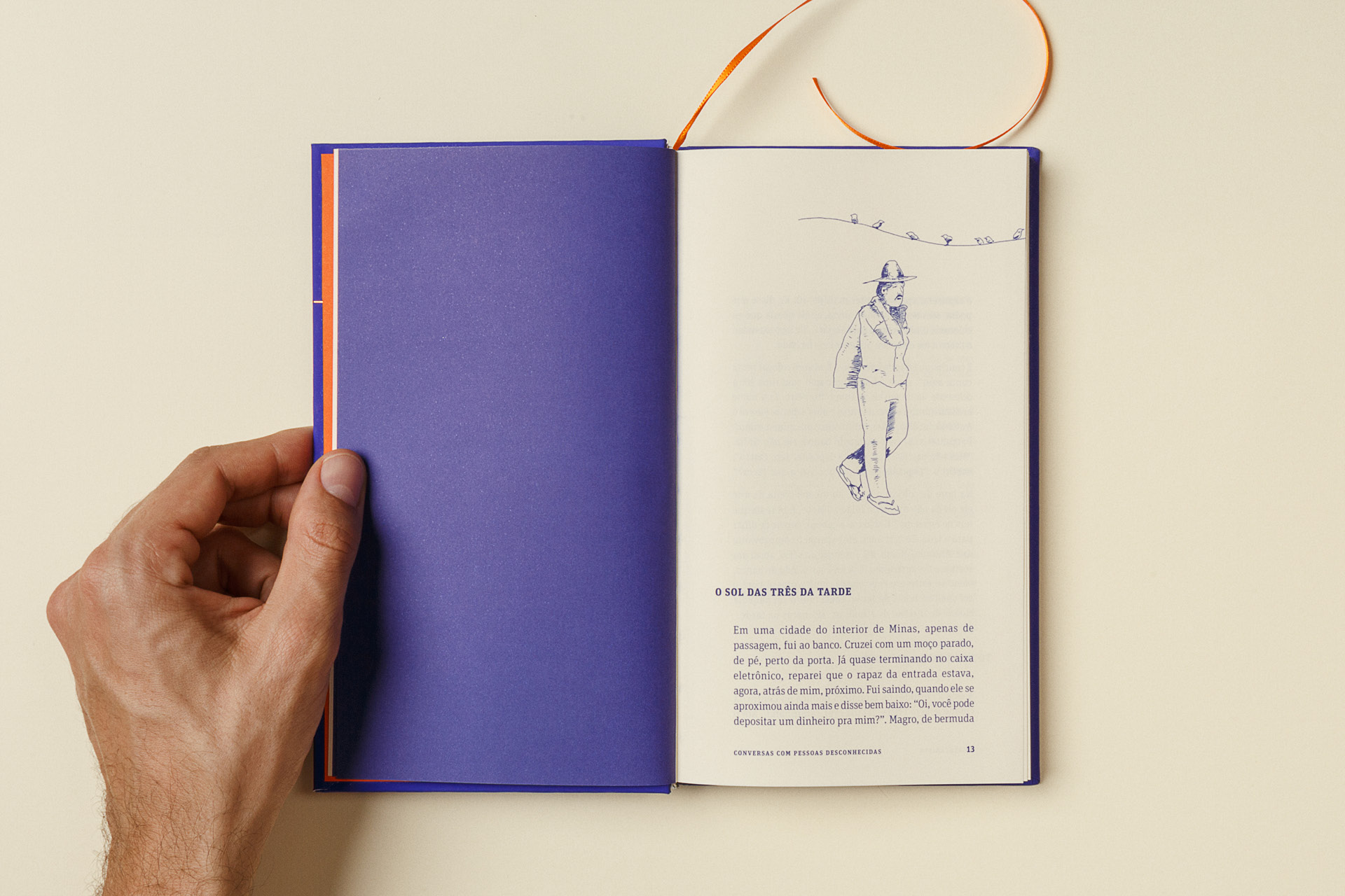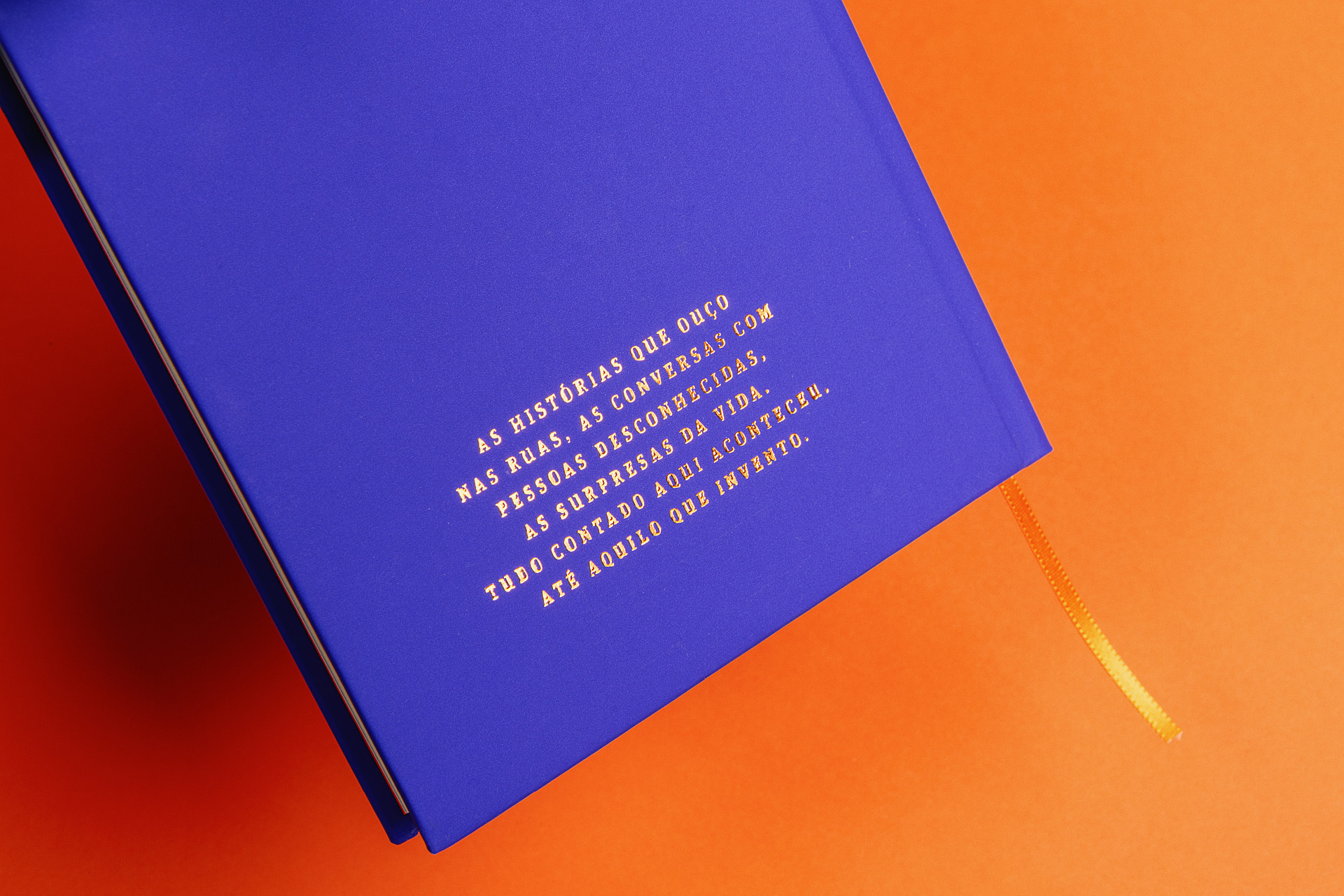 Like a scuba diver, the author is an investigator and lives in the depths, a place where he finds the subtleties and poetry of everyday stories. In graphic design, this dive is represented by the striking presence of blue on the cover as a counterpoint to the title in Gloucester aligned with the base of the book. For the text, FF Unit Slab was used, with square serifs, making an allusion to intimate writing on typewriters. The project was entirely printed in Pantone 072U.