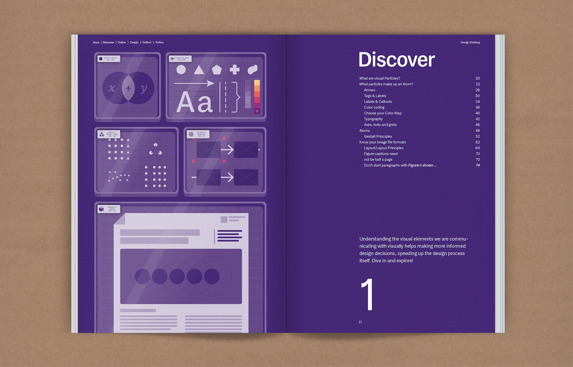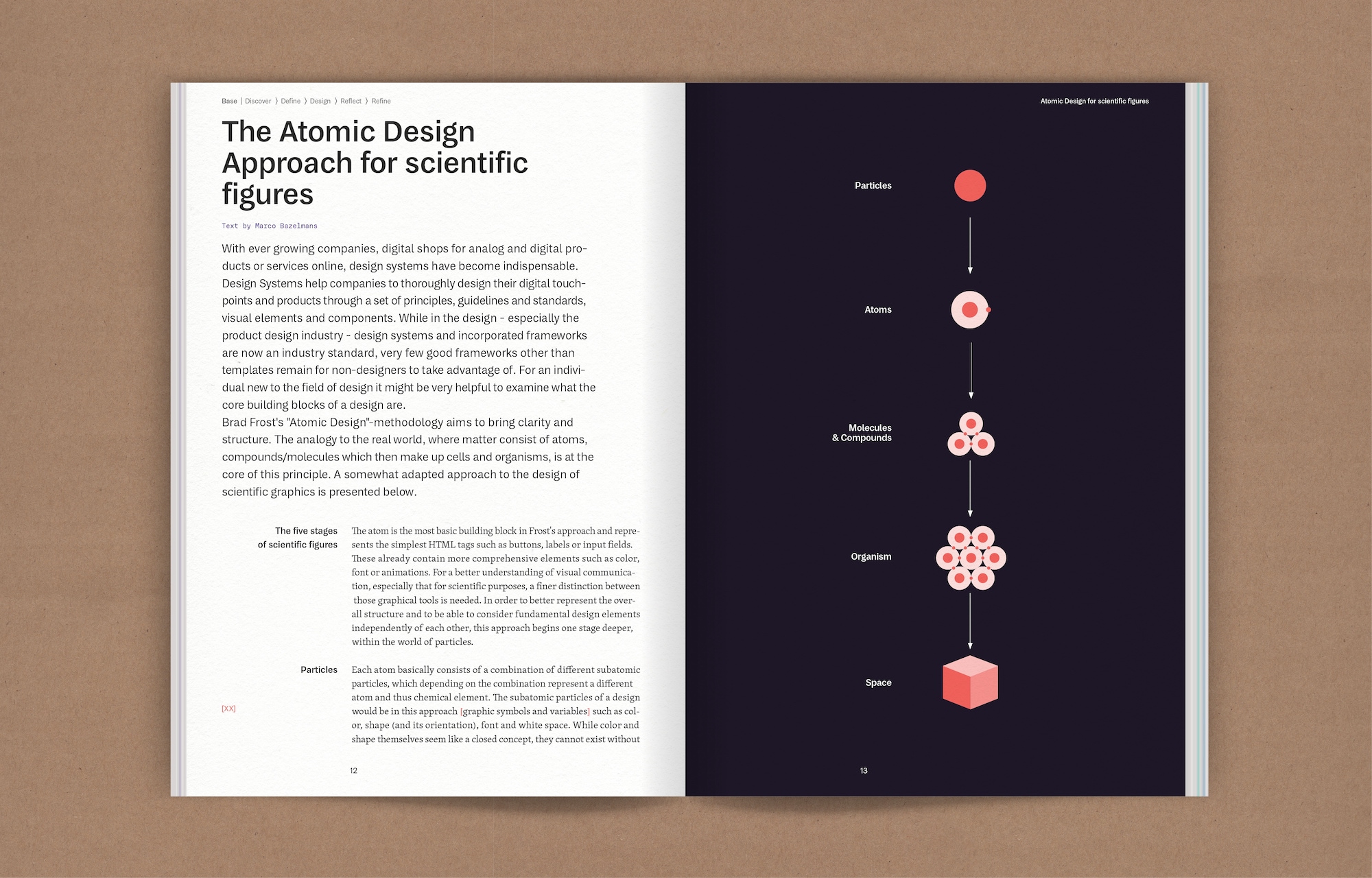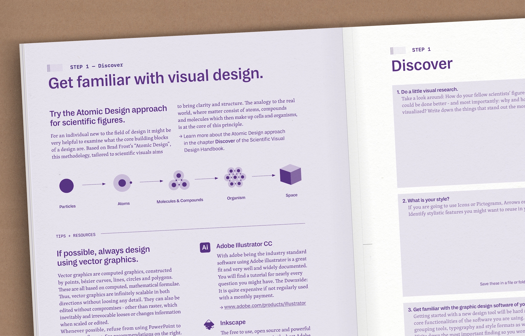 The Scientific Visual Design Handbook and Workbook offer a theoretical as well as a practical introduction to the basics of visual communication for scientific graphics and visualisations. In a concise format, the project aims to help scientists with the creation of their visuals. With Atomic Design for scientific graphics, the first chapter of the Handbook begins with a clear overview of the toolbox of visual components and important design basics. Based on the Atomic Design approach for web design – rethought and adapted for scientific visualisations.