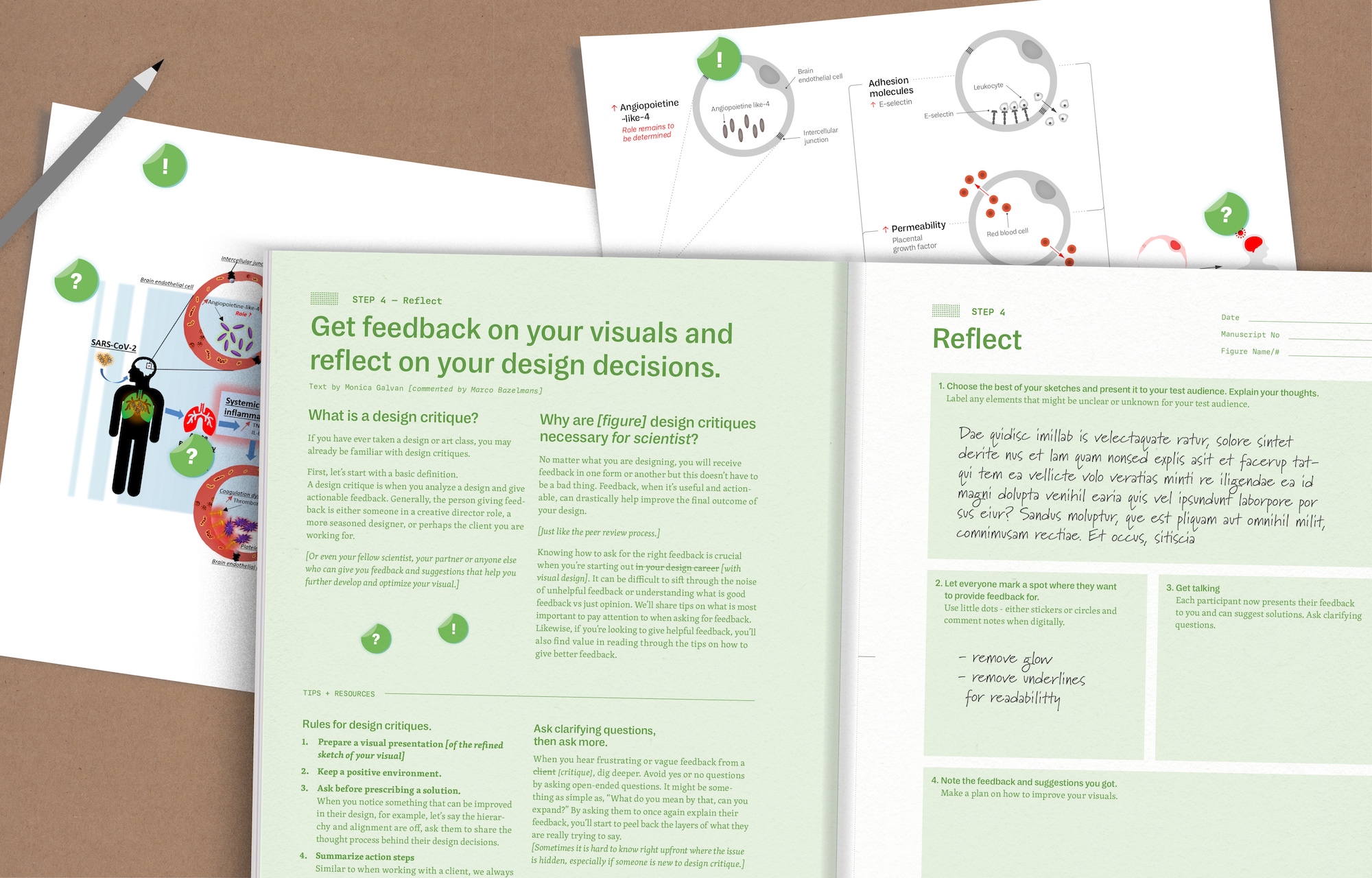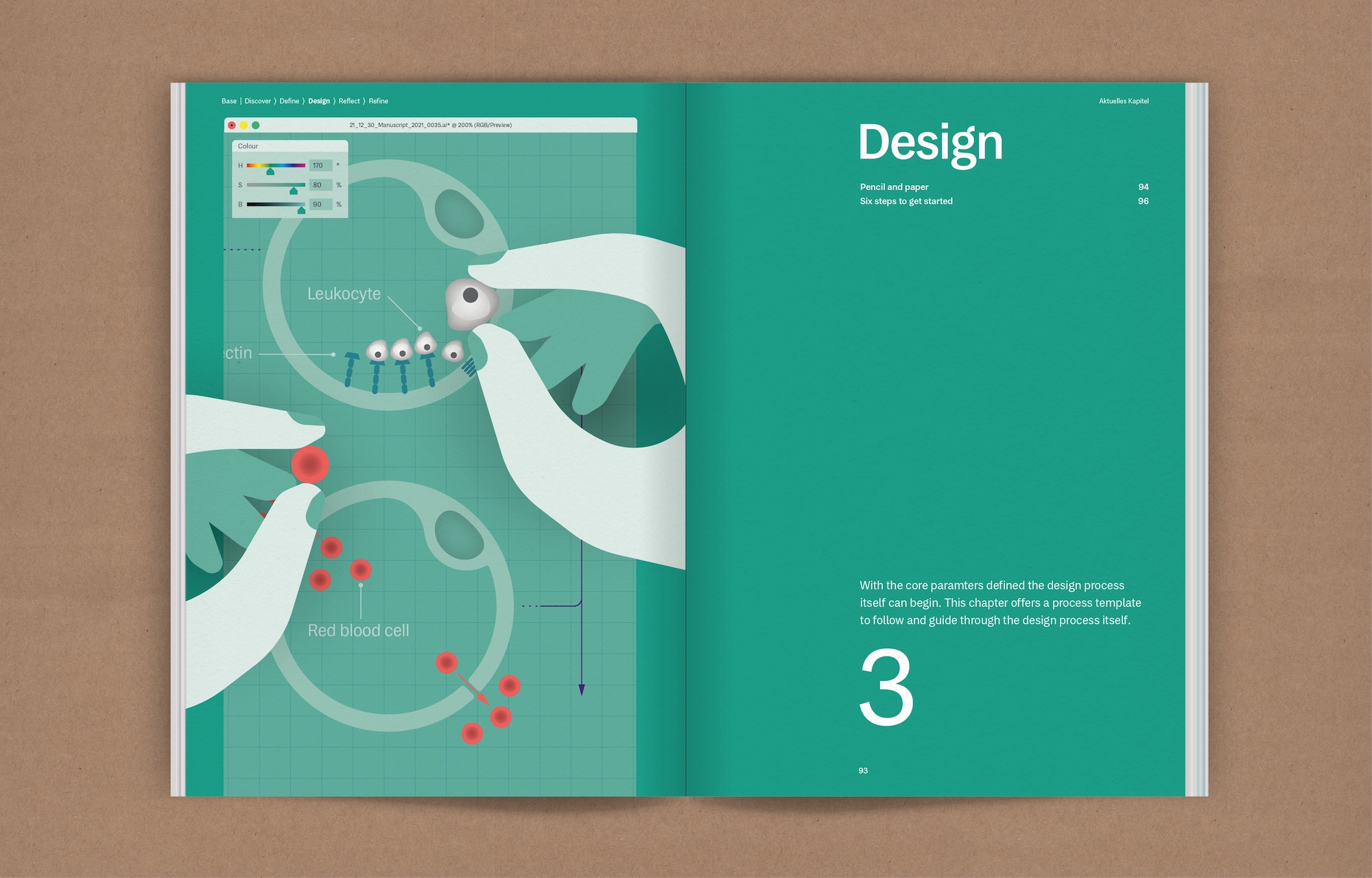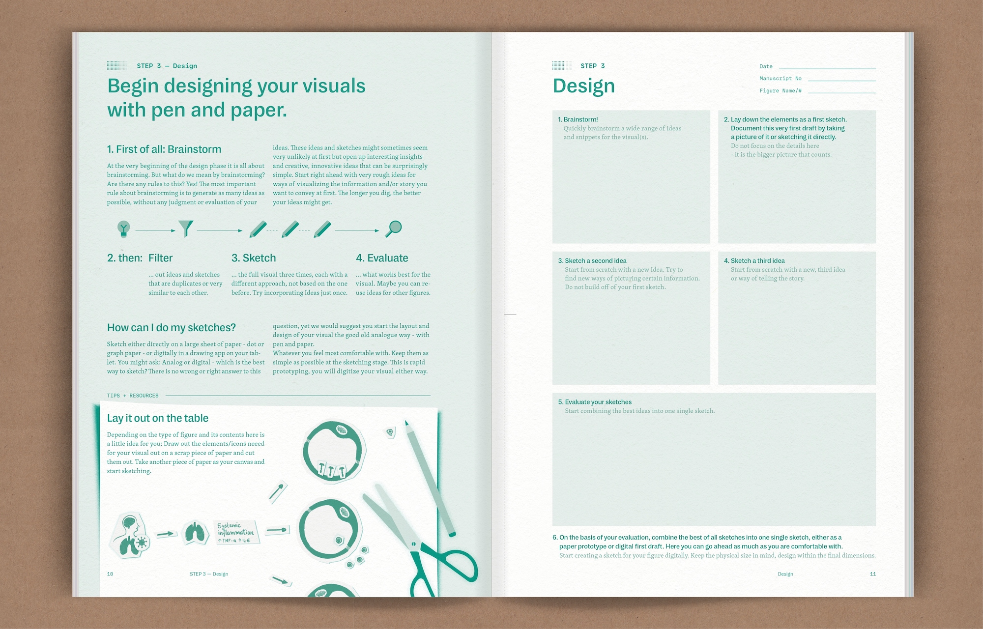 The overarching “Design Thinking for Scientific Graphics” maps an exemplary conceptual design process that scientists can follow for the creation of their graphics. This design thinking process is made up of five stages, each represented with an illustration for the chapter openings.