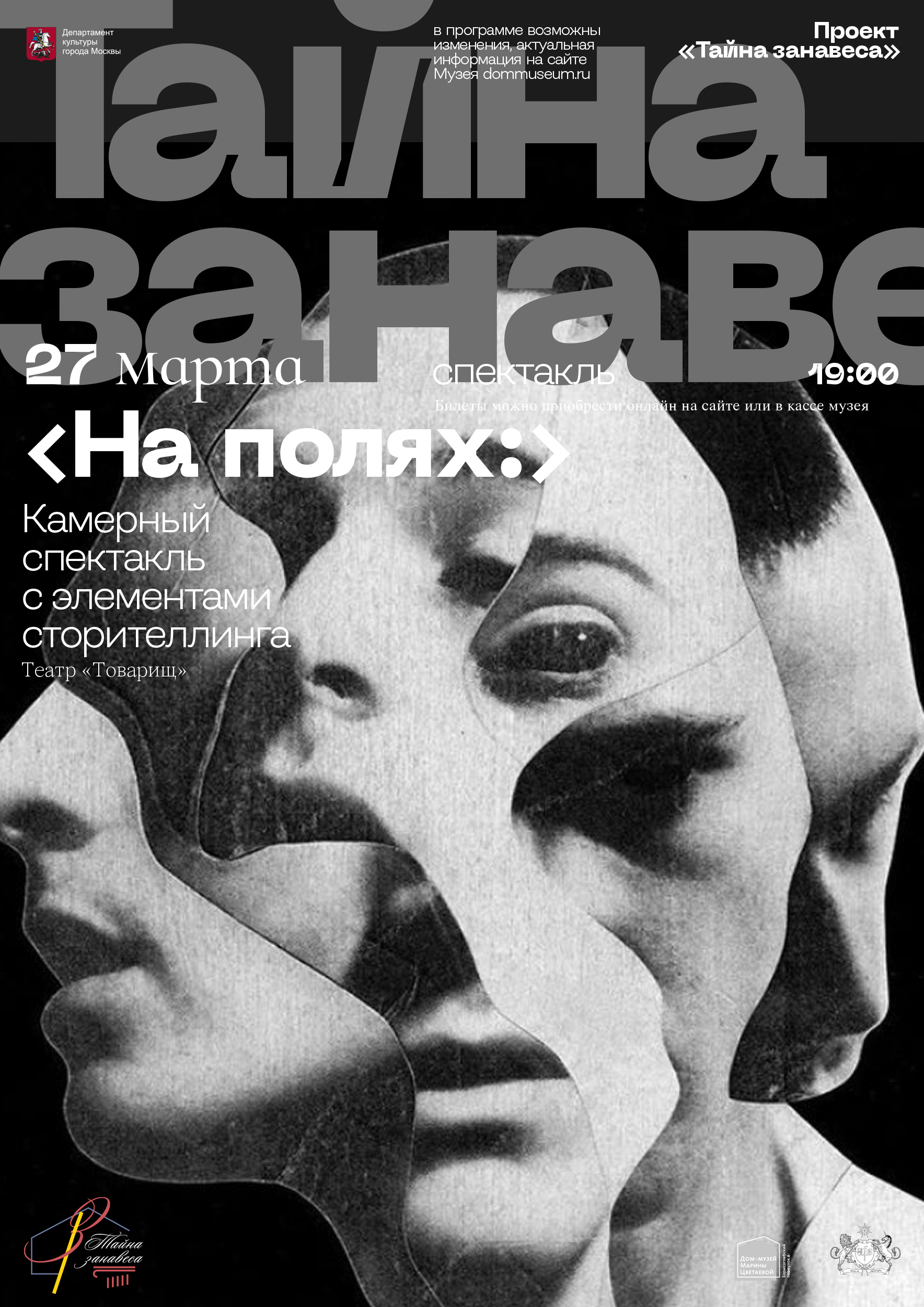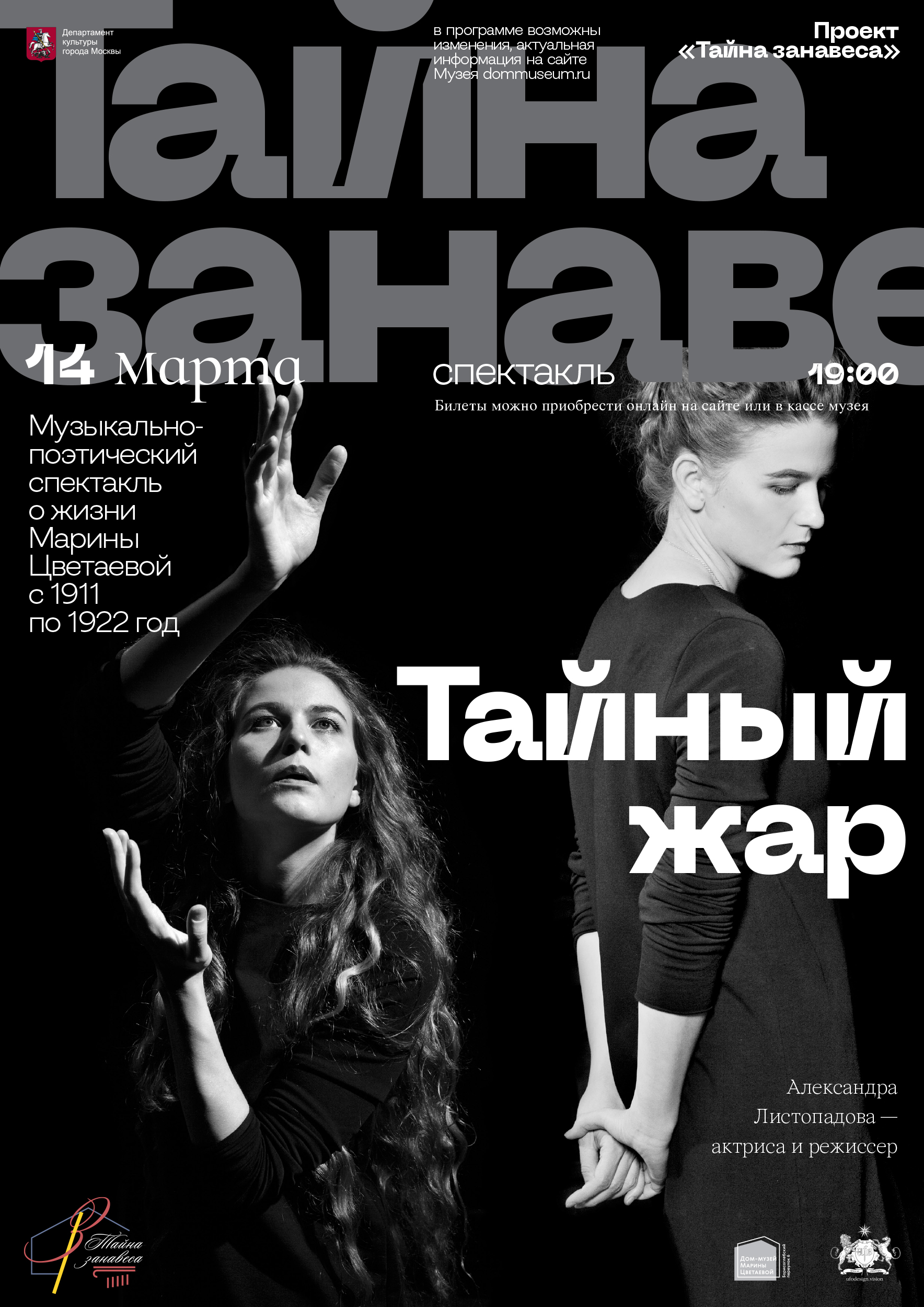 Тайна занавеса (The Mystery of the Curtain) was a special several-week long theatrical event at the Marina Tsvetayeva’s House Museum in Moscow. It began in February 2020 and was supposed to run until early April, but the Covid-19 pandemic cut it short. Shown here are the posters designed for the event.
