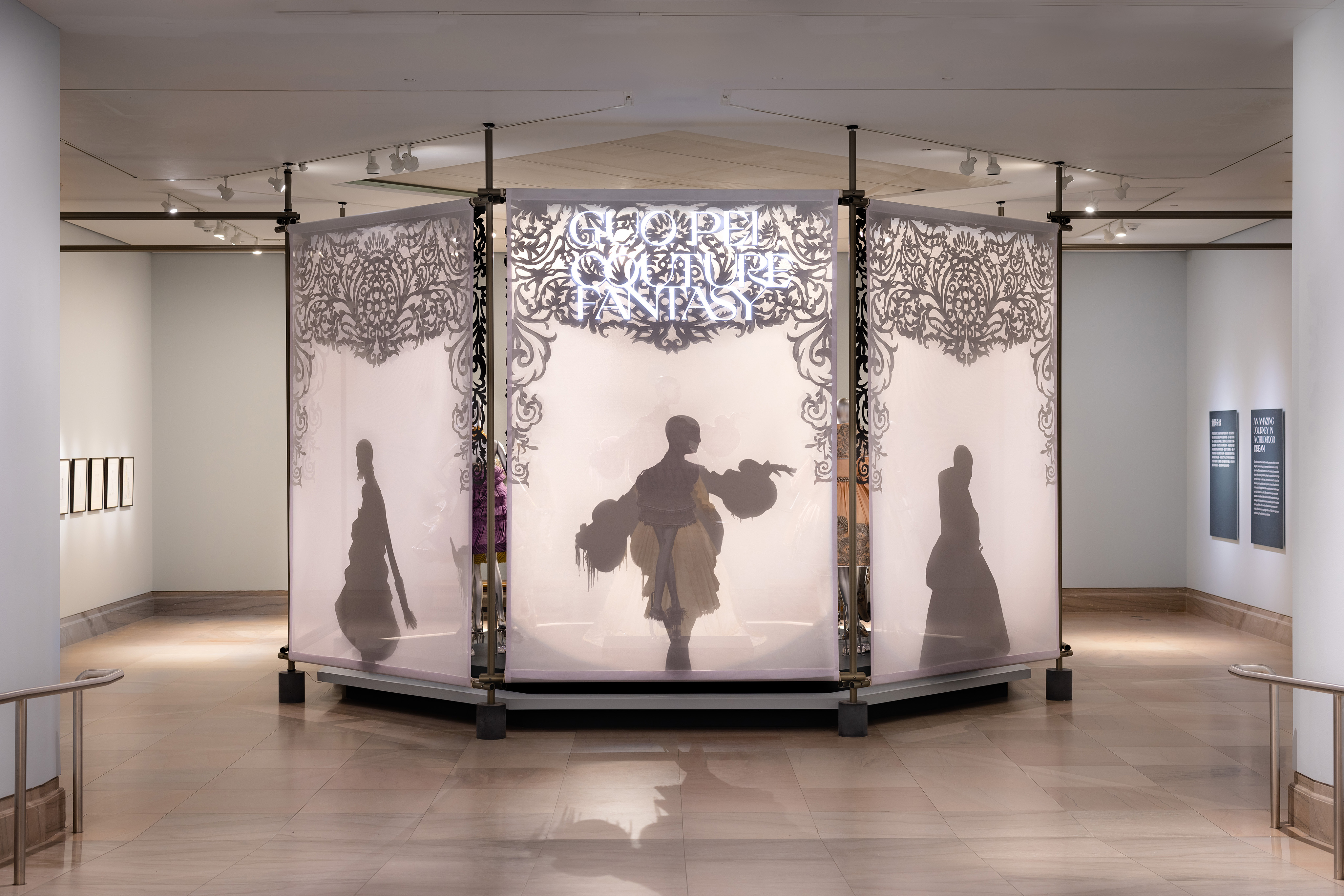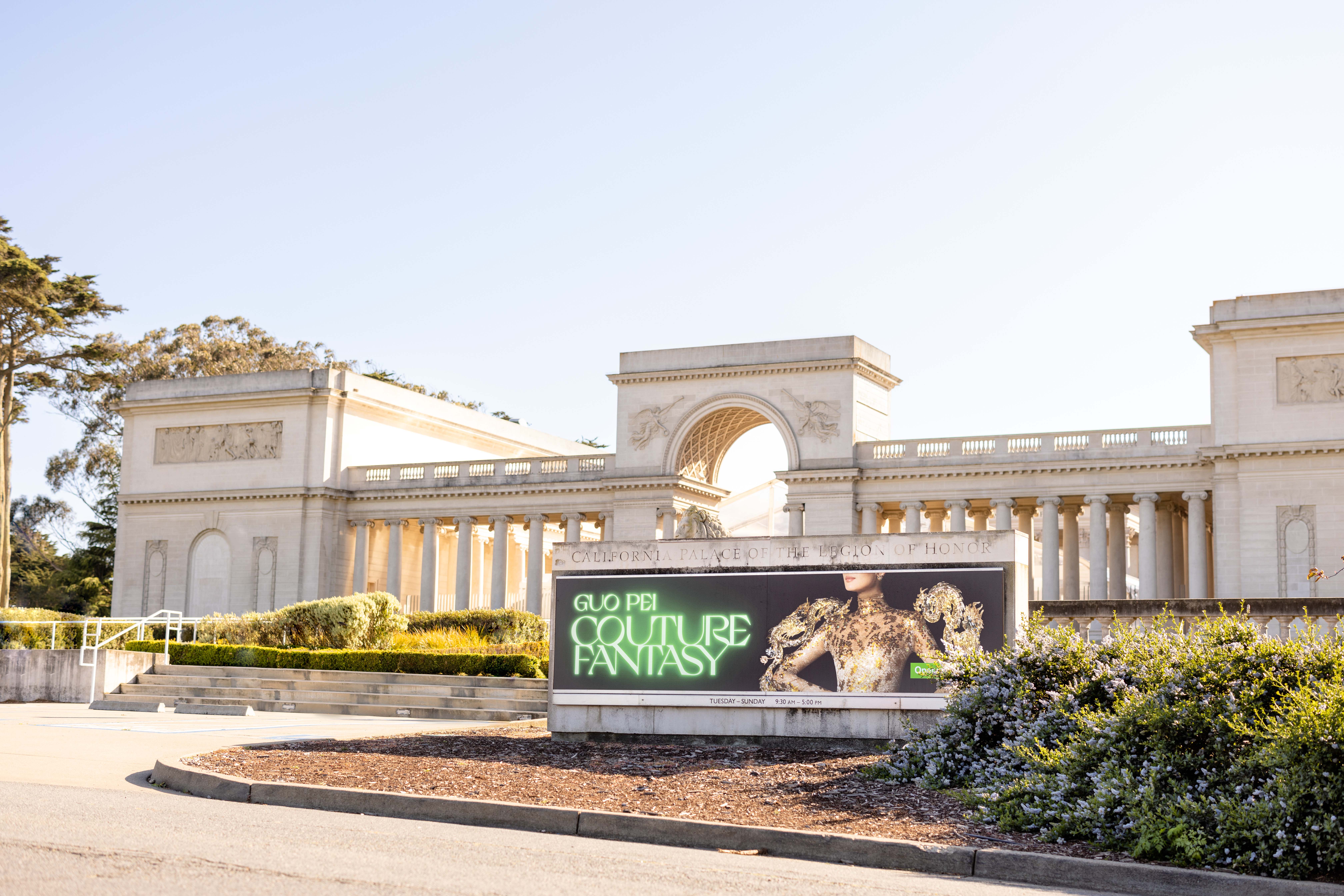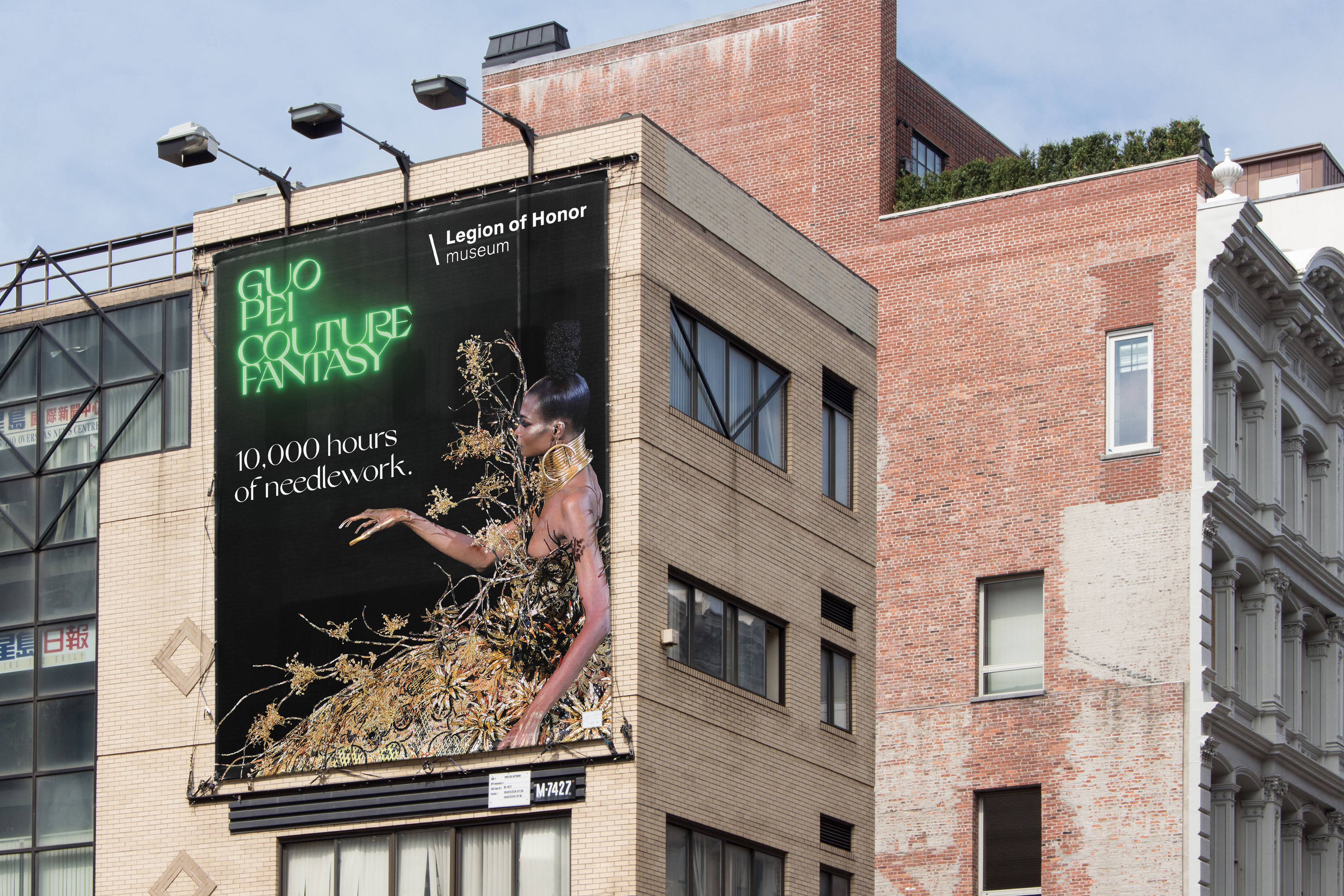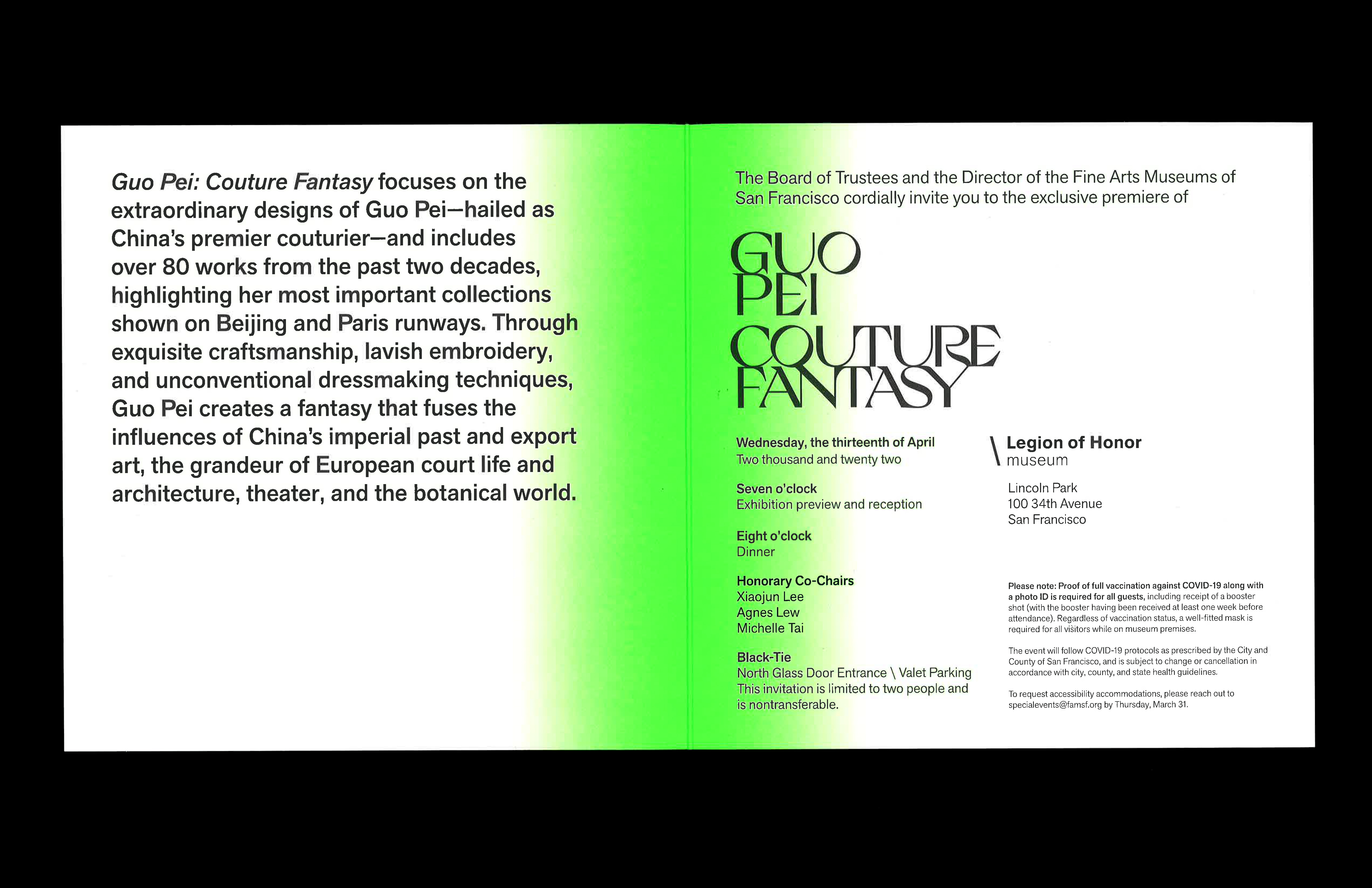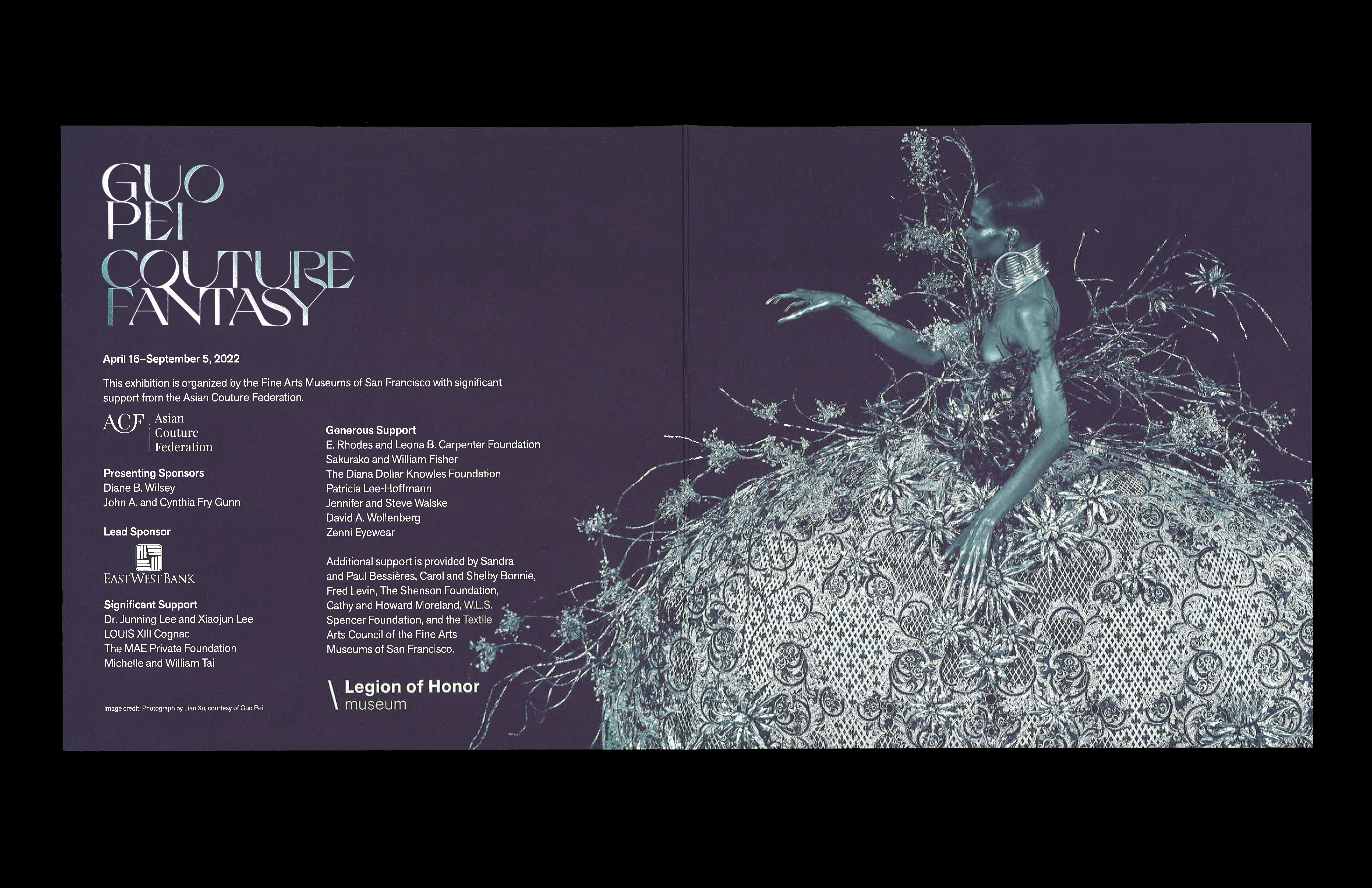 Grand Slang is used for the identity of Guo Pei: Couture Fantasy, an exhibition at the Legion of Honor museum that charts the trajectory of Guo Pei’s career as a leader in the fashion world in the early twenty-first century. Through exquisite craftsmanship, lavish embroidery, and unconventional dressmaking techniques, Guo Pei creates a fantasy that fuses the influences of China’s imperial past, decorative arts, European architecture, and the botanical world.