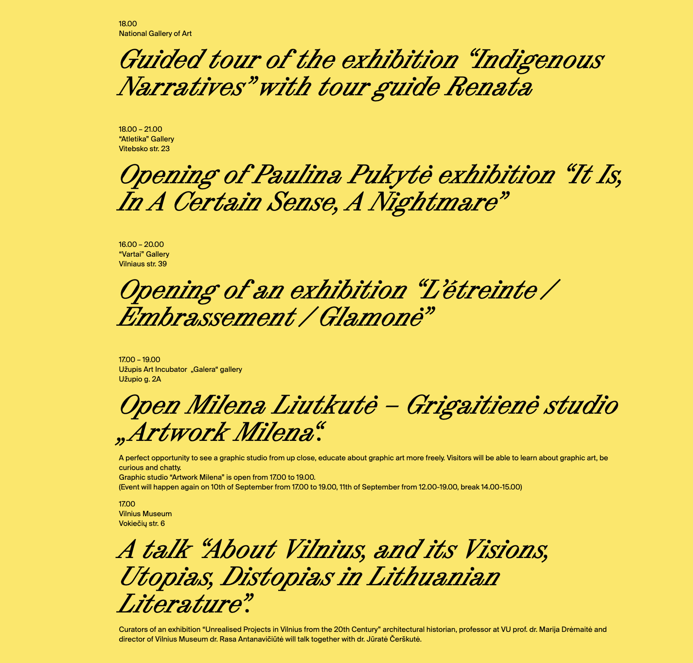 Returning for the sixth time, Vilnius Gallery Weekend hosted citizens and tourists at more than 30 art spaces between the 9th and 12th of September. During the weekend, audiences in Vilnius were participating in exhibition openings, tours, educational programmes, audio performances, meetings with the artists, and discussions.