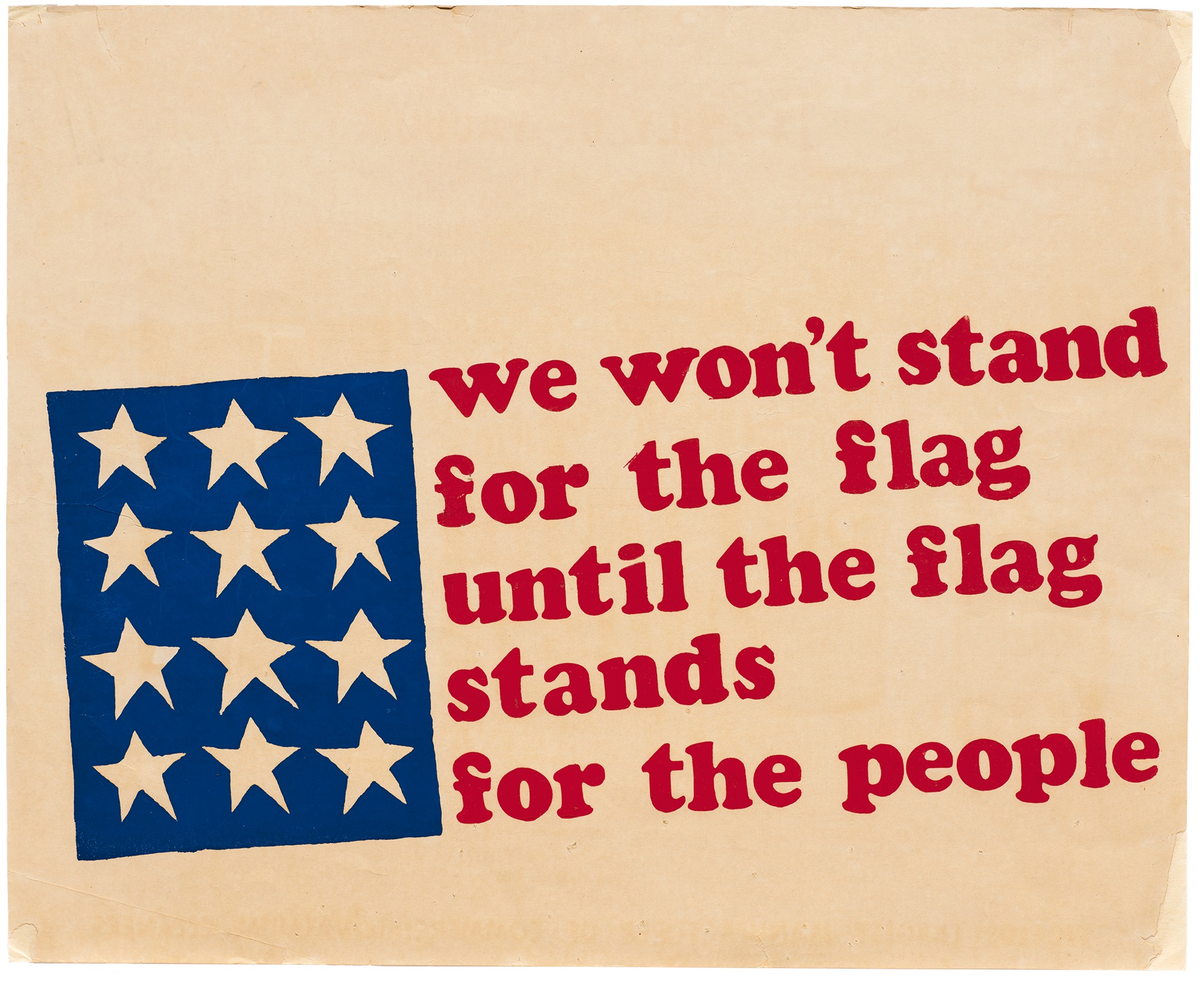 The hand-cut letters of “We won’t stand…” are based on Cooper Black, a typeface frequently seen in both commerce and counterculture. Lowercase text disrupts the traditionally even height of the flag’s stripes, while the ragged right edge adds a tattered effect. The repeating lettershapes on an uneven baseline, and flipped w in “won’t”, indicate that the source of the letters was transfer type or photographic reproduction, rather that hand lettering.