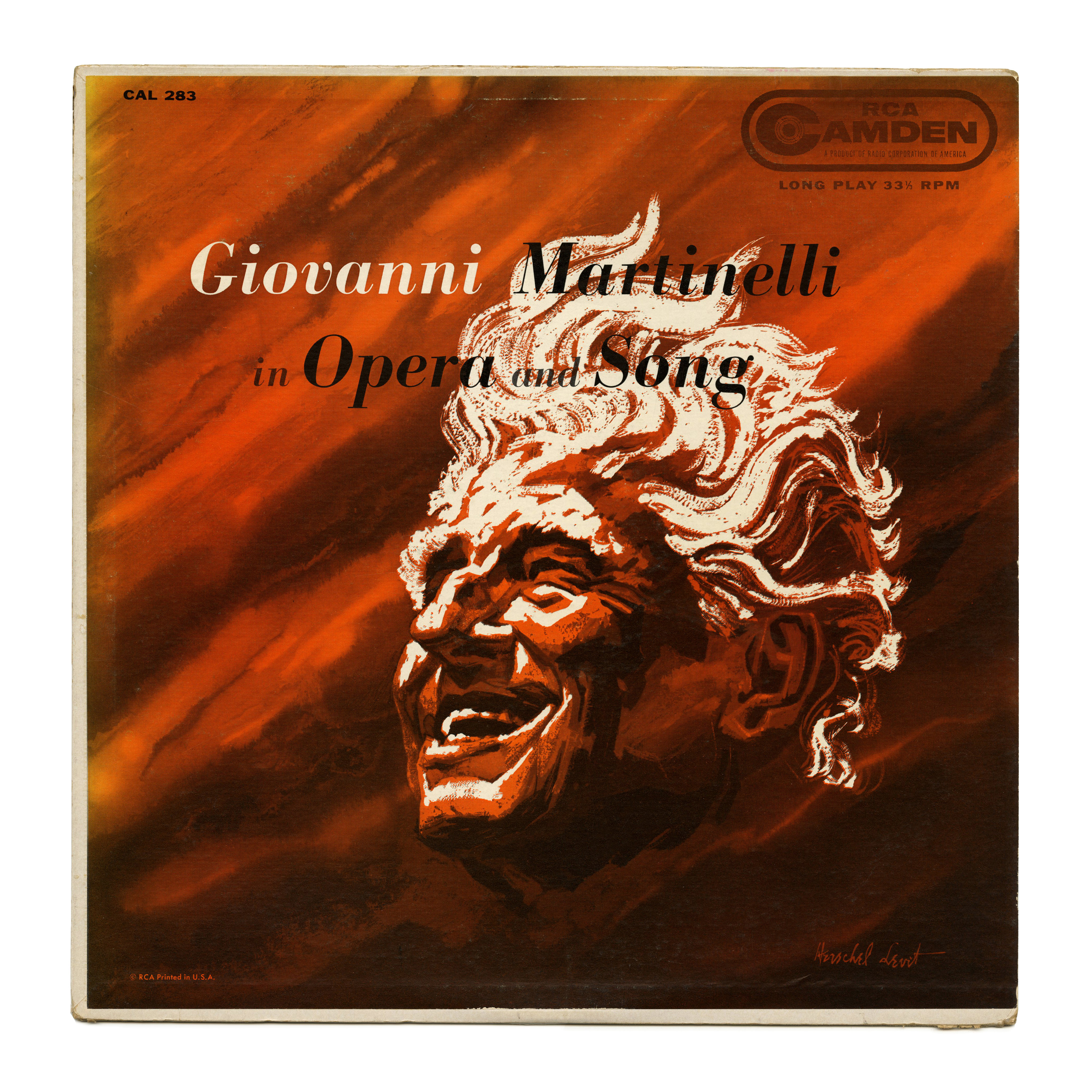 Bodoni Italic in use for In Opera and Song, an album with music by Italian operatic tenor Giovanni Martinelli (1885–1969), released by RCA Camden, a budget label of RCA Victor, in 1956 [Callahan]. The cover illustration is by Herschel Levit (1912–1986).