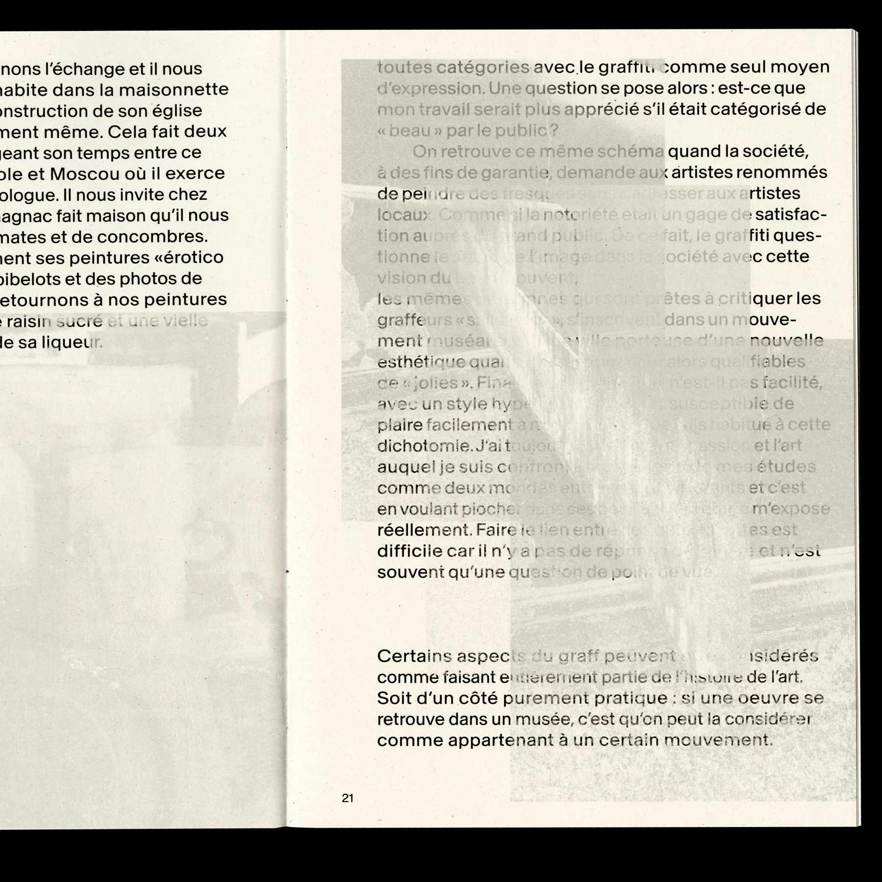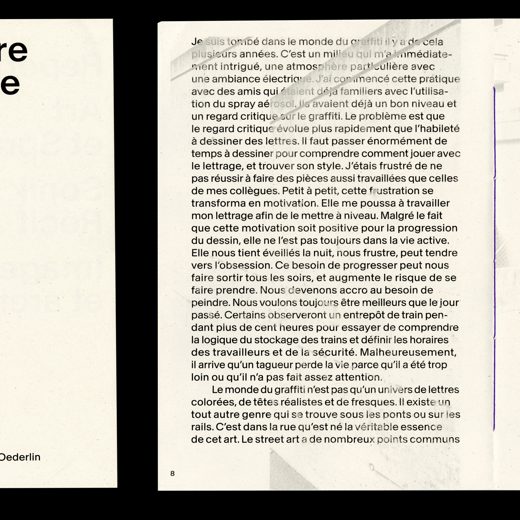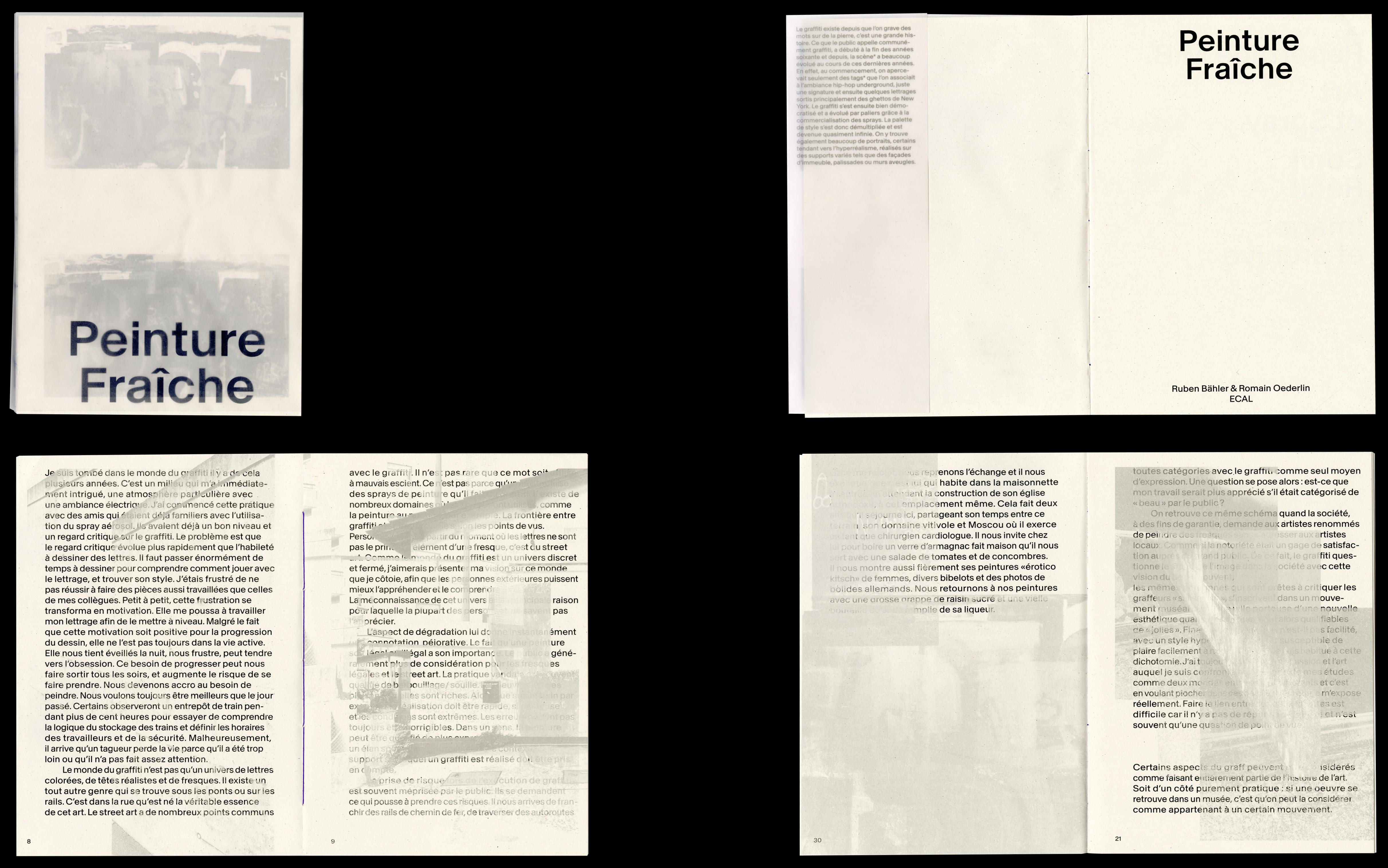 Peinture Fraîche (“fresh paint”) is a book about graffiti designed by Ruben Bähler and Romain Oederlin. It was made as an editorial student project at ECAL. Baikal typeface in use, designed by Ian Party for newglyph.
