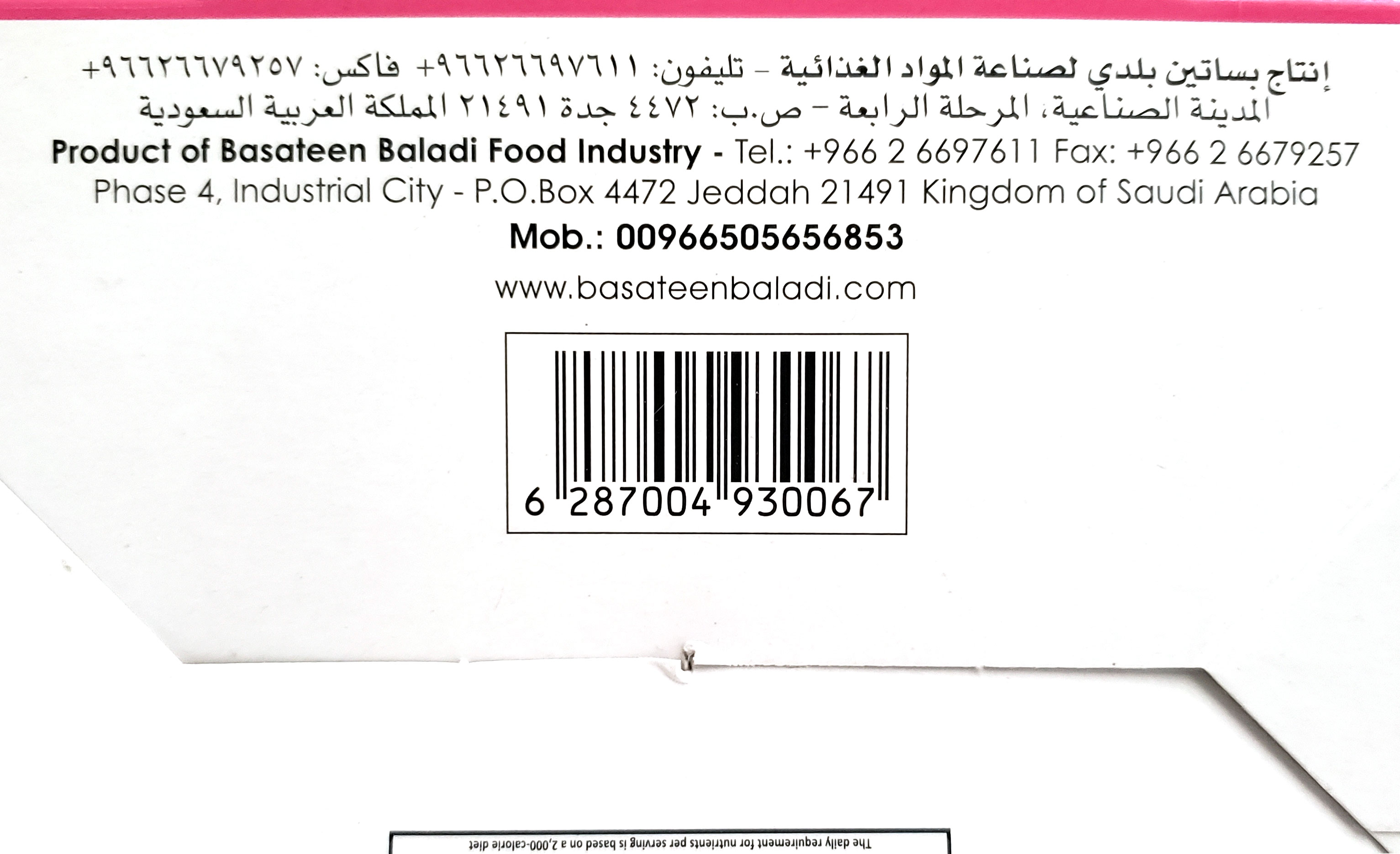 The wafer biscuits are produced by Basateen Baladi Food Industry, Jeddah, Kingdom of Saudi Arabia. The font used for the company name, بساتين بلادي (Basateen Baladi) is unidentified.