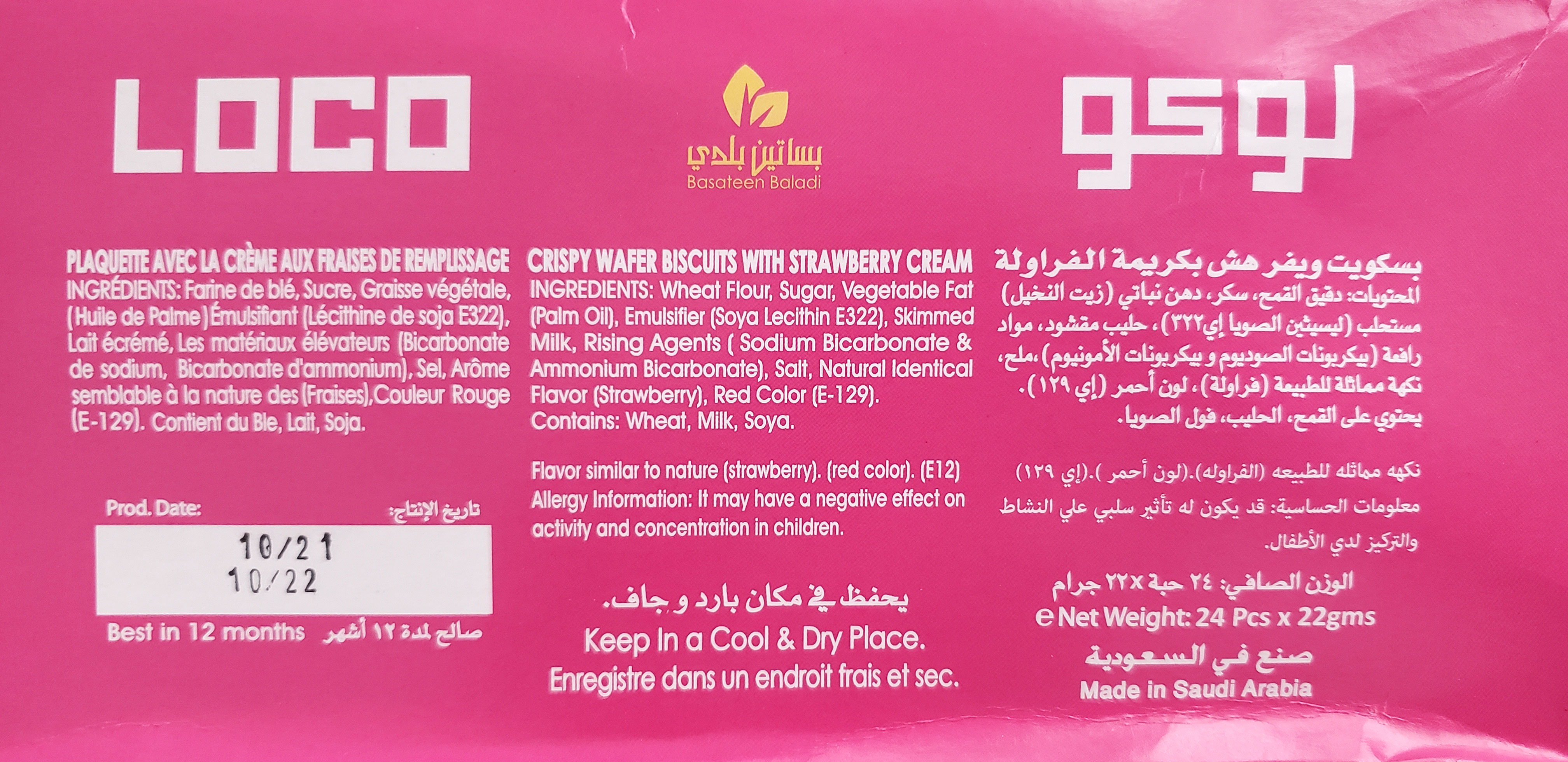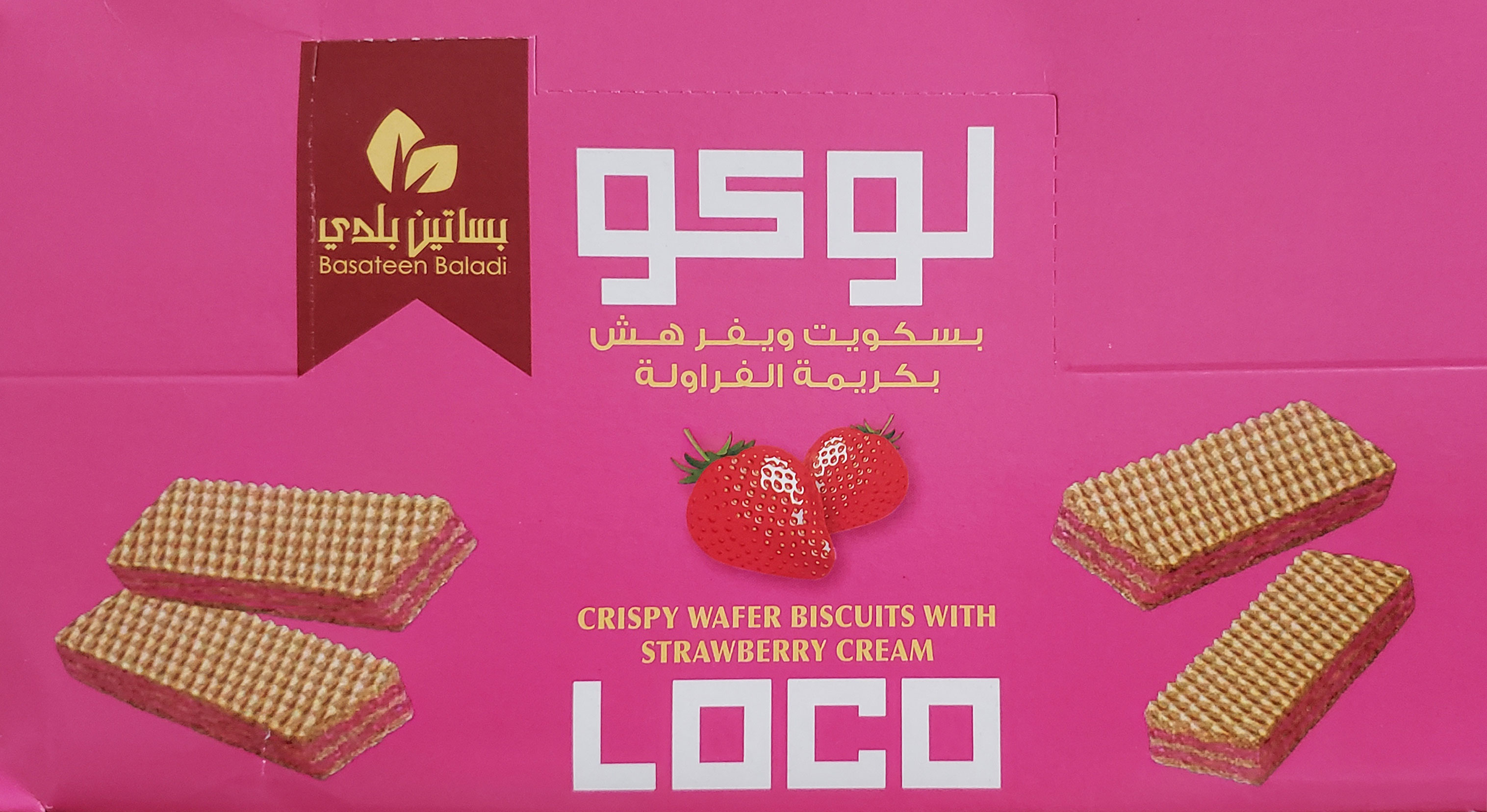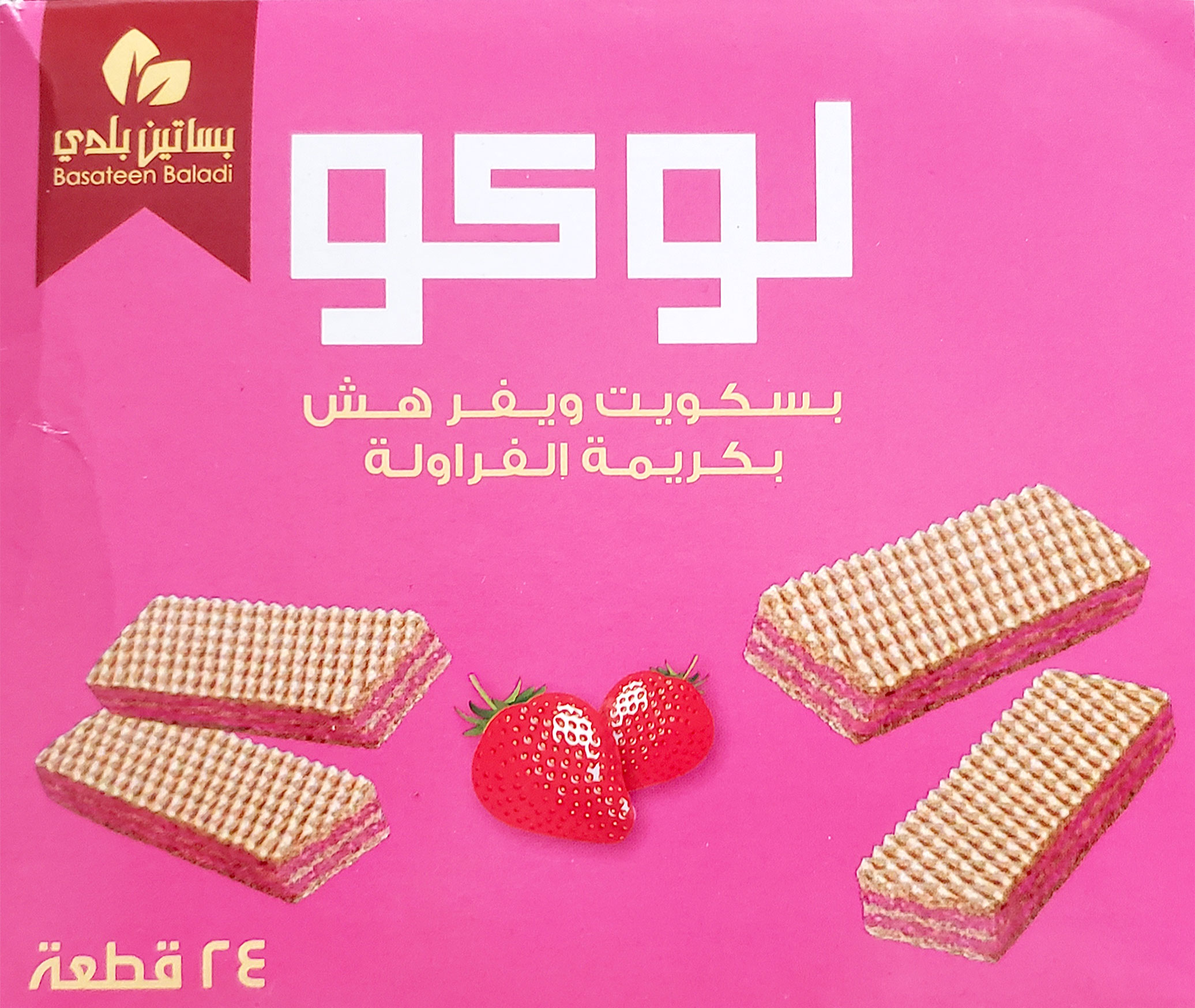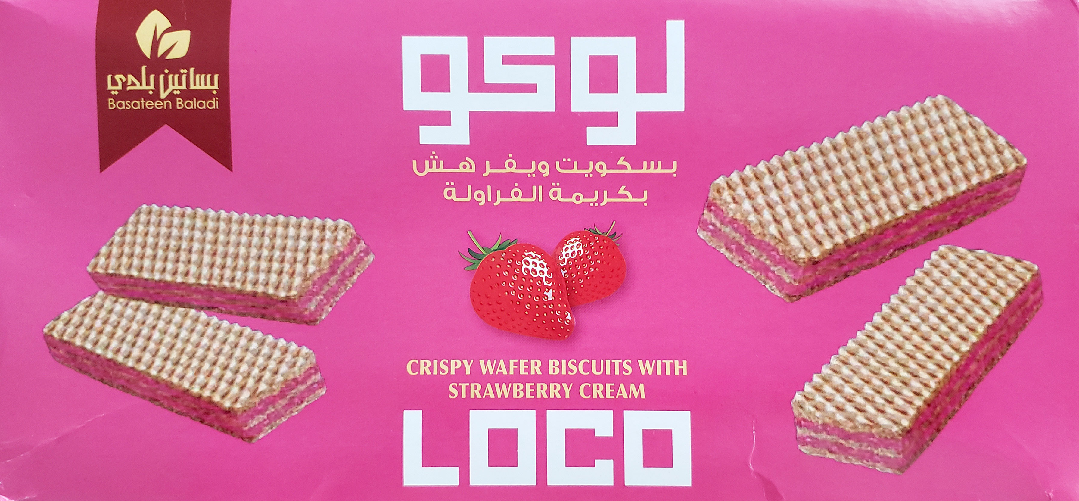 The name of this crispy wafer biscuits with strawberry cream, لوكو , is written using Zawiya Bold. The Latin equivalent, Loco, appears to use matching lettering. The product description is set in Boutros GE SS Two (Arabic) and Optima Bold (English), with various other fonts used for the trilingual list of ingredients and other small print.