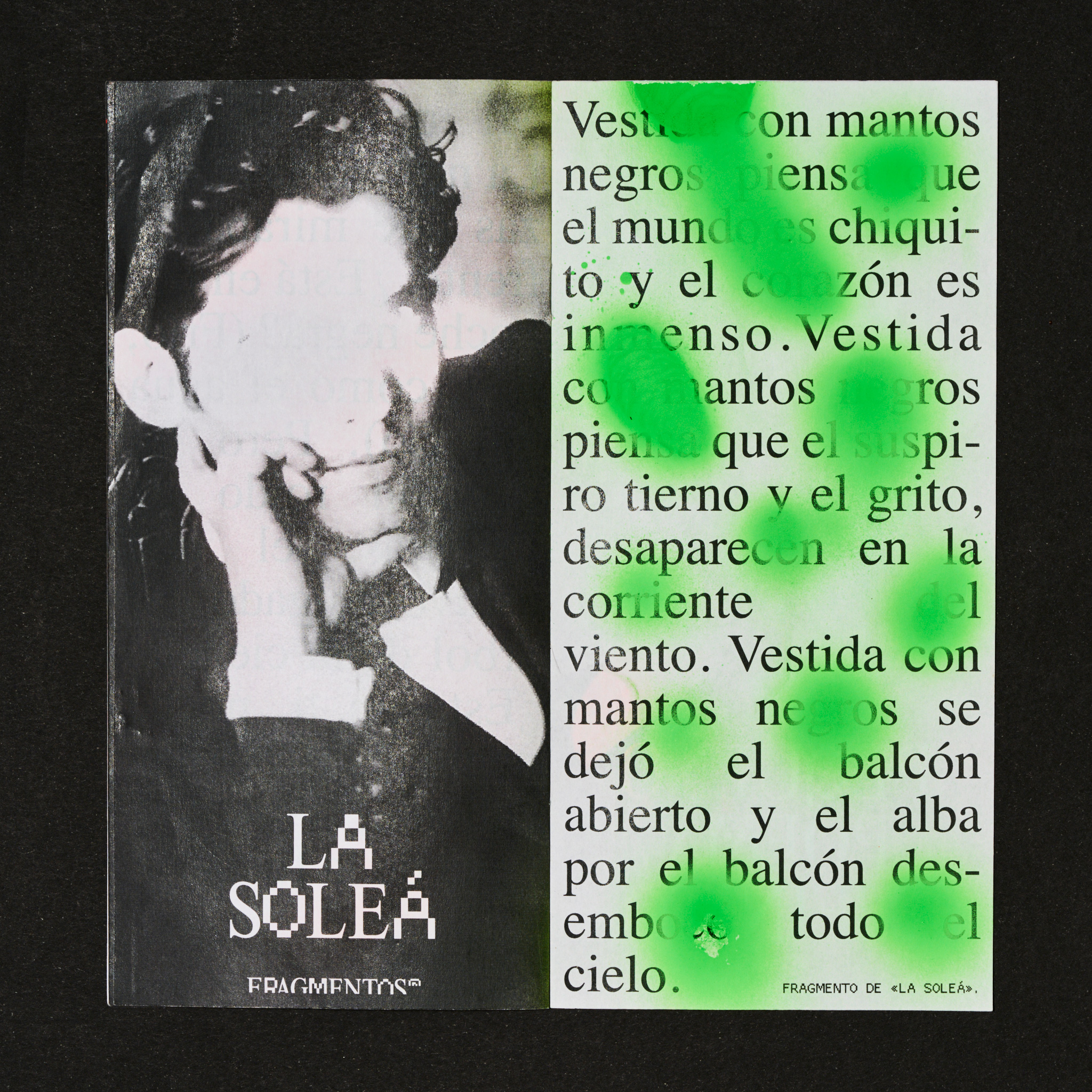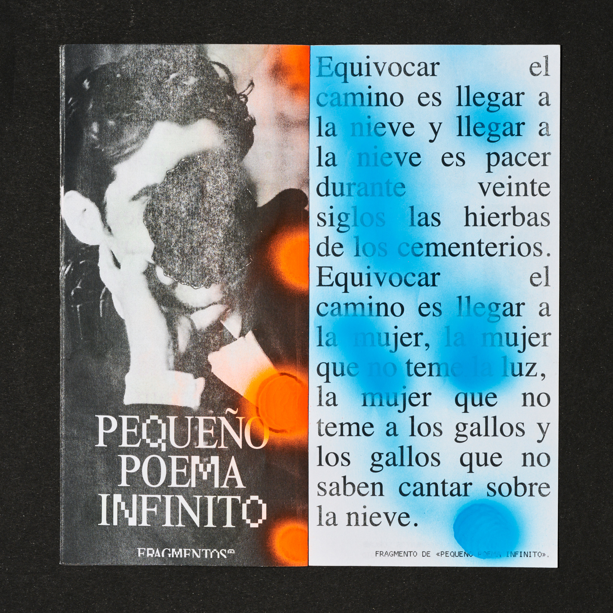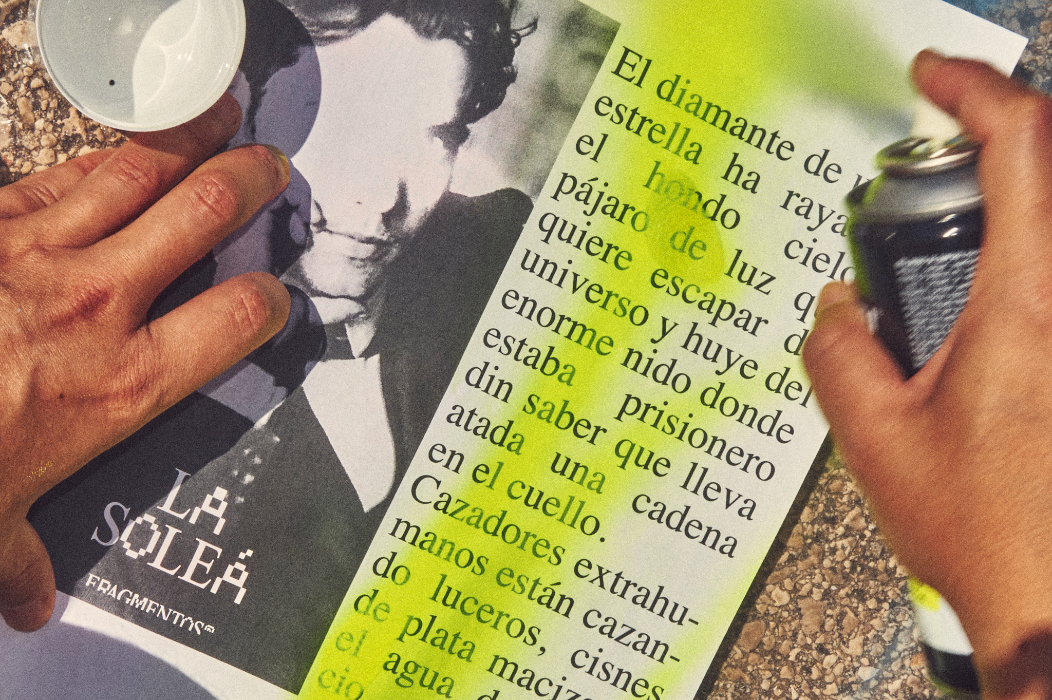 Fragmentos© is a fanzine conceptualized, designed and self-published by creative studio errorerror.studio® that brings together five incomplete poems of Lorca for an incomplete reading. They want to express the feeling that remains when you cannot fully enjoy an artist, especially when his life has been taken from us too soon. Through the intervention of the photography of Lorca with the scanner and of the libretto with spray paint, the studio wants to make the reader uncomfortable, just as it happens with the frustration due to the early loss of the author.